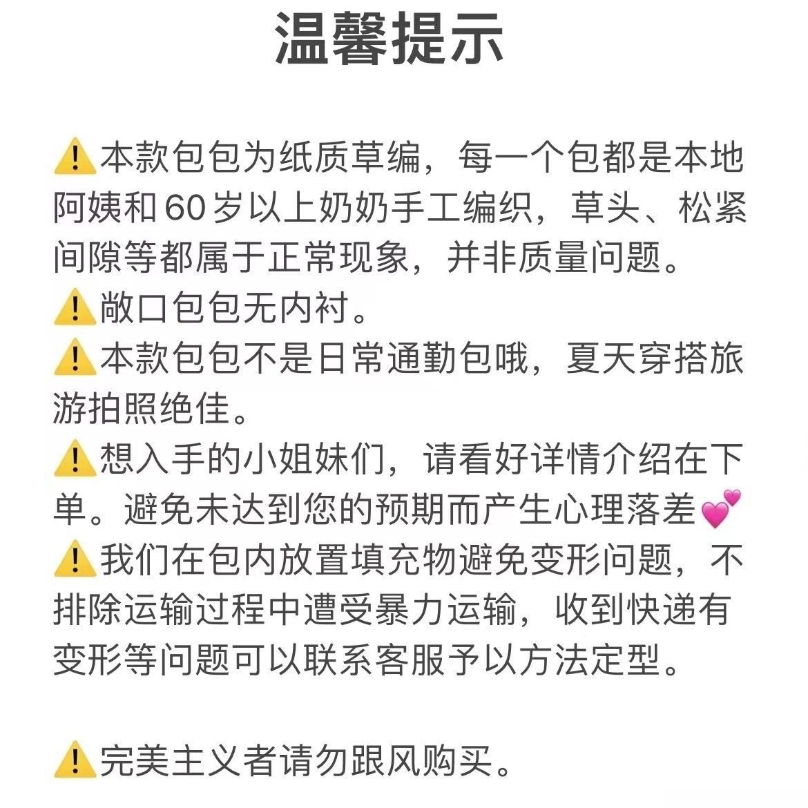 此款包包纯手工编织,手工编织产品存在一定的误差,我们尽量去保证产品缩减误差,保证产品质量。