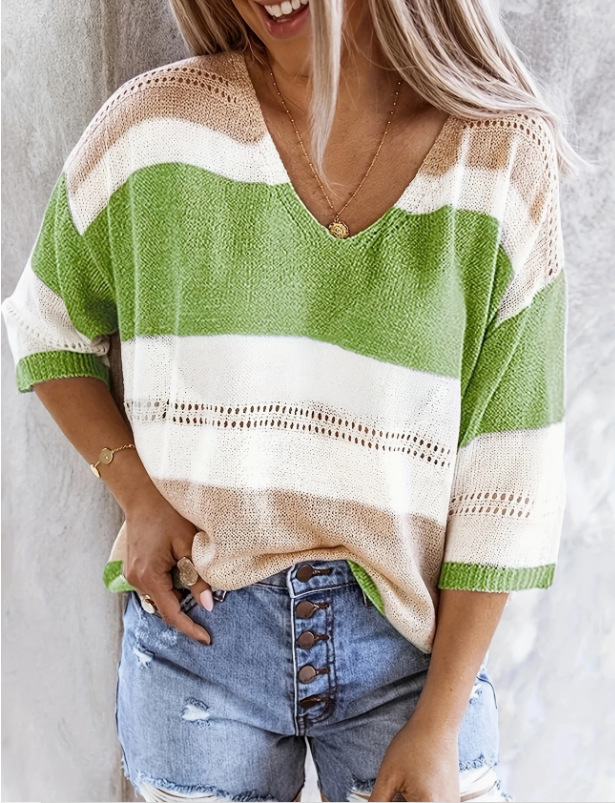 2024 년 여름 뉴 비치 니트 스웨터 탑 아마존 유럽과 미국 스트라이프 컬러 매칭 할로우 스웨터