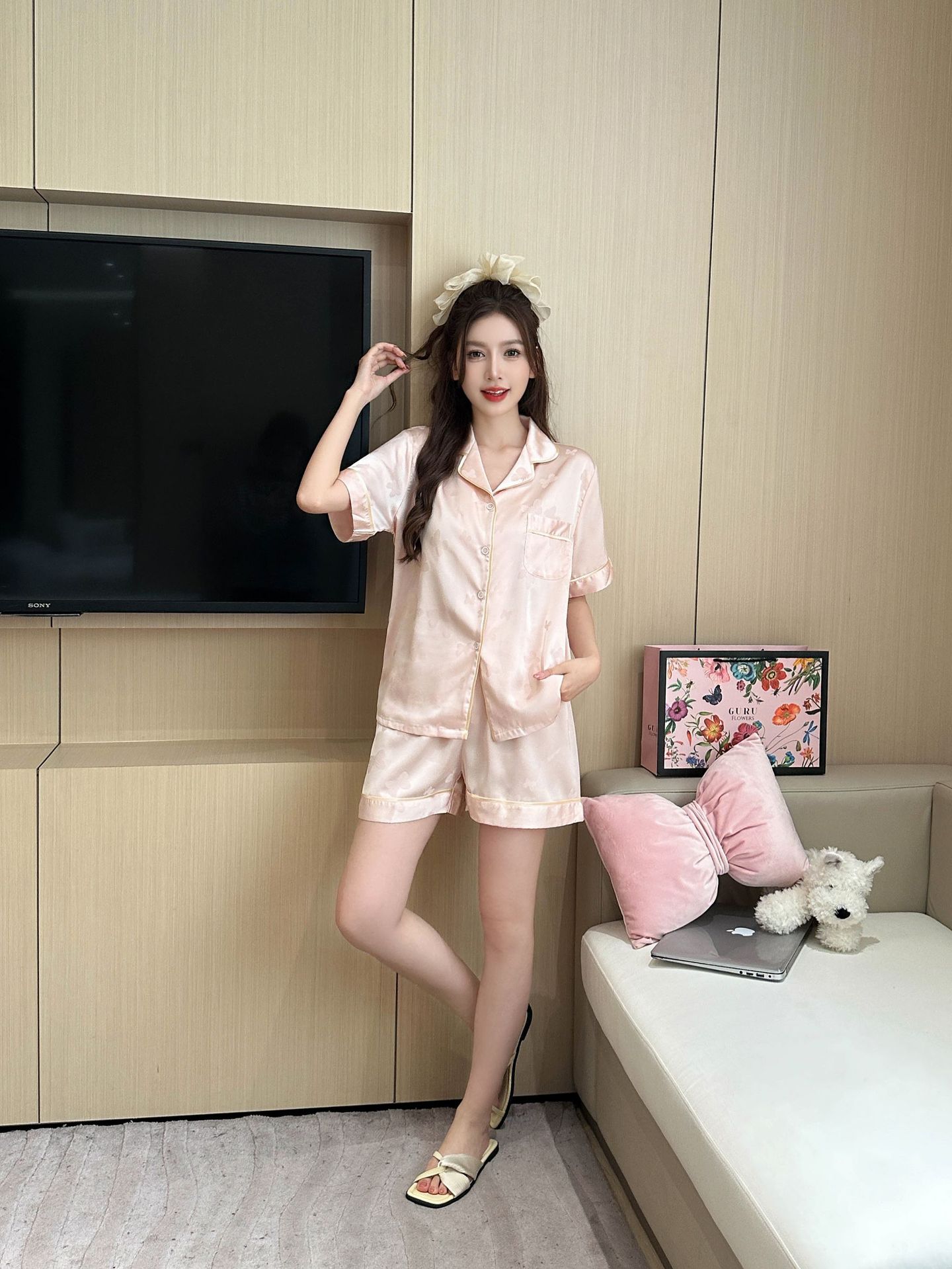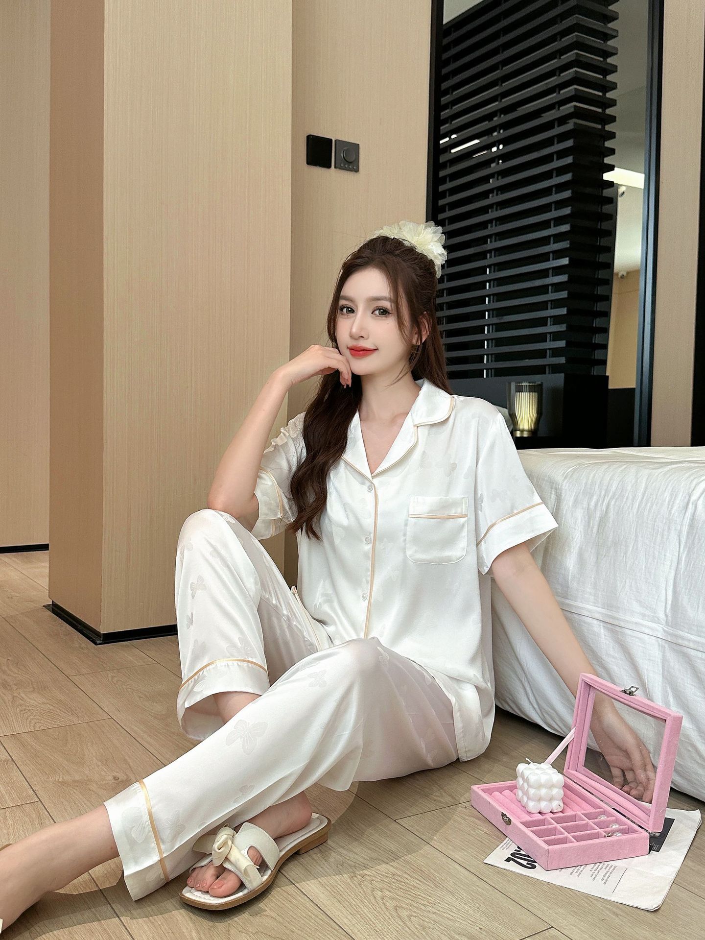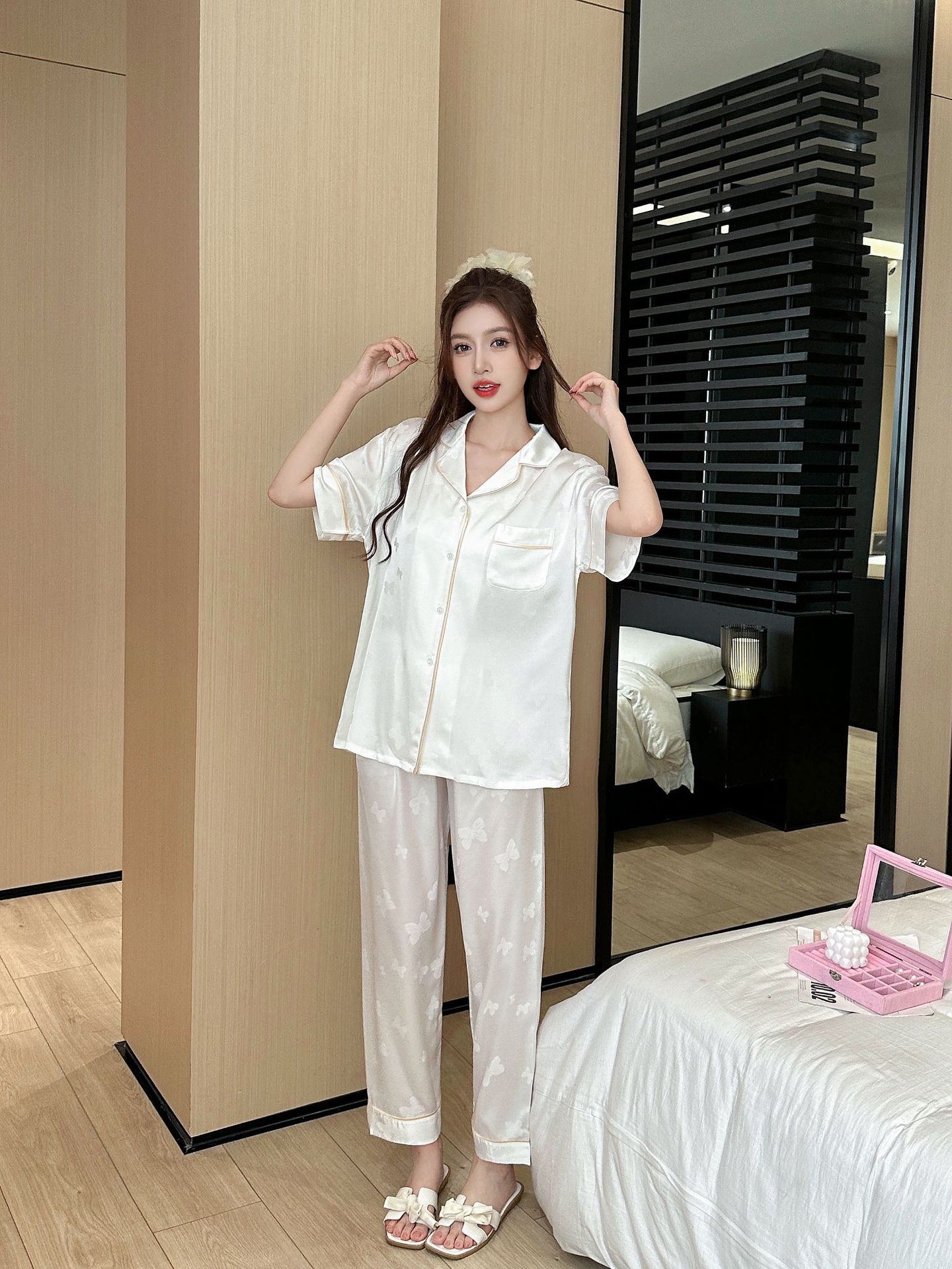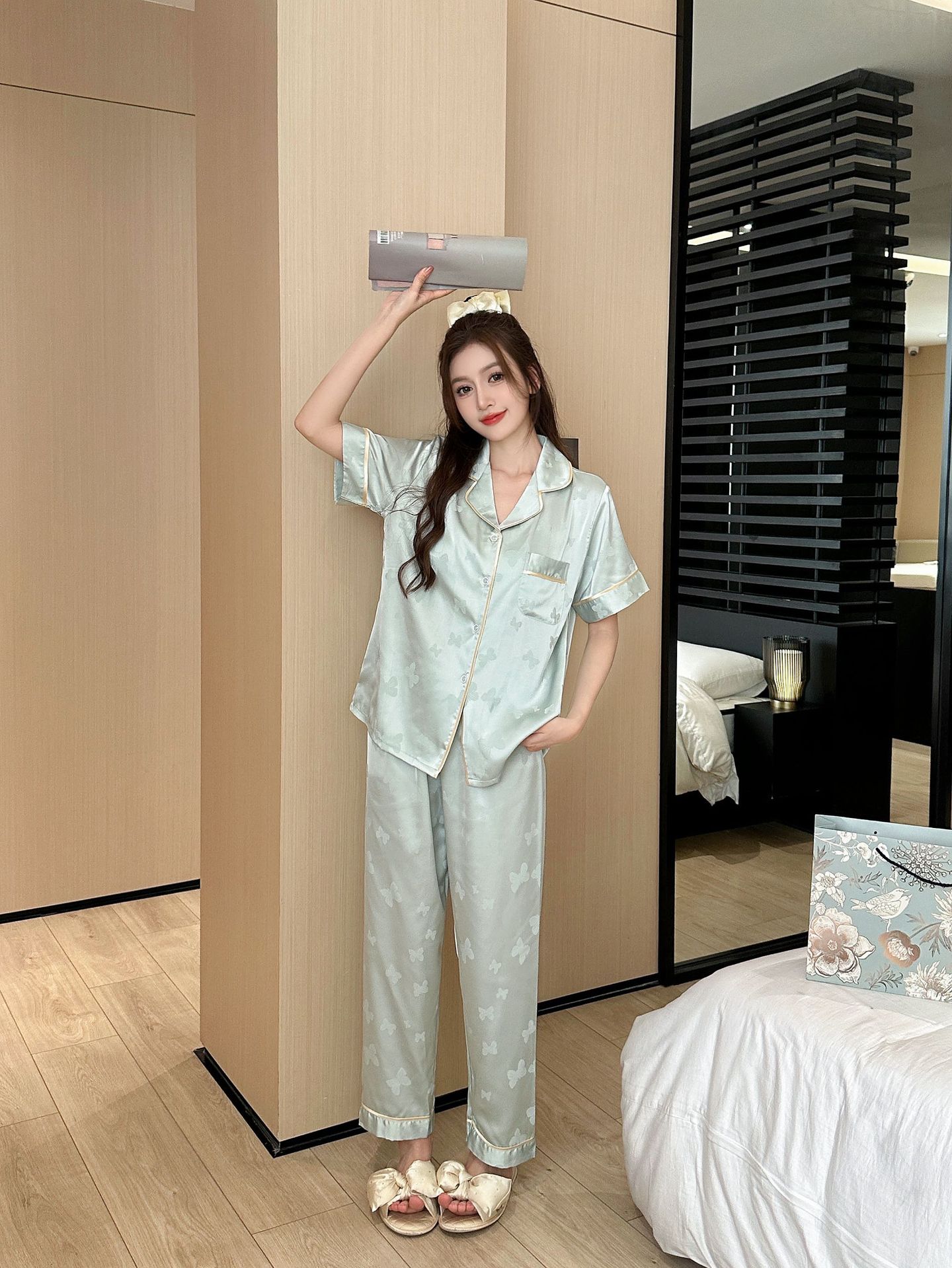 3 피스 잠옷 여성의 봄과 가을 아이스 실크 나비 자카드 홈 옷 여름 얇은 옷 세트 가을 3351스토어 가기