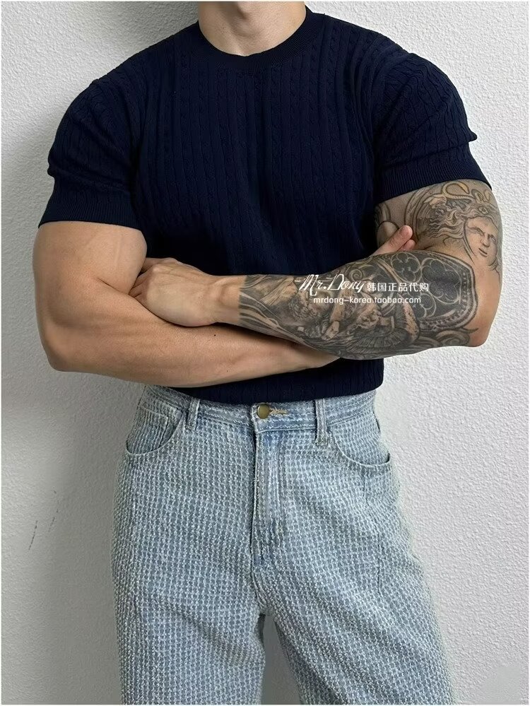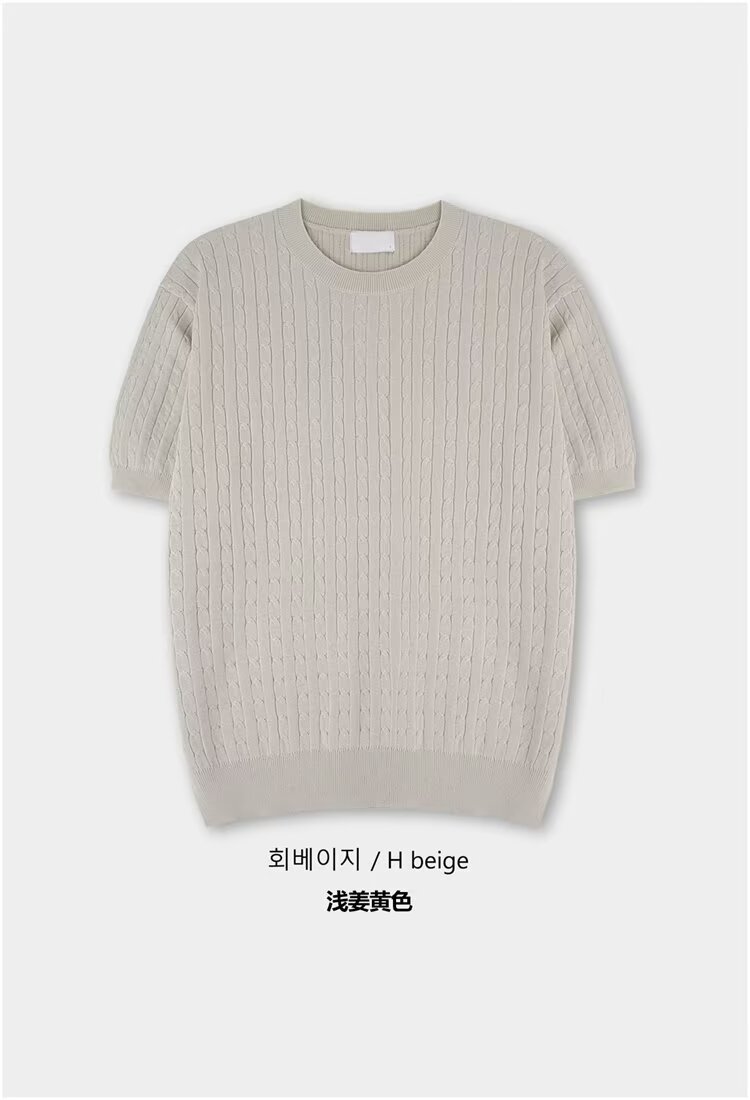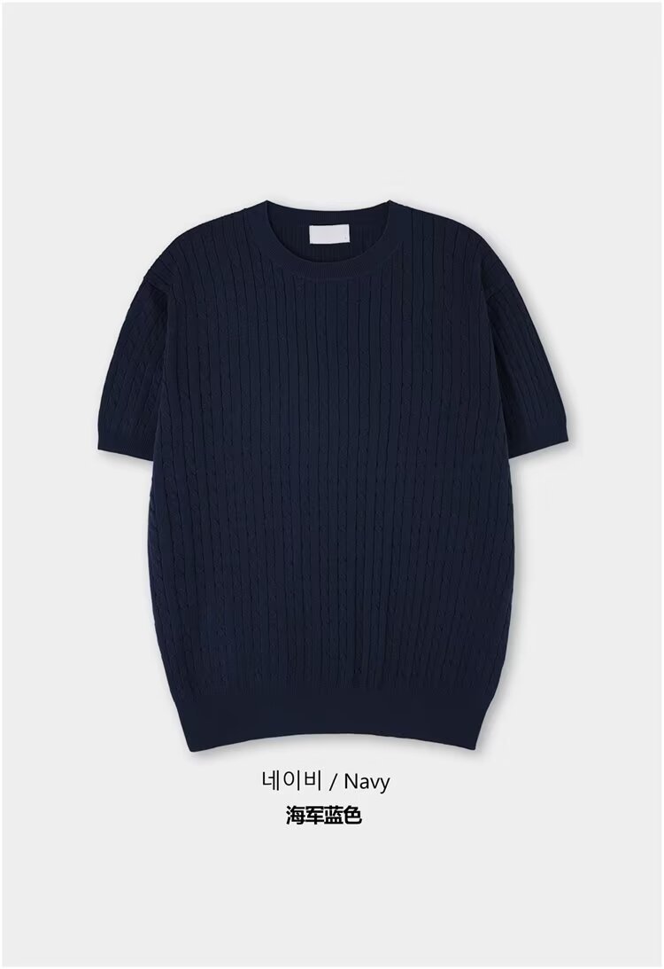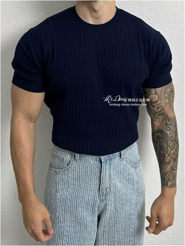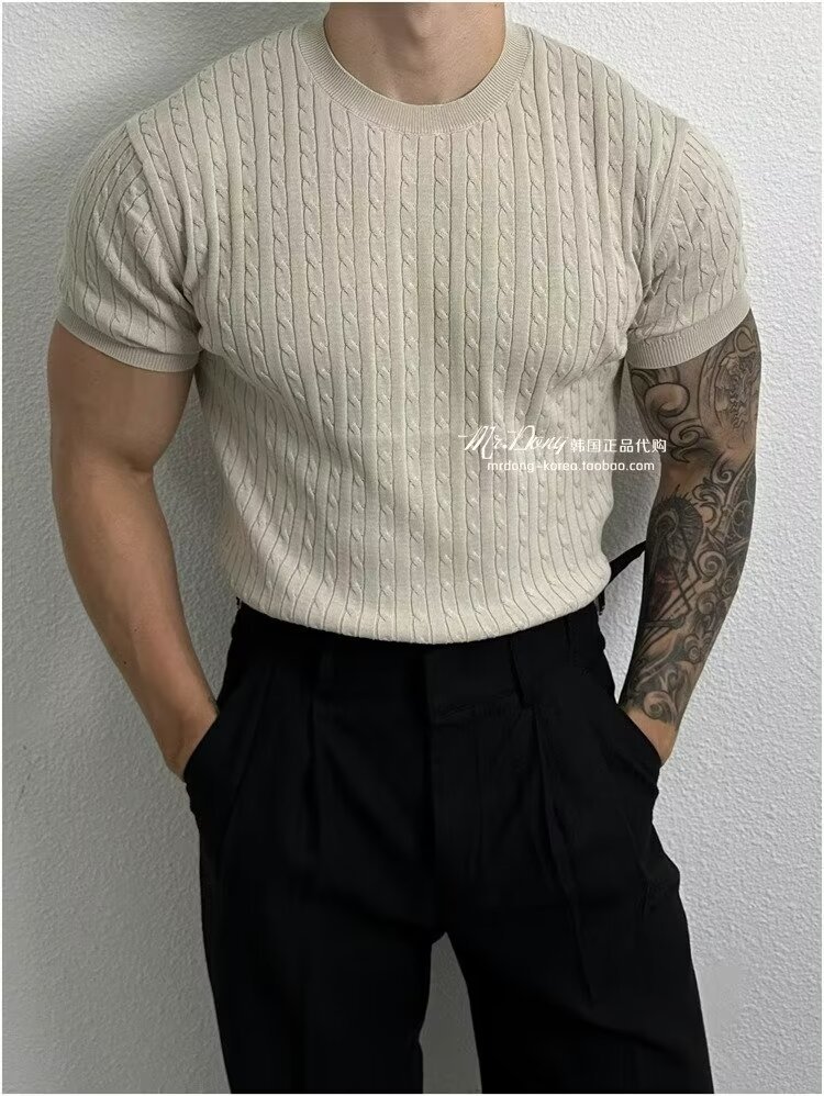2024 홍콩 스타일 새로운 도착 스웨터 남자 반팔 슬림 핏 크루 넥 스트라이프 솔리드 컬러 베이스 레이어 스웨터 스웨터