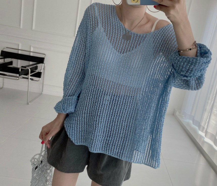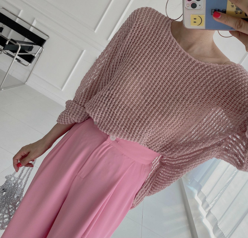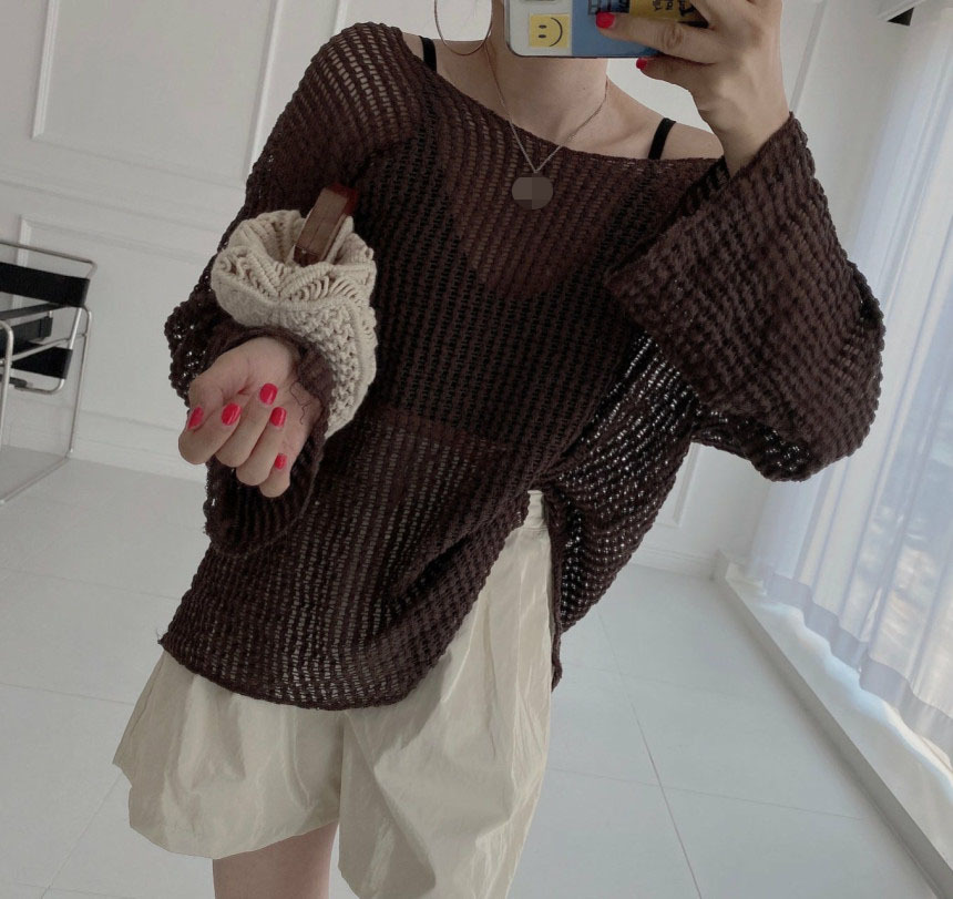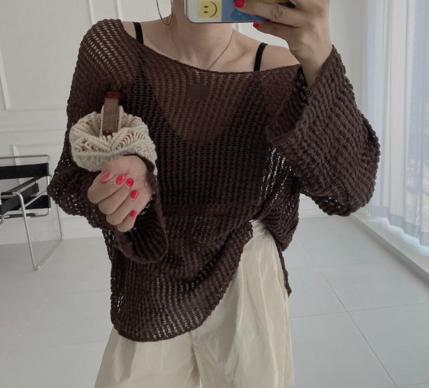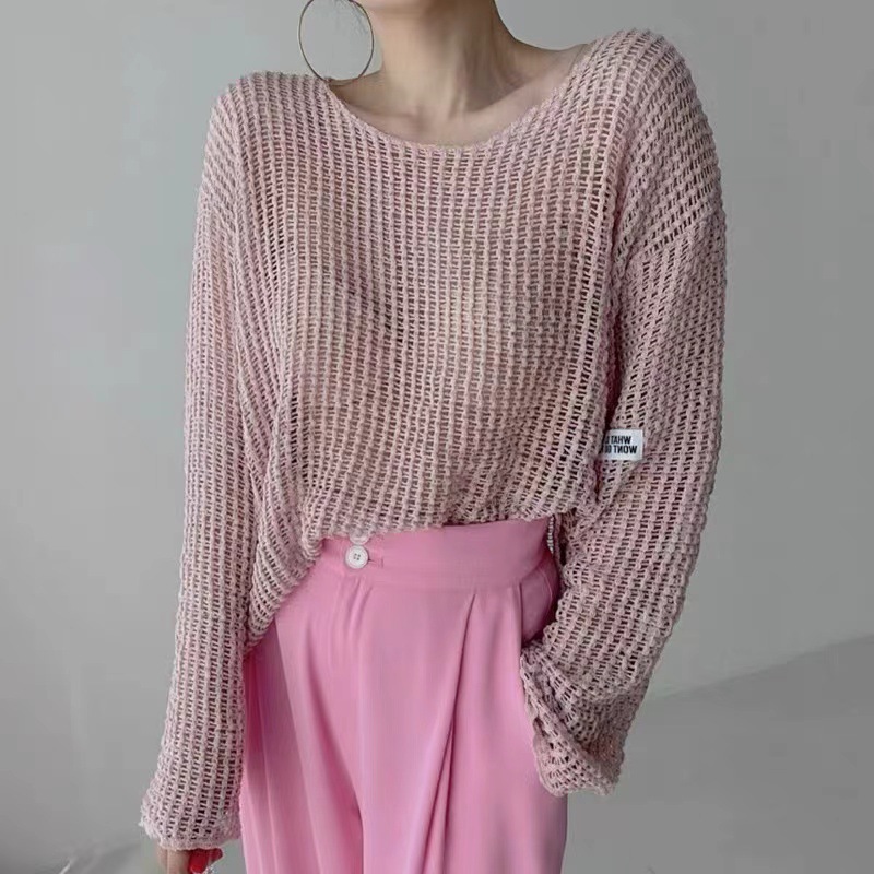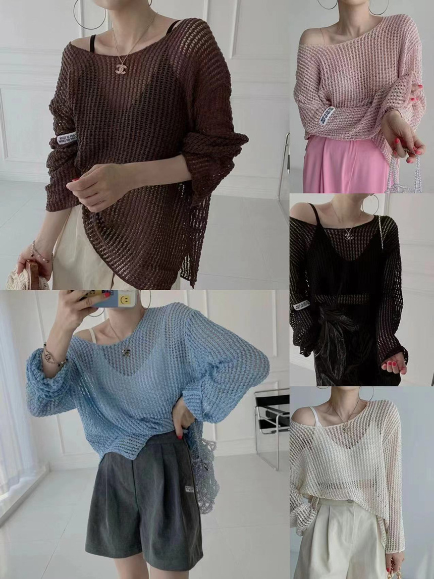 한국 2024 여름 간단한 라운드 넥 풀오버 루즈 탑 얇은 할로우 아웃 선 스크린 니트 블라우스 여성