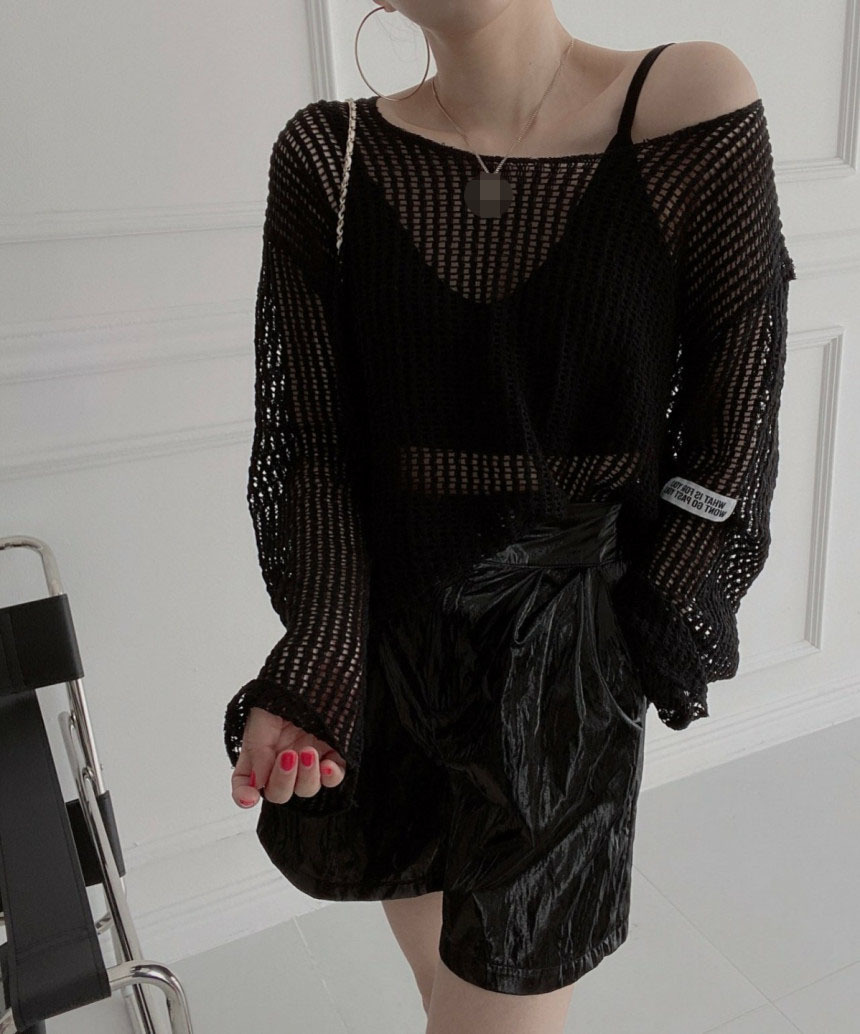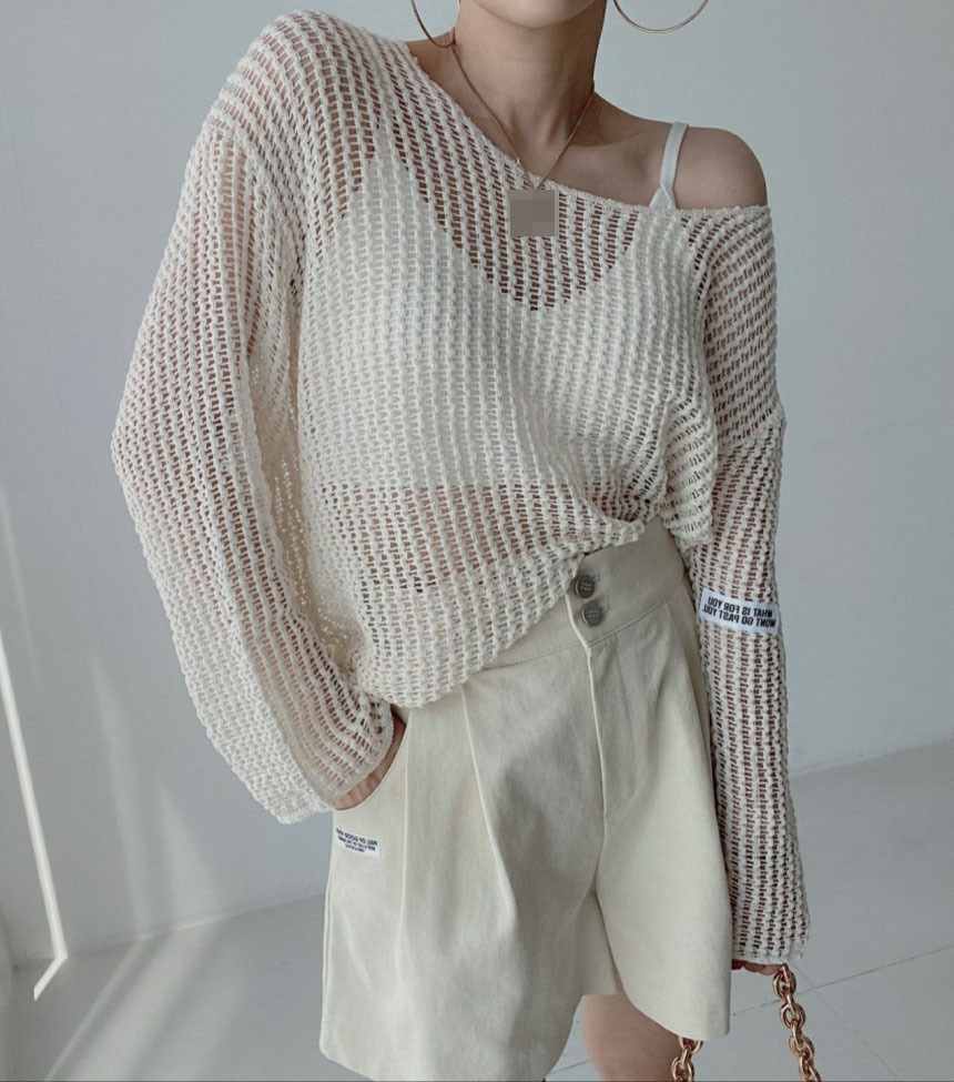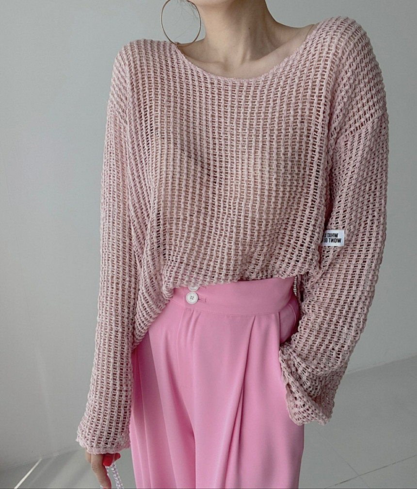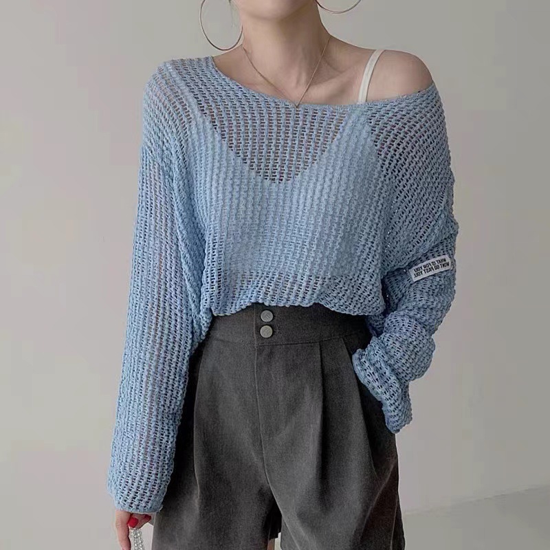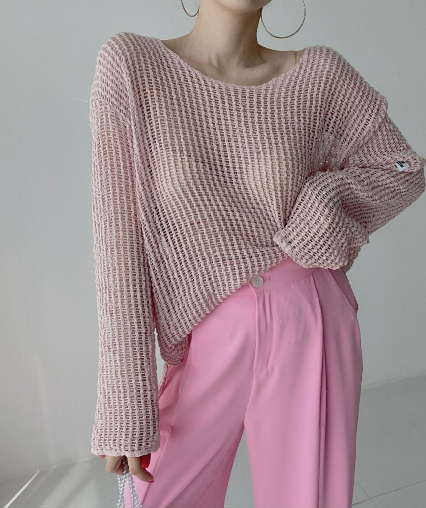 한국 2024 여름 간단한 라운드 넥 풀오버 루즈 탑 얇은 할로우 아웃 선 스크린 니트 블라우스 여성