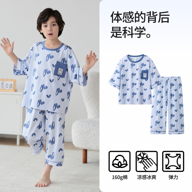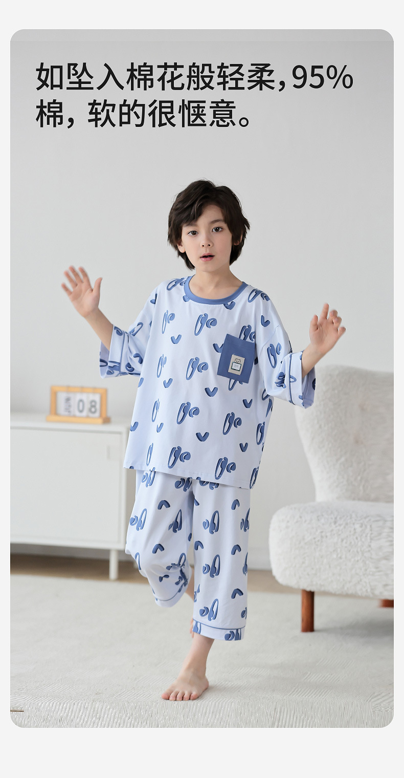 Lulu Niu 2024 여름 어린이 잠옷 소년 순면 세븐-슬리브 소년의 중대형 어린이 여름 얇은 에어컨 옷