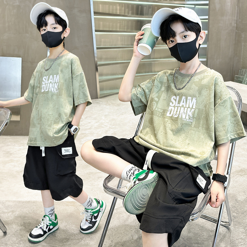 소년 여름 반팔 정장 순수 코튼 2025 새로운 잘 생긴 소년 전체 인쇄 슬램 덩크 중대형 어린이 정장 유행