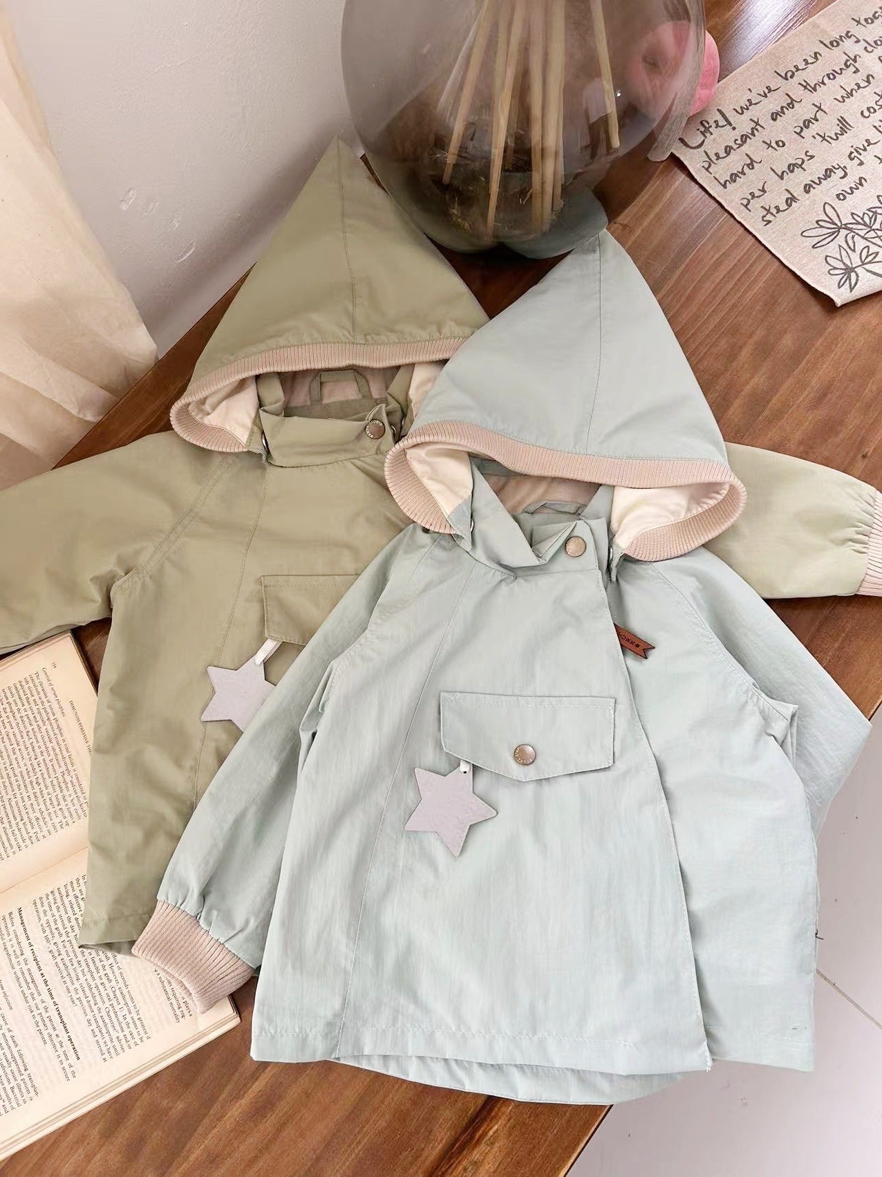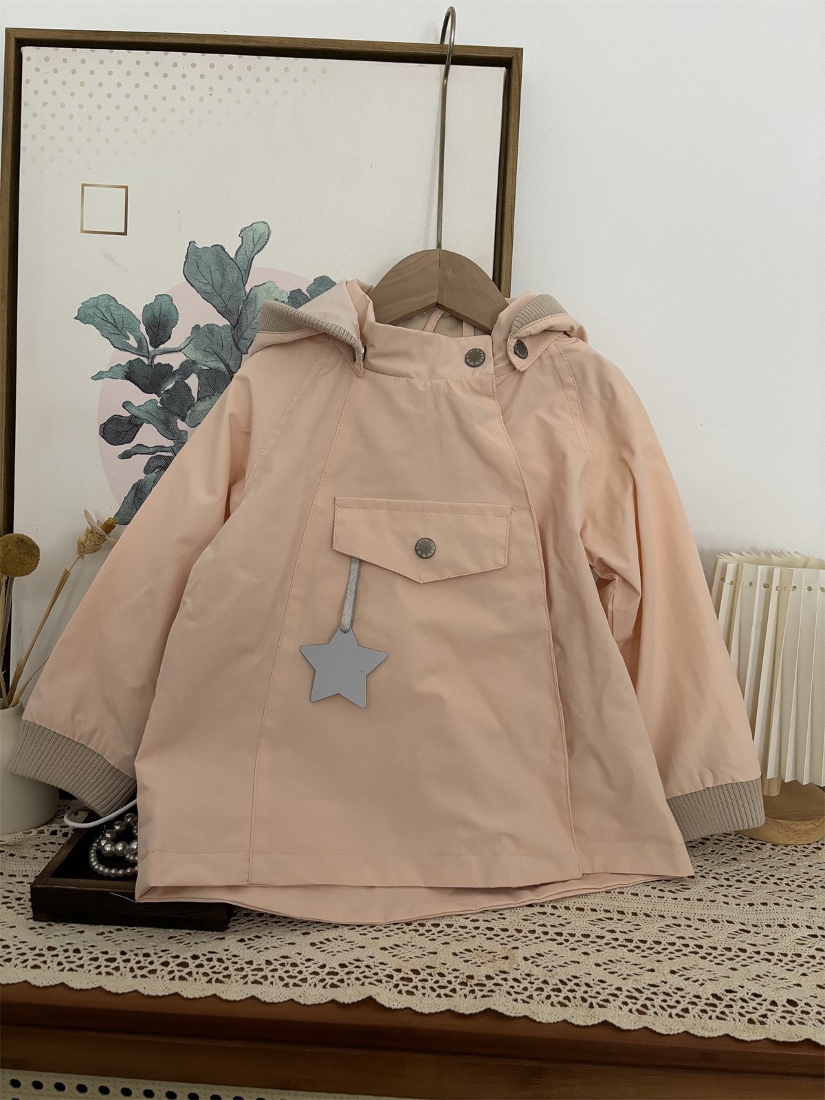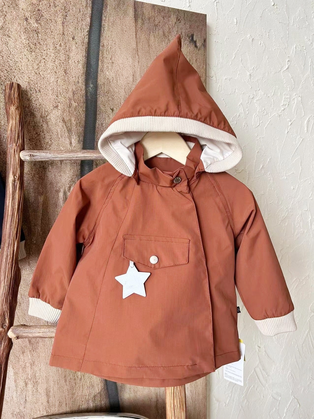 소년과 소녀 엘프 모자 윈드 브레이커 2025 새로운 아기 봄, 가을 매트 엘프 코트 뾰족한 모자 중립 어린이 클립