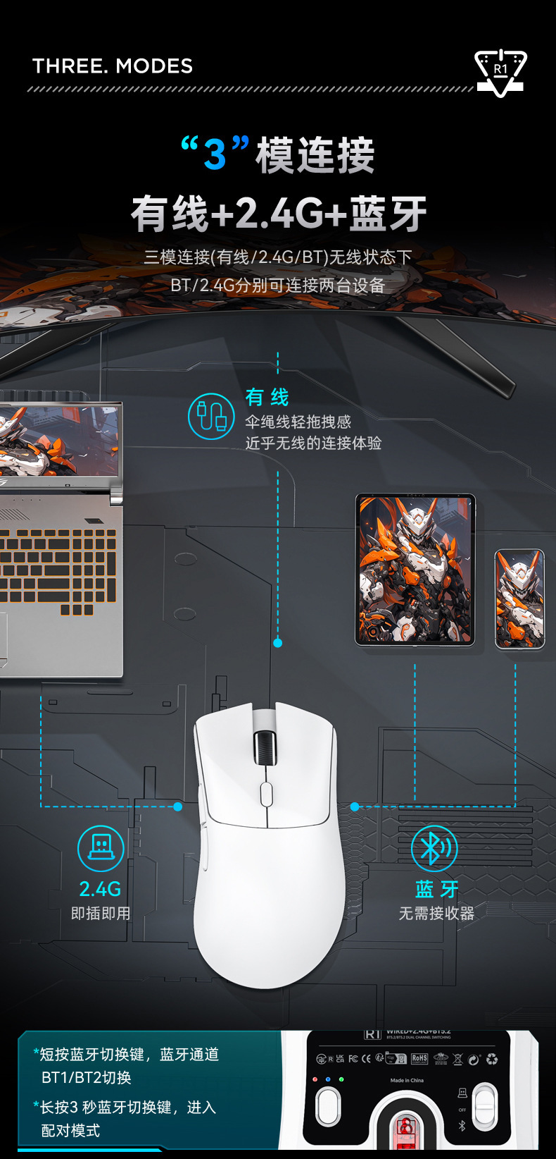 连接方式:2.4G无线+蓝牙5.2+TYPE-C有线