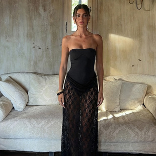 欧美女装2026春夏新款气质性感蕾丝抹胸露背微透网纱纯色连衣裙女