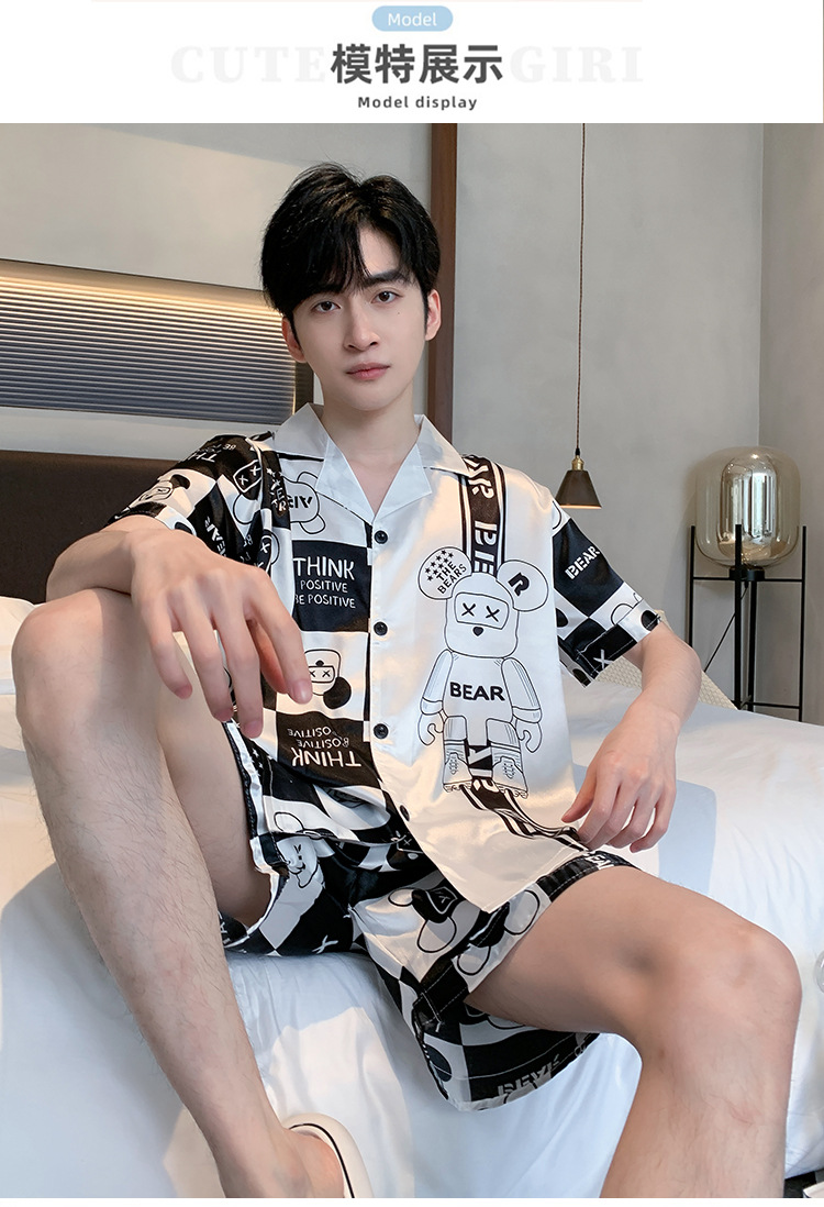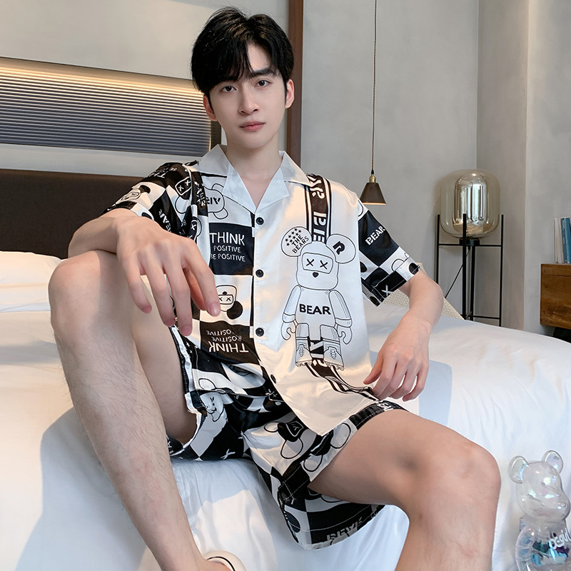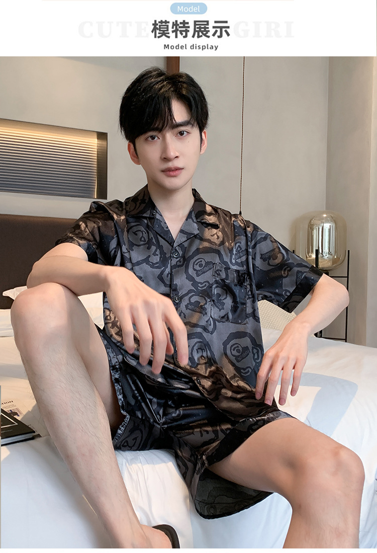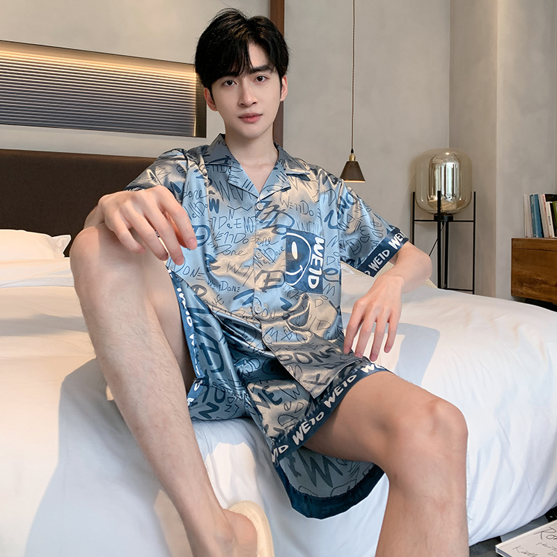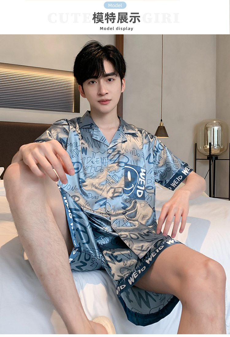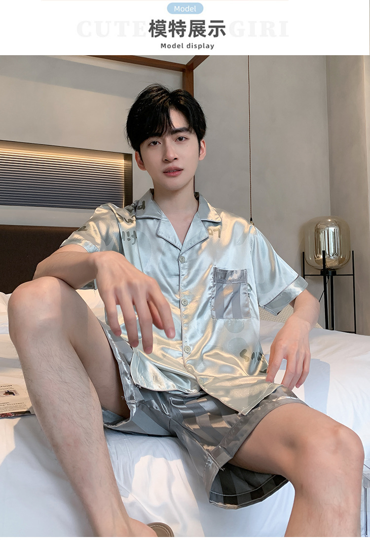 2024 새로운 도착 잠옷 남자 여름 아이스 실크 짧은 소매 반바지 얇은 소년 봄과 가을 청소년 홈 세트스토어 가기