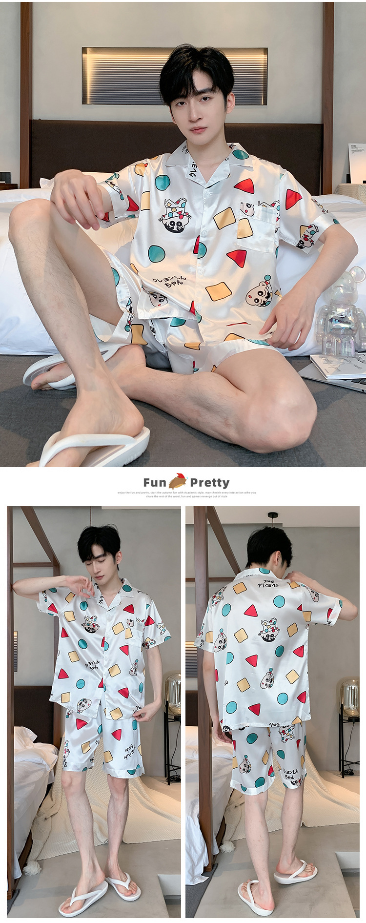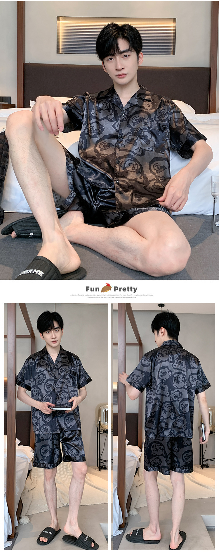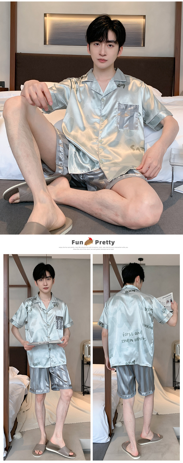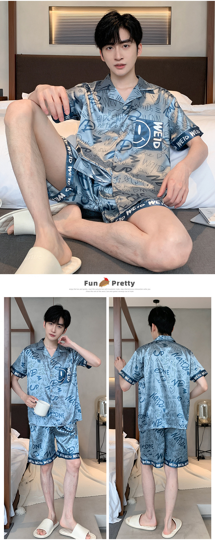 2024 새로운 도착 잠옷 남자 여름 아이스 실크 짧은 소매 반바지 얇은 소년 봄과 가을 청소년 홈 세트스토어 가기