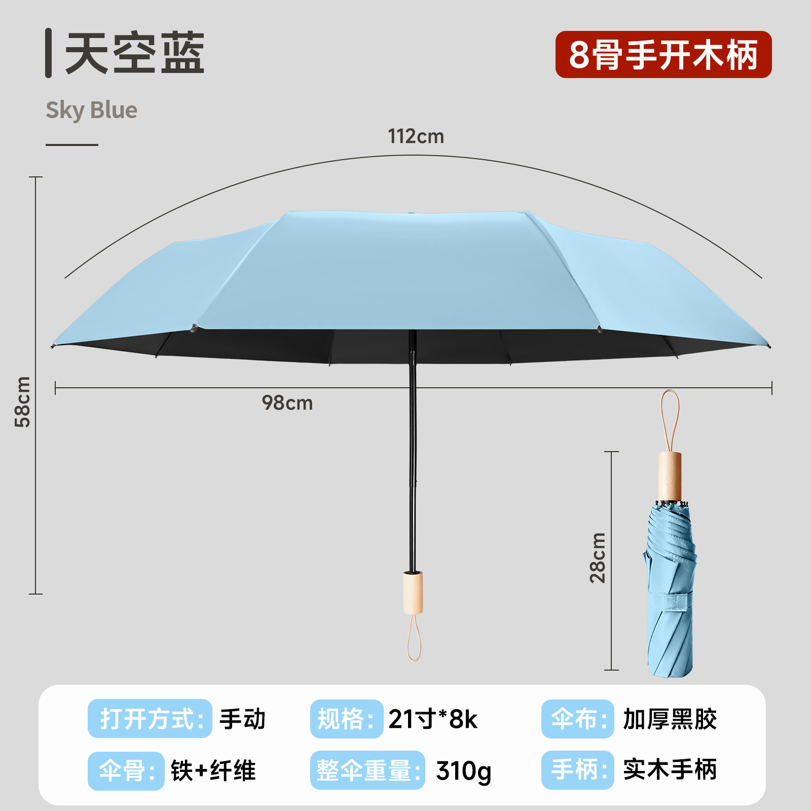 • 뼈 8 개 [수동 굵은 4 개 섹션] 하늘색 UV 우산