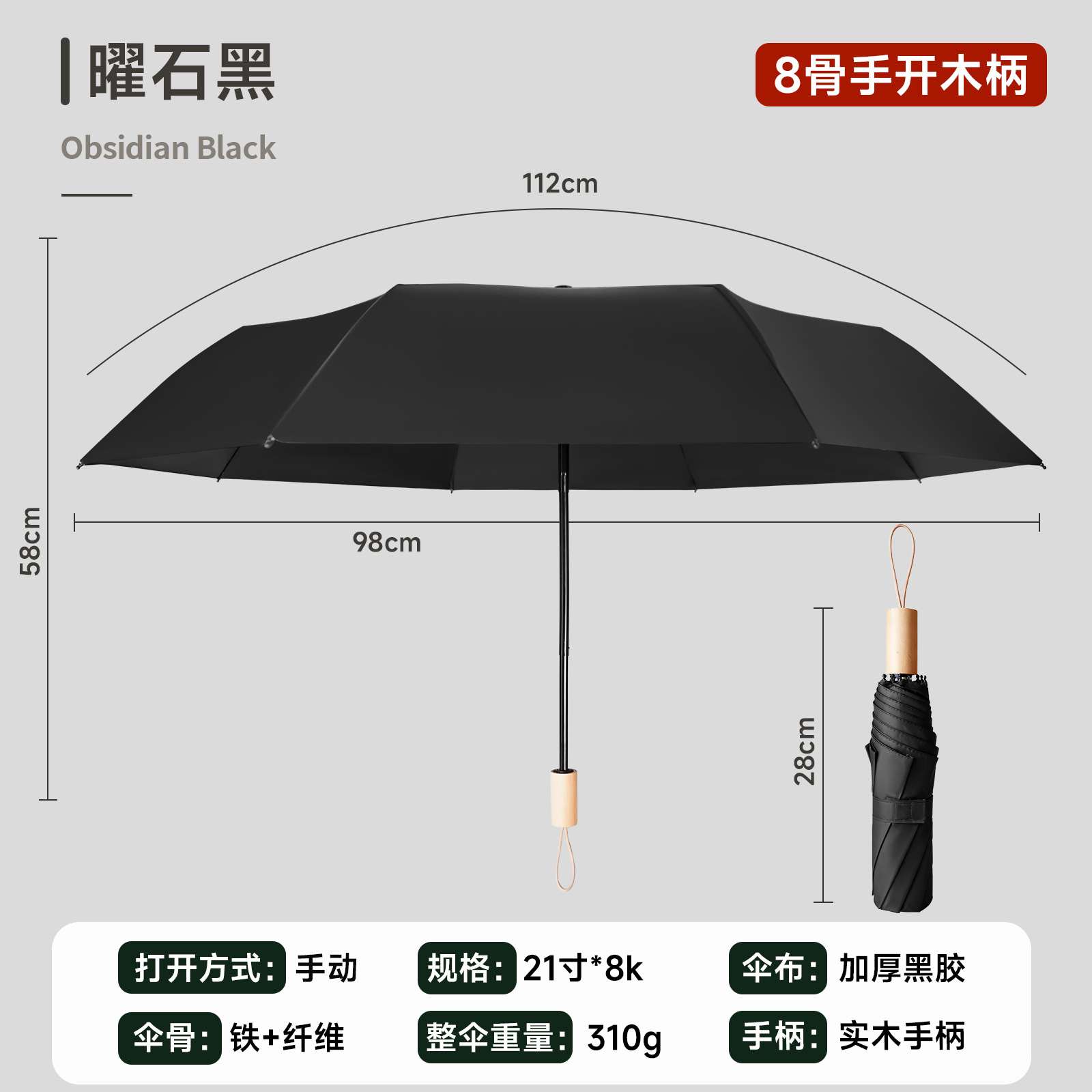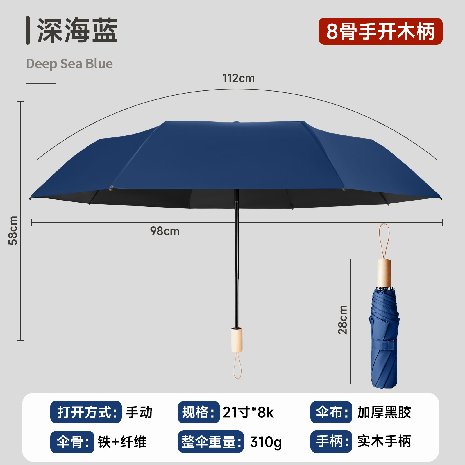 • 심해 블루 - 우드 핸들 8본 수동 우산