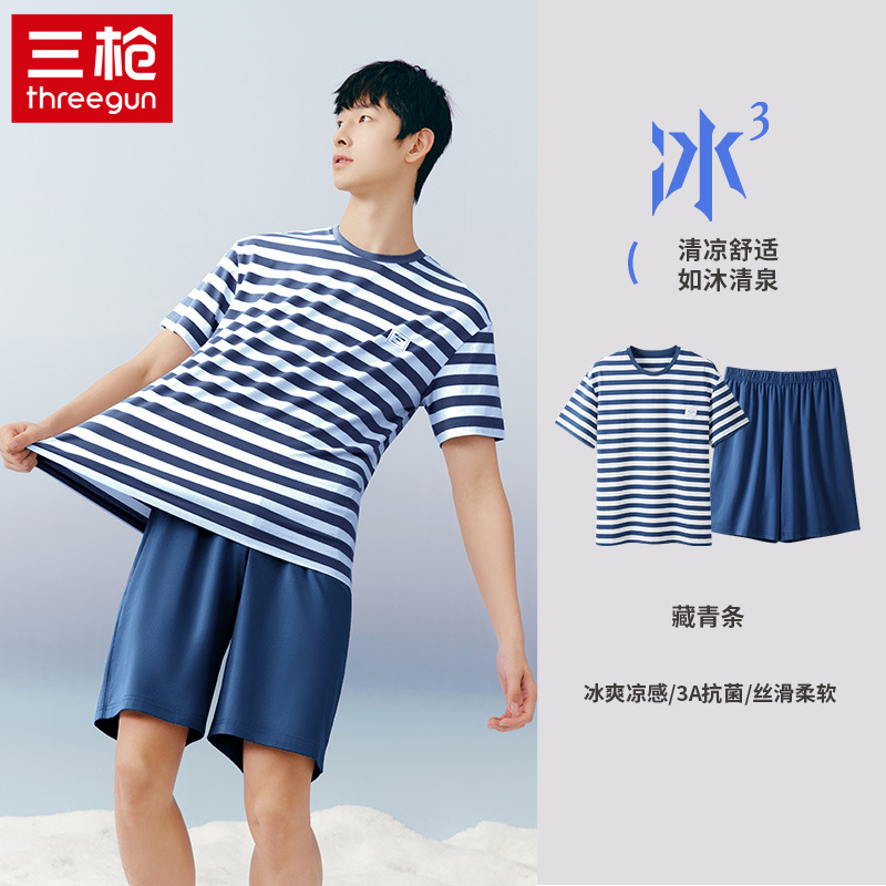 Threegun [아이스 큐브] 아이스 스프링 코튼 쿨링 잠옷 세트 남성 여름 얇은 스트라이프 반바지 홈웨어