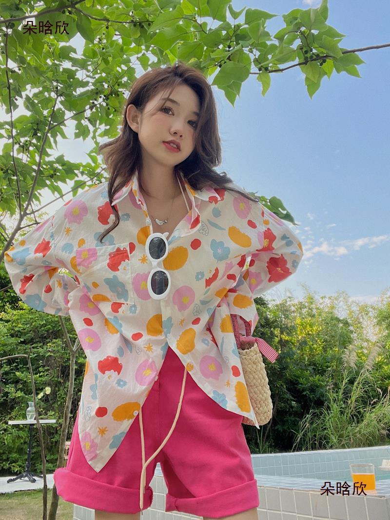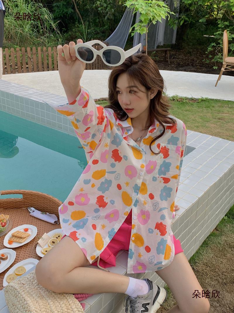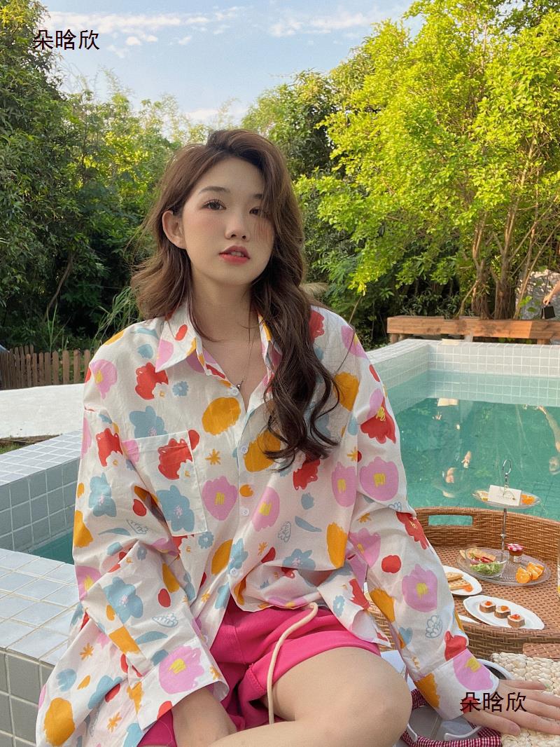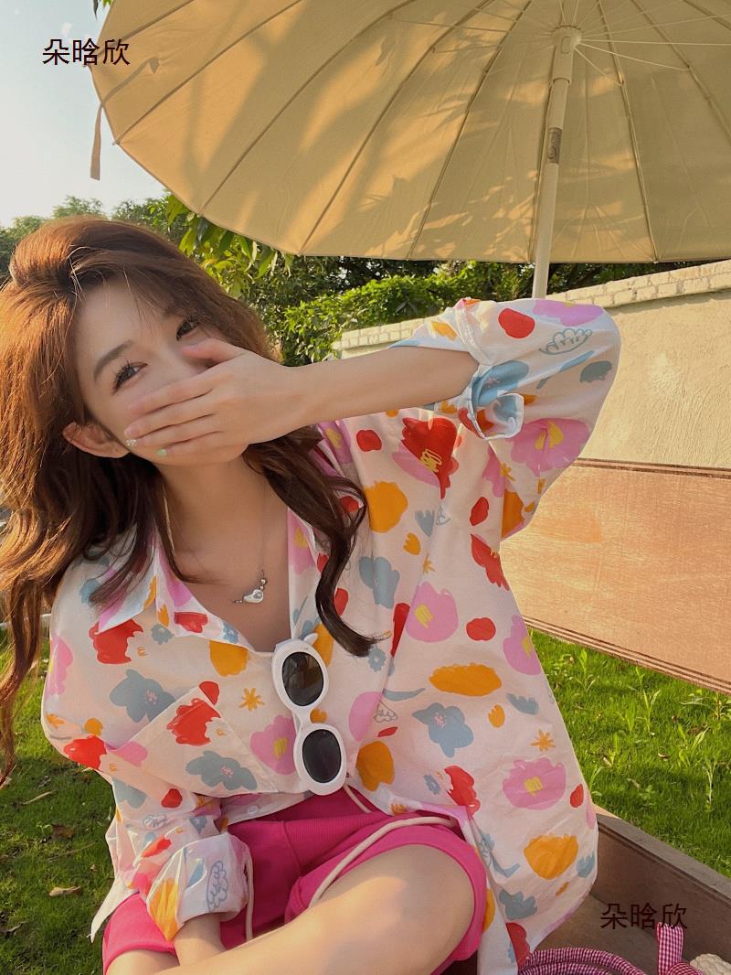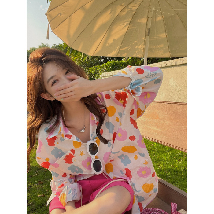 달콤한 꽃 휴가 셔츠 여성의 봄과 여름 느슨한 슬리밍 중장 셔츠 틈새 긴팔 썬 스크린 탑