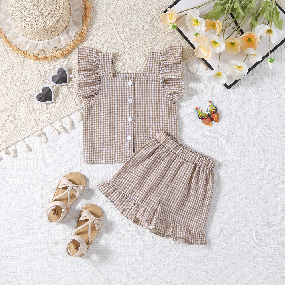 2024 새로운 여름 아기 소녀 귀 민소매 조끼 셔츠 반바지 2 피스 아기 격자 무늬 세트