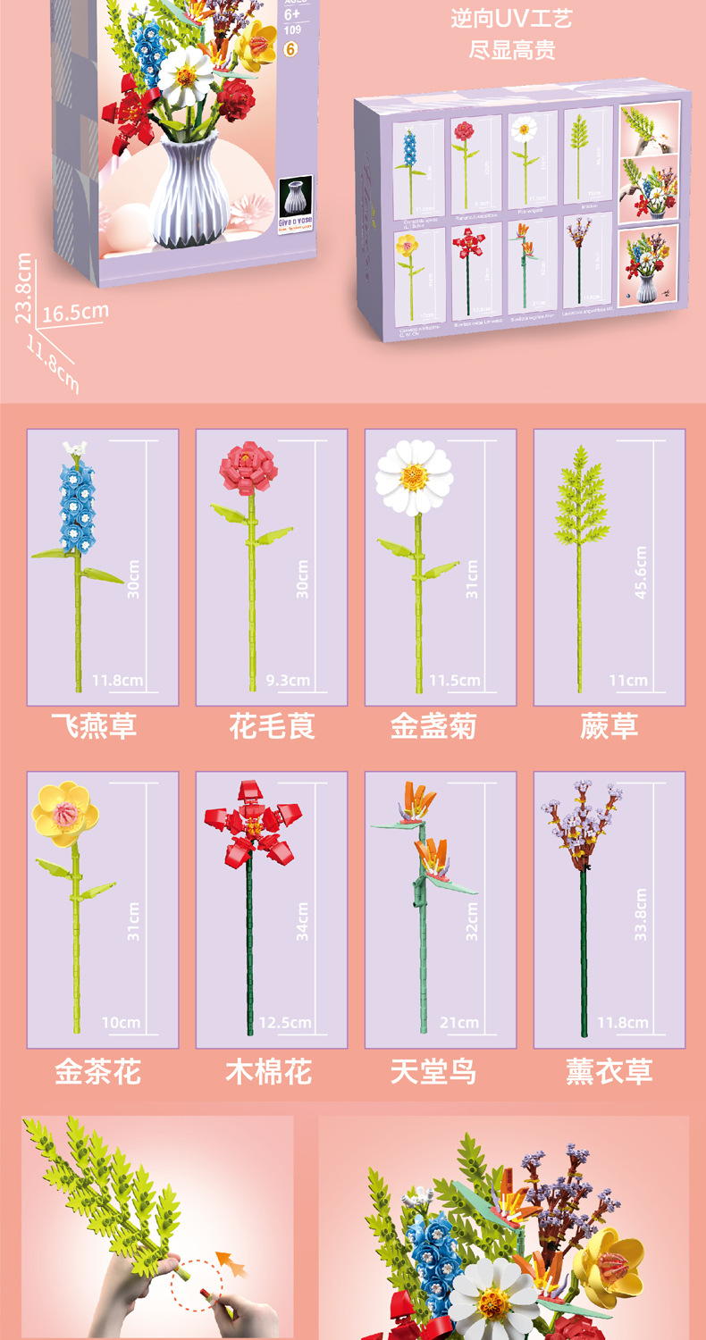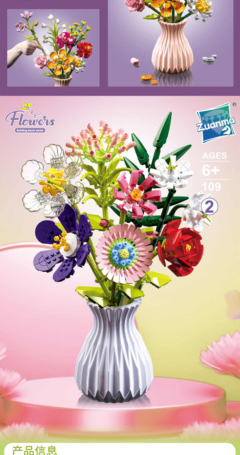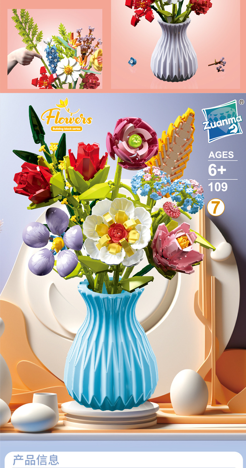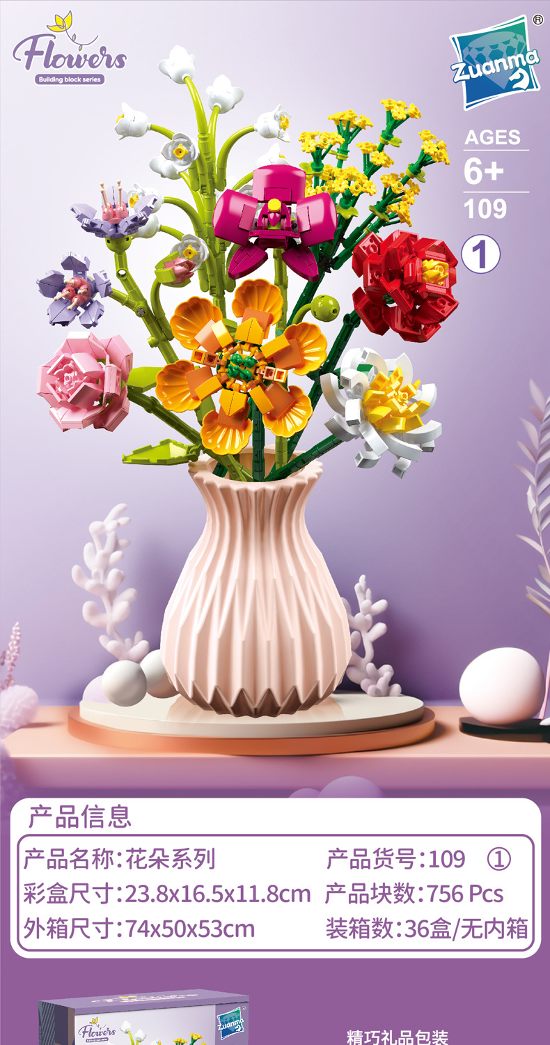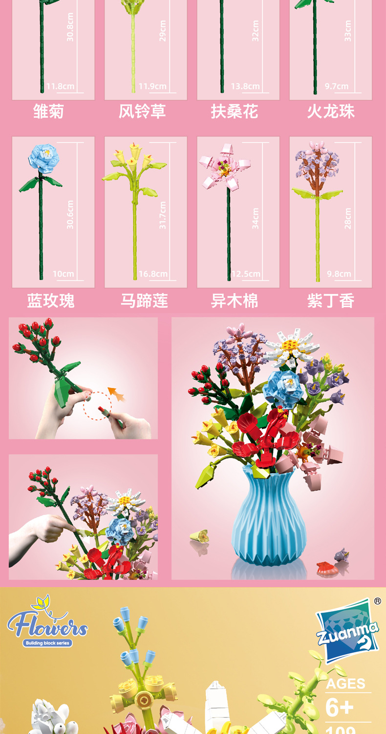 드릴마109 조립식 블록 꽃다발 영구꽃 장미 꽃다발 어린이 교육용 조립 장난감 블록 도매