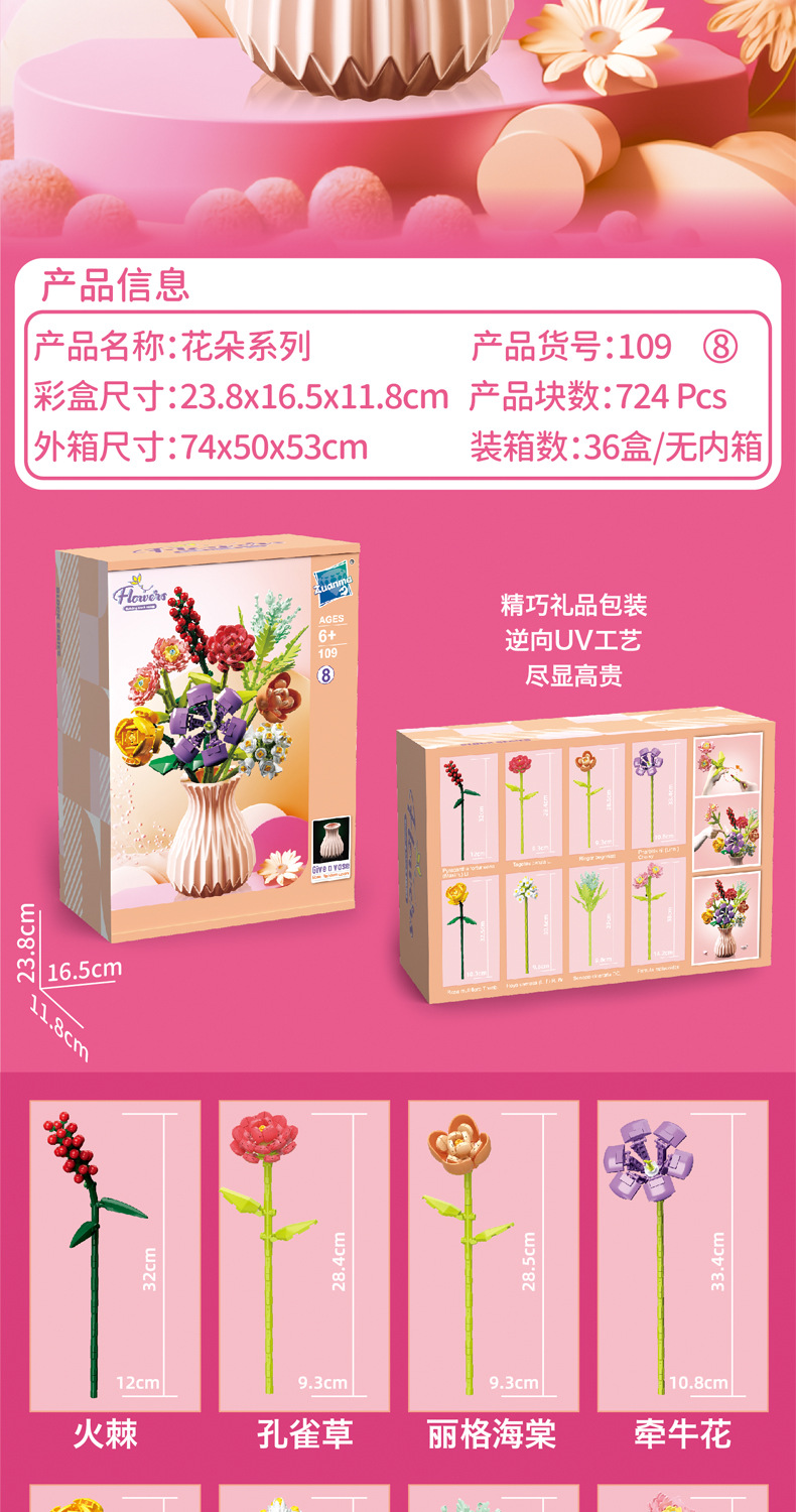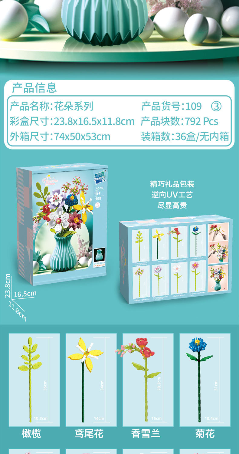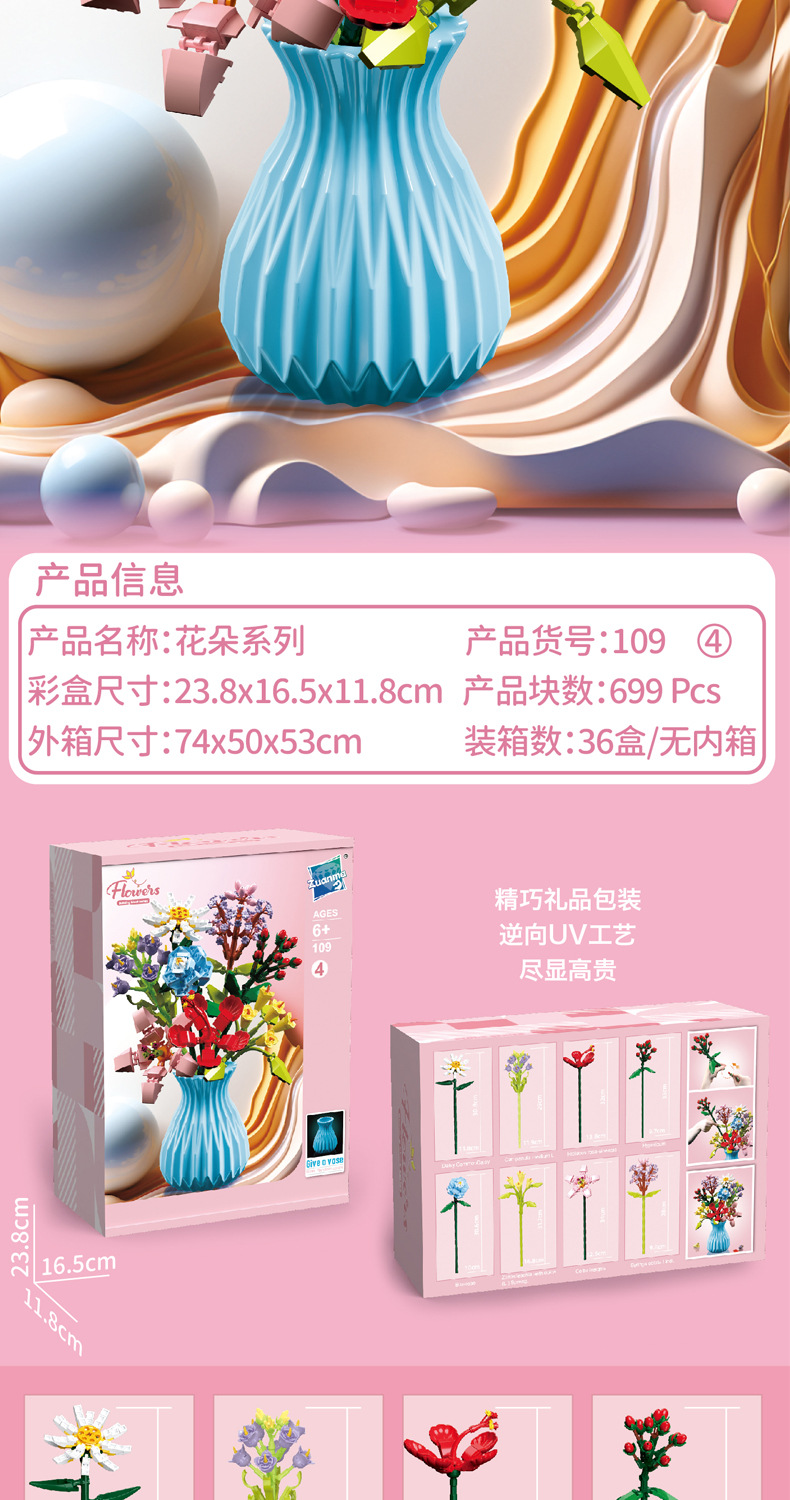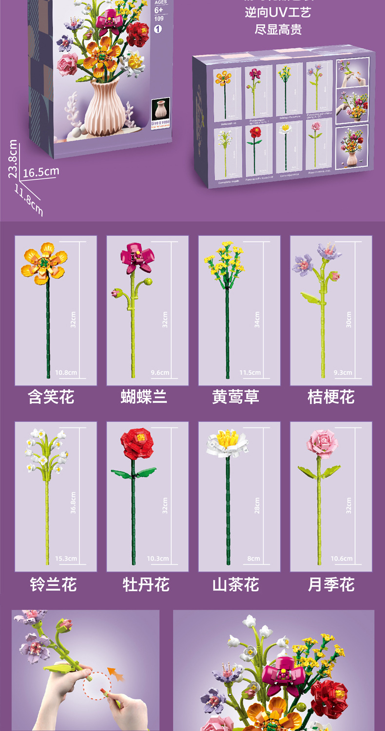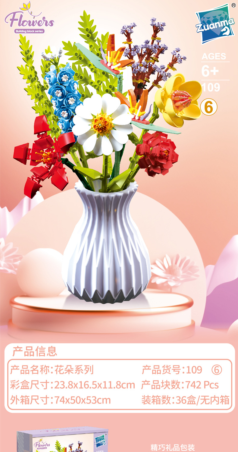 드릴마109 조립식 블록 꽃다발 영구꽃 장미 꽃다발 어린이 교육용 조립 장난감 블록 도매