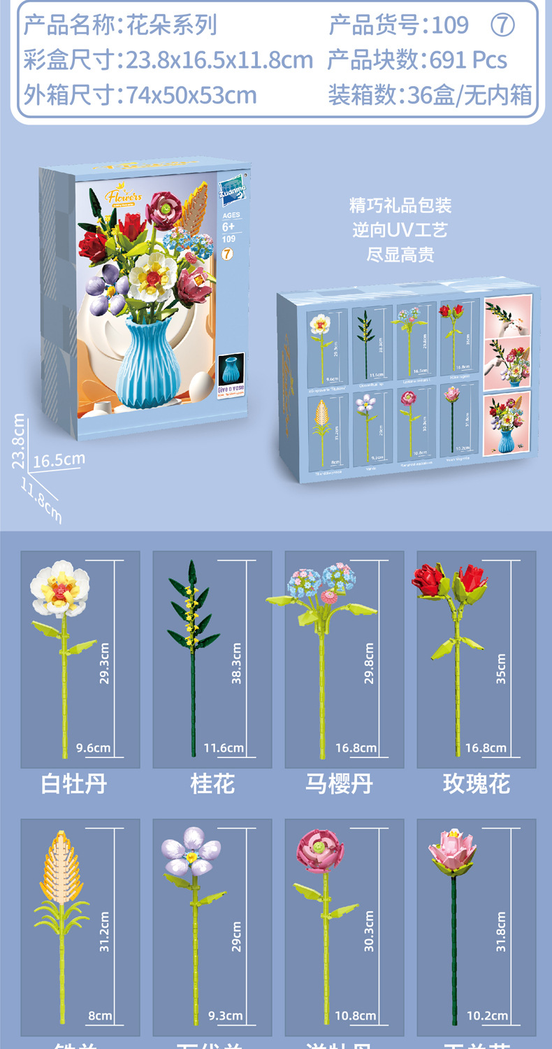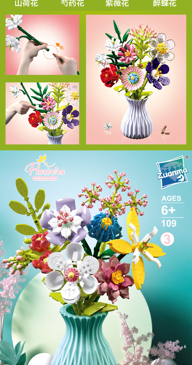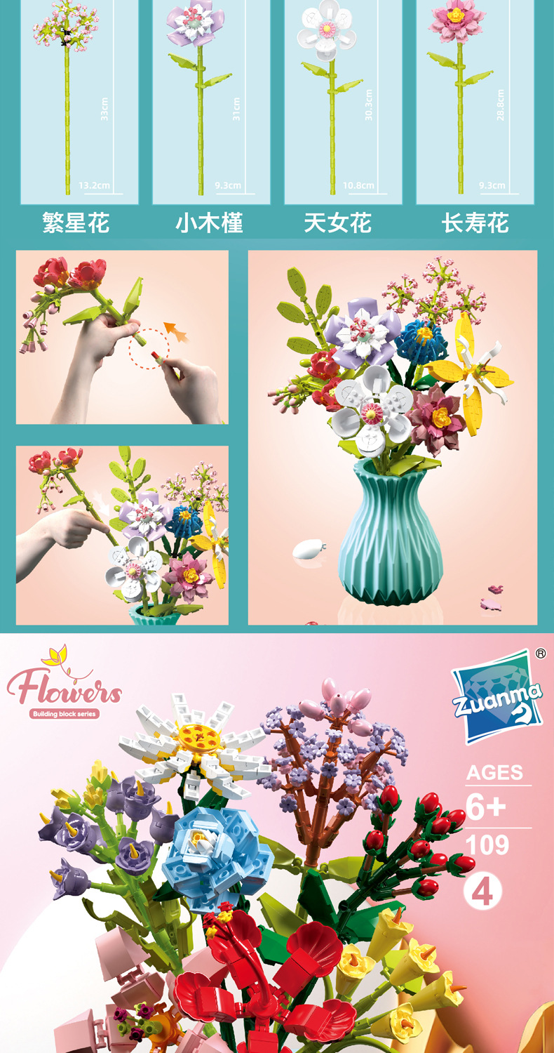 드릴마109 조립식 블록 꽃다발 영구꽃 장미 꽃다발 어린이 교육용 조립 장난감 블록 도매스토어 가기