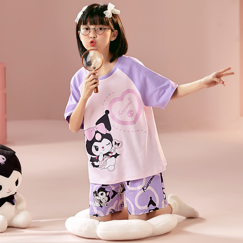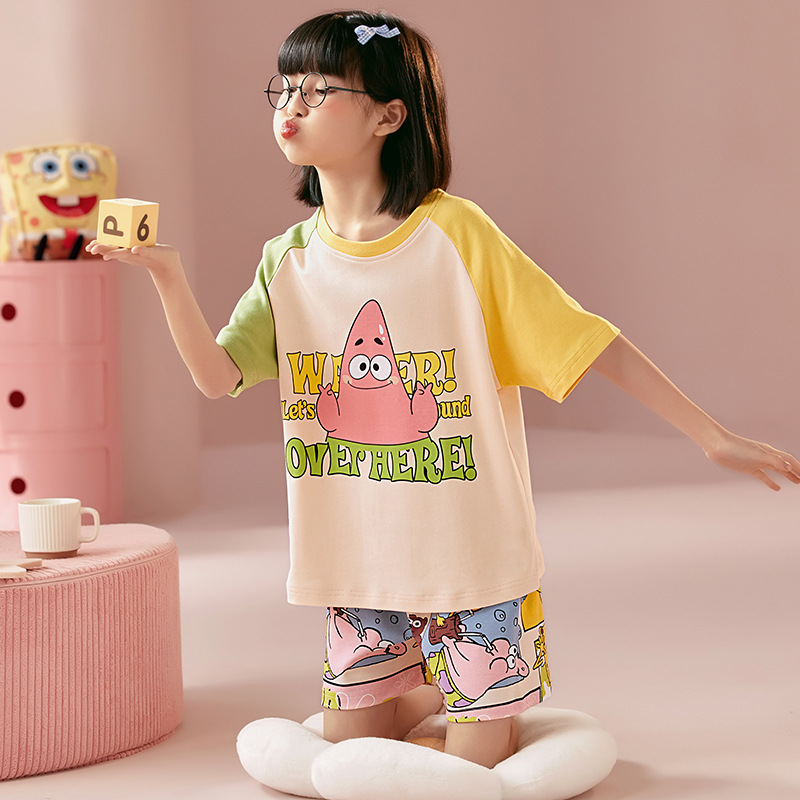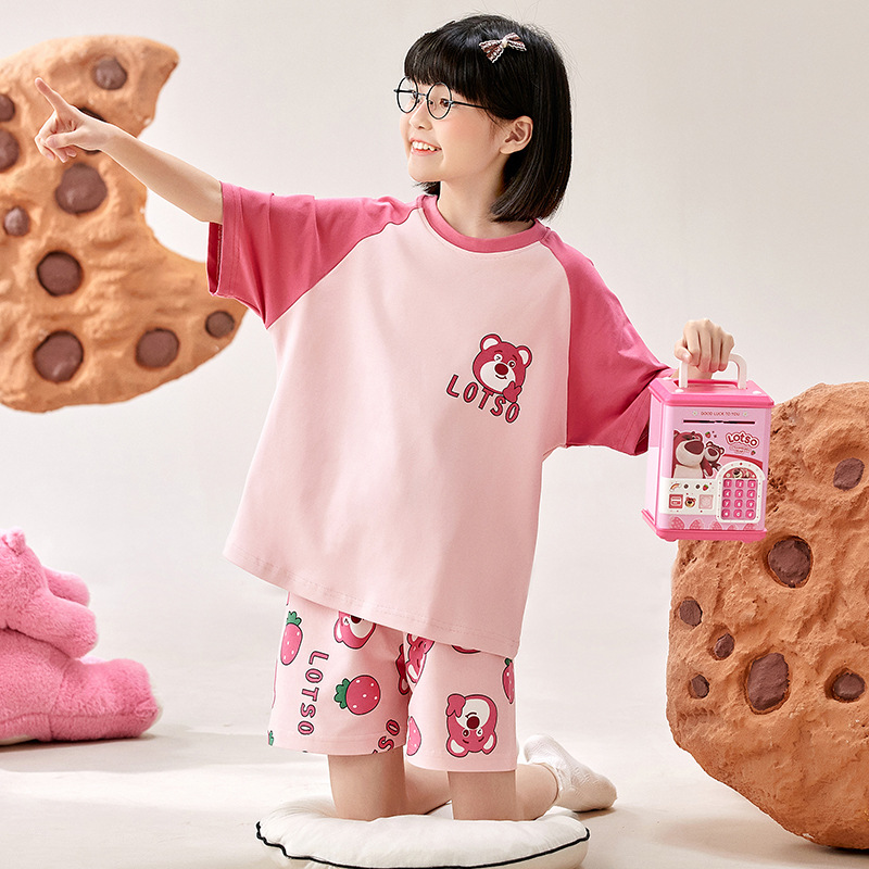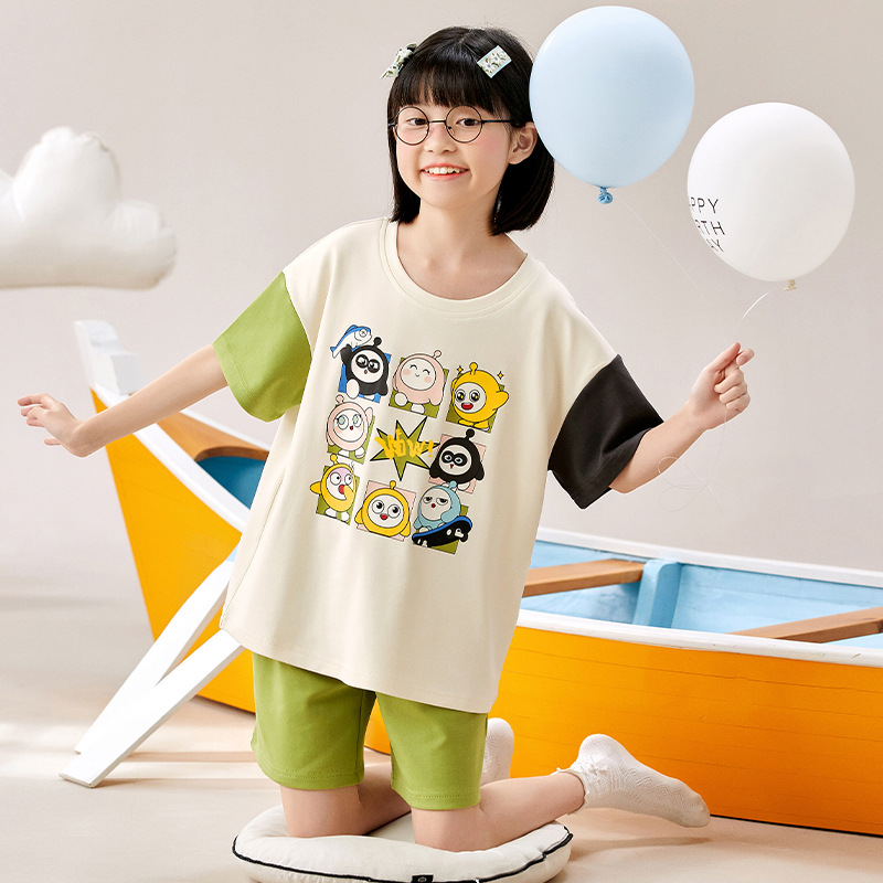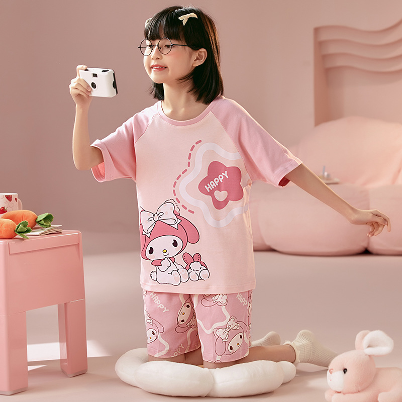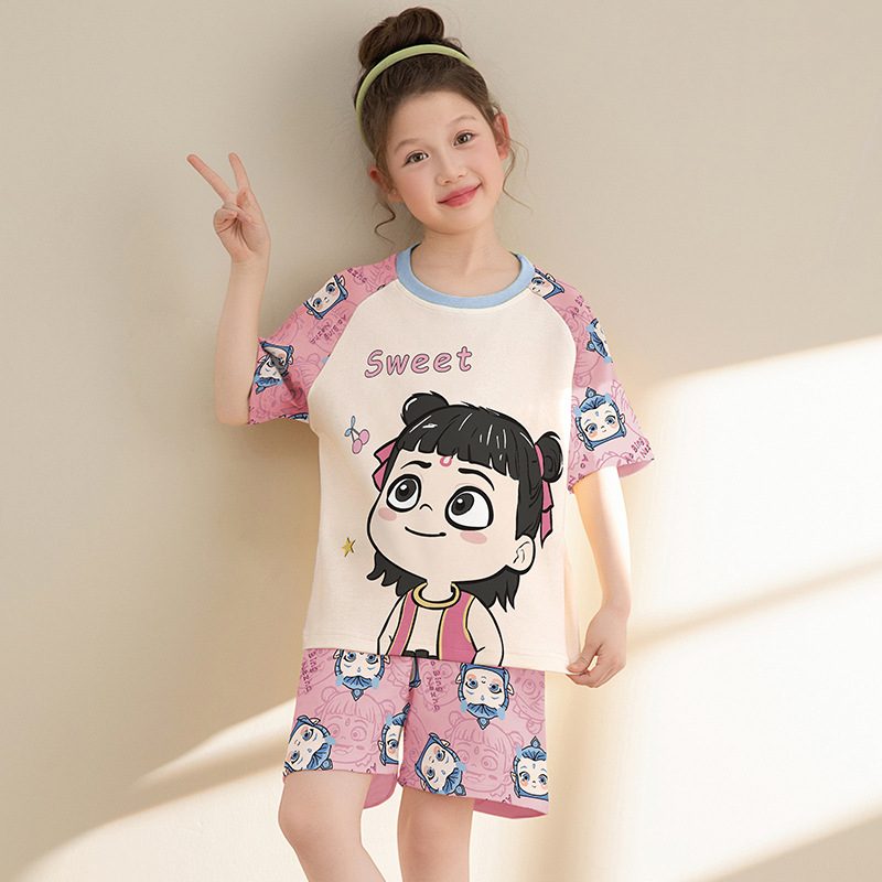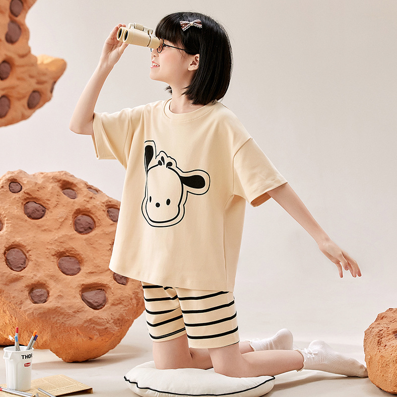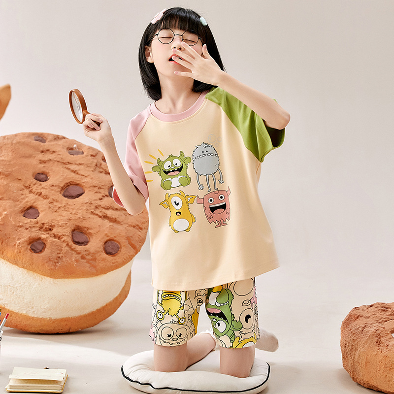 귀여운 만화 소녀 잠옷 반팔 반바지 세트, 중소 및 대형 어린이를위한 여아 집 옷을 풀 수 있습니다스토어 가기