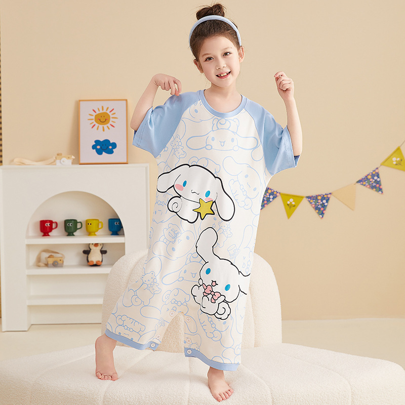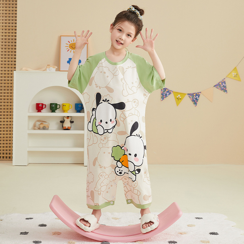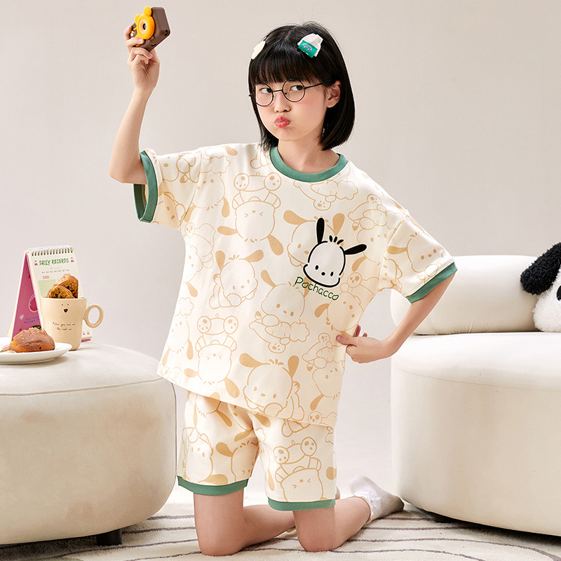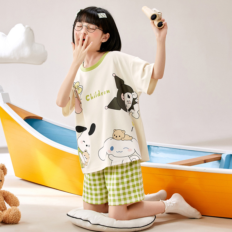 귀여운 만화 소녀 잠옷 반팔 반바지 세트, 중소 및 대형 어린이를위한 여아 집 옷을 풀 수 있습니다