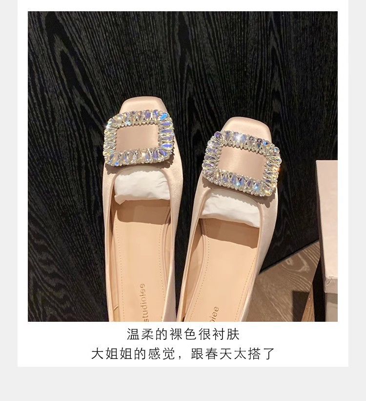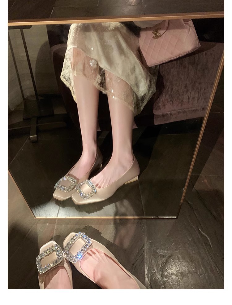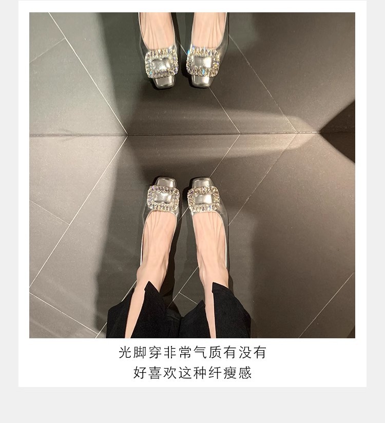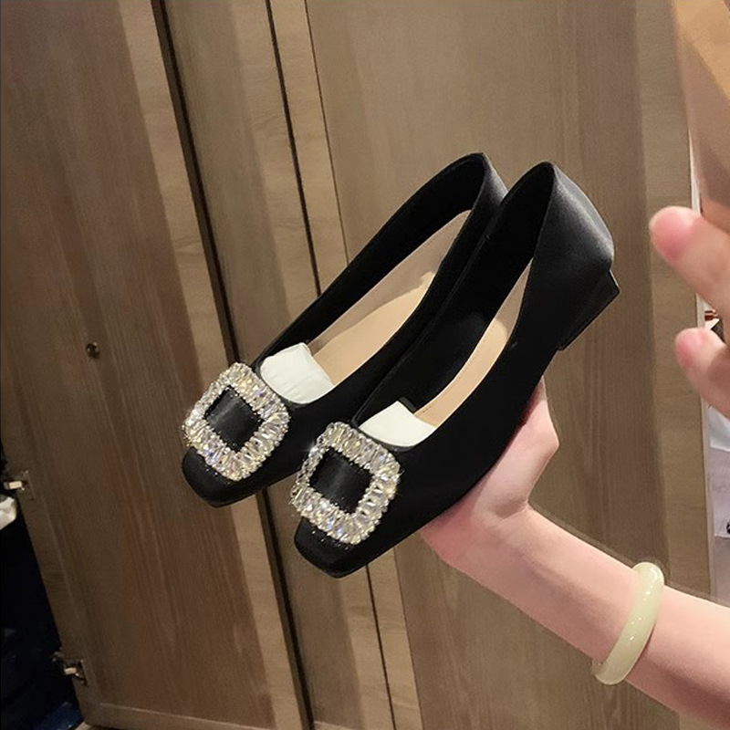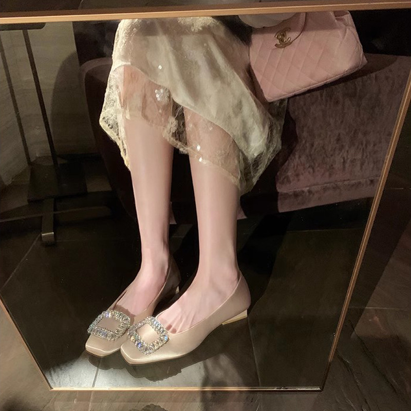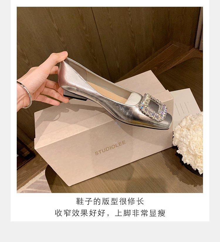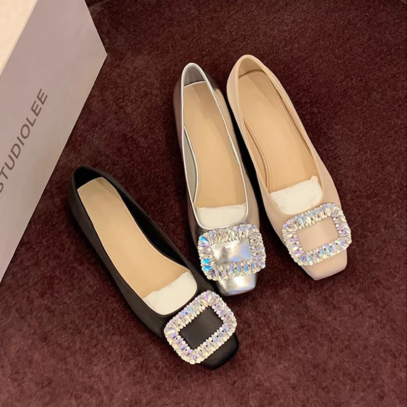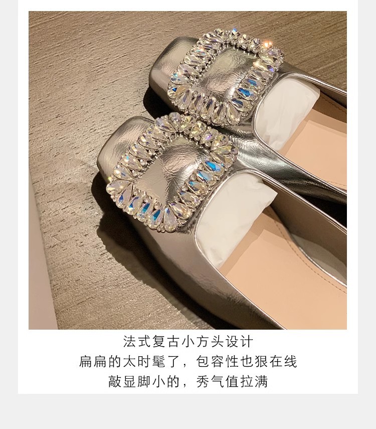 새로운 봄 스타일의 라인스톤 스퀘어토 얕은굽 실버 플랫 슈즈, 부드러운 가죽 소재로 우아한 분위기의 여성 통근화