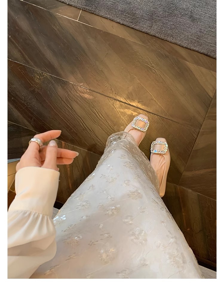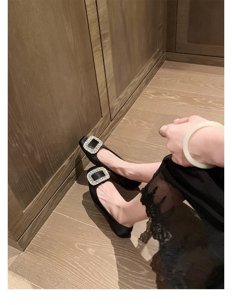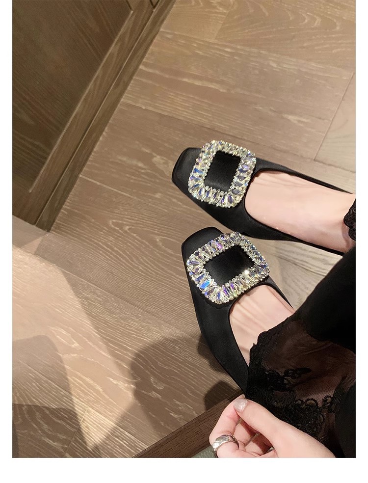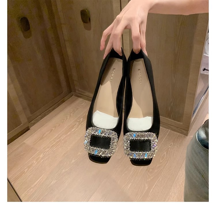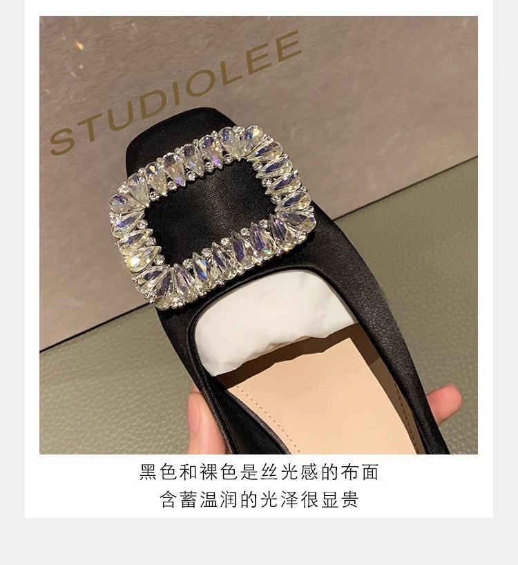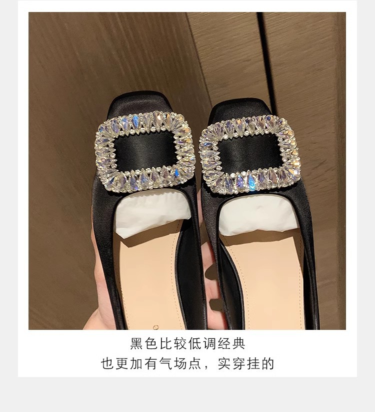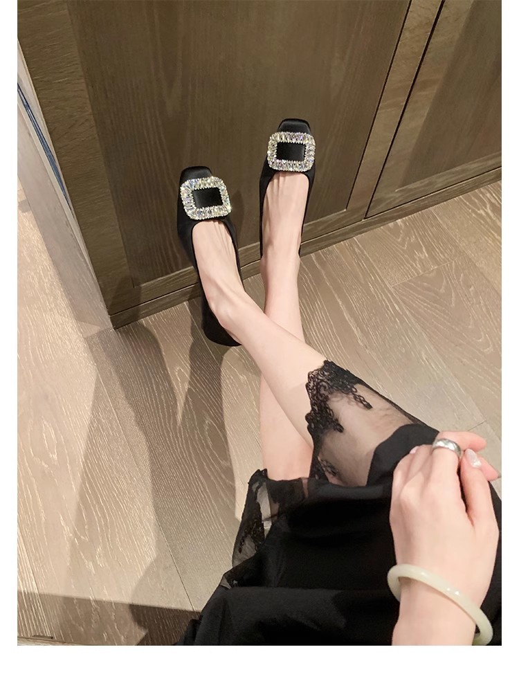 새로운 봄 스타일의 라인스톤 스퀘어토 얕은굽 실버 플랫 슈즈, 부드러운 가죽 소재로 우아한 분위기의 여성 통근화