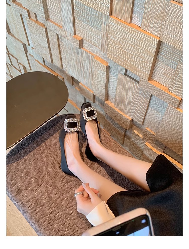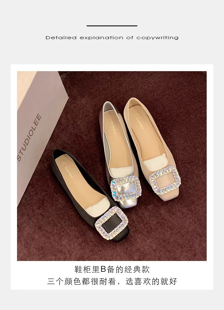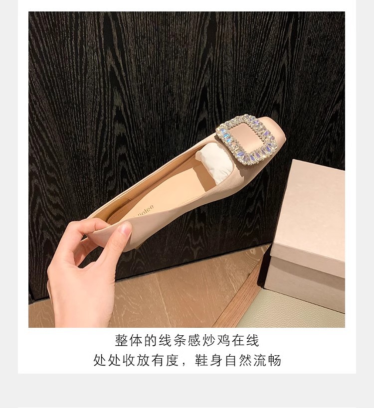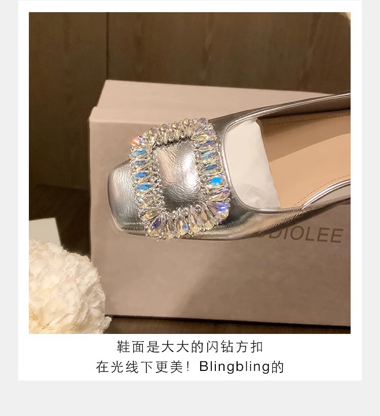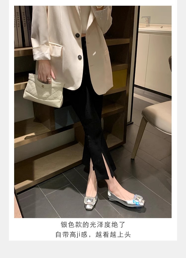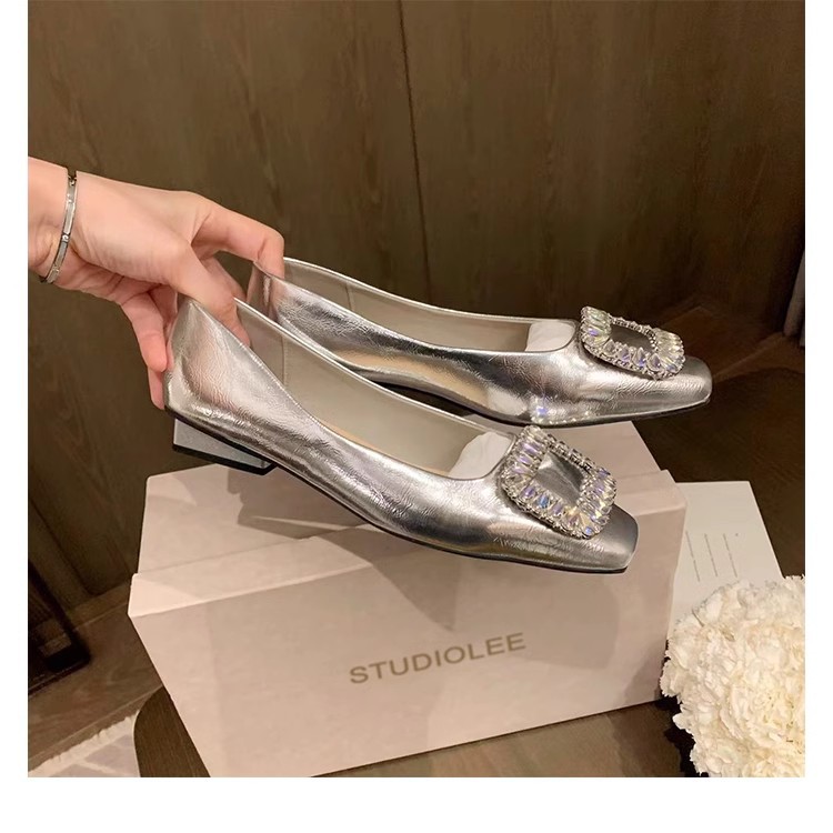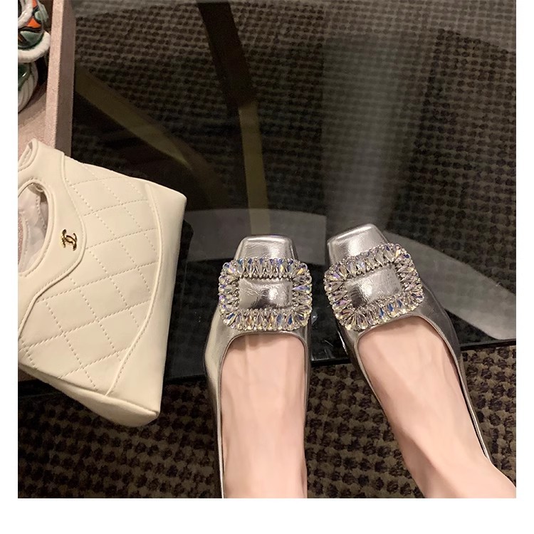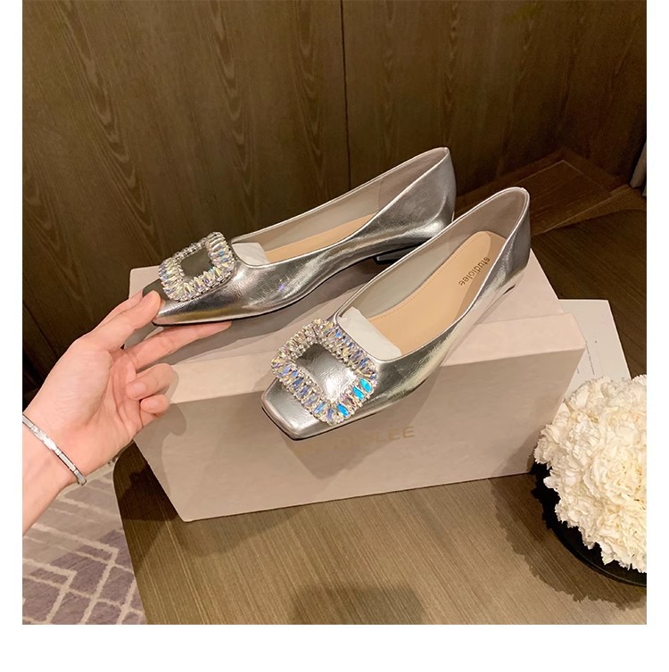 새로운 봄 스타일의 라인스톤 스퀘어토 얕은굽 실버 플랫 슈즈, 부드러운 가죽 소재로 우아한 분위기의 여성 통근화스토어 가기