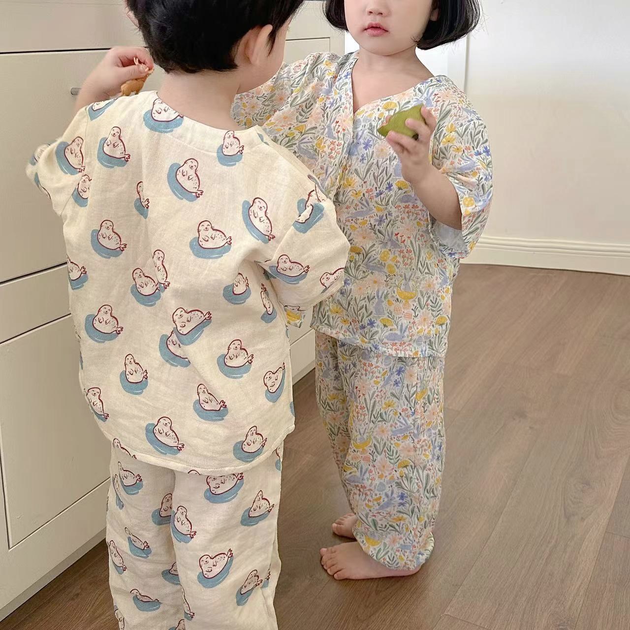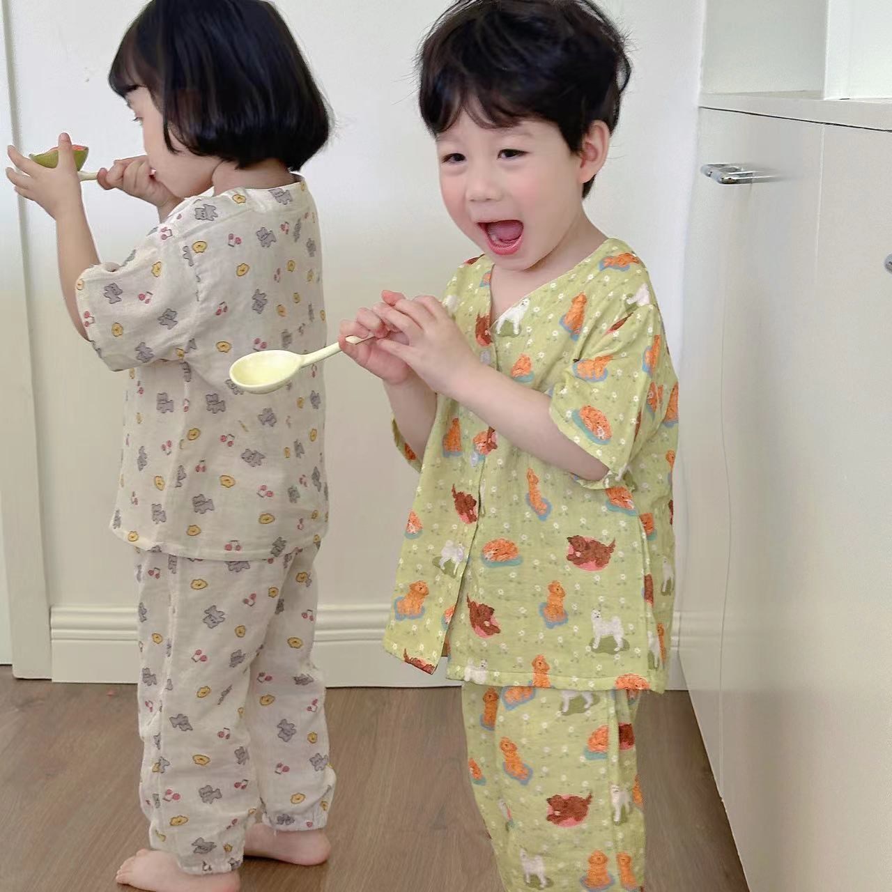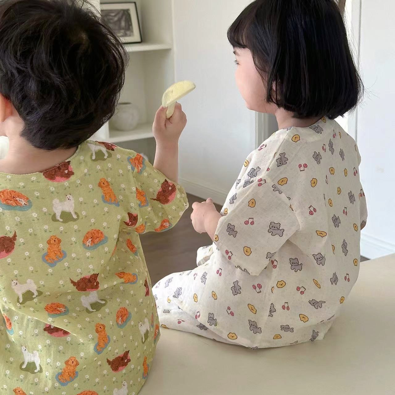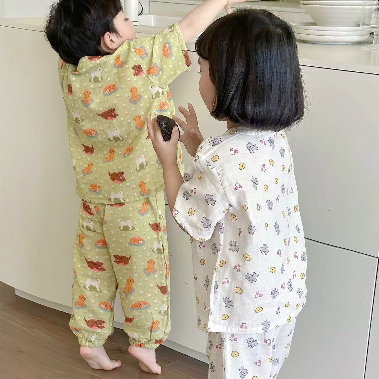 어린이 순면 잠옷 세트 2025 여름 어린이 남녀 공용 순면 홈웨어 어린이 면사 반팔 방충 바지스토어 가기