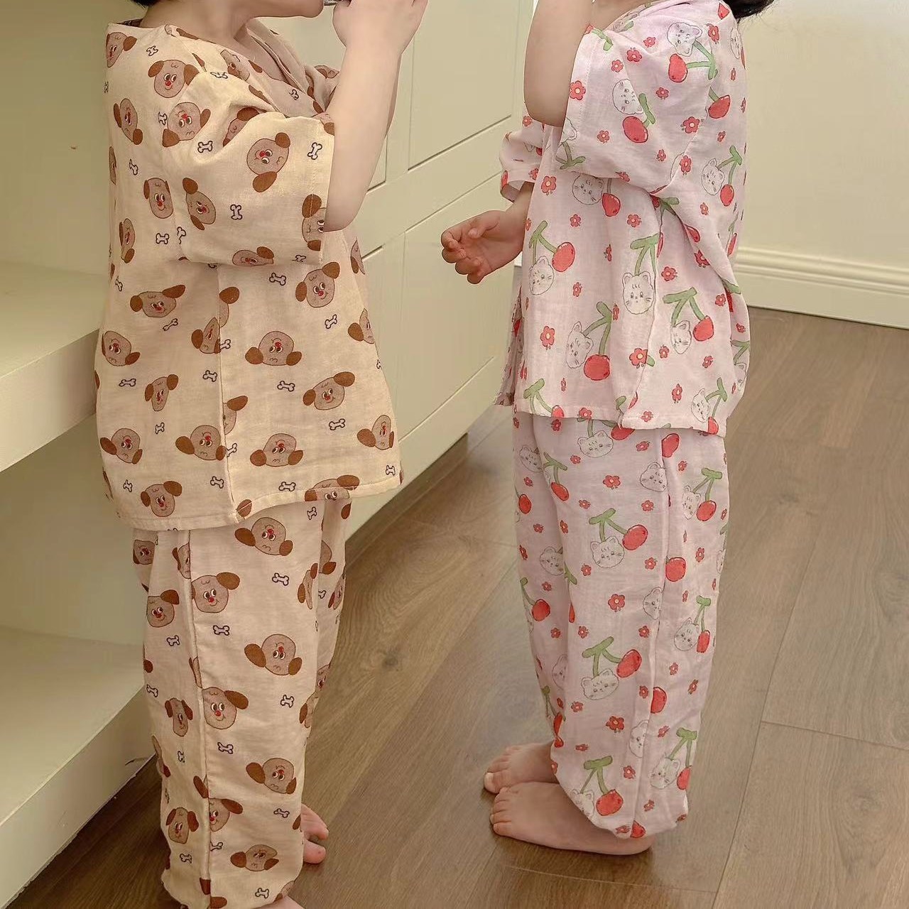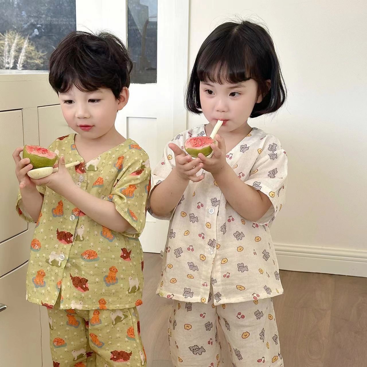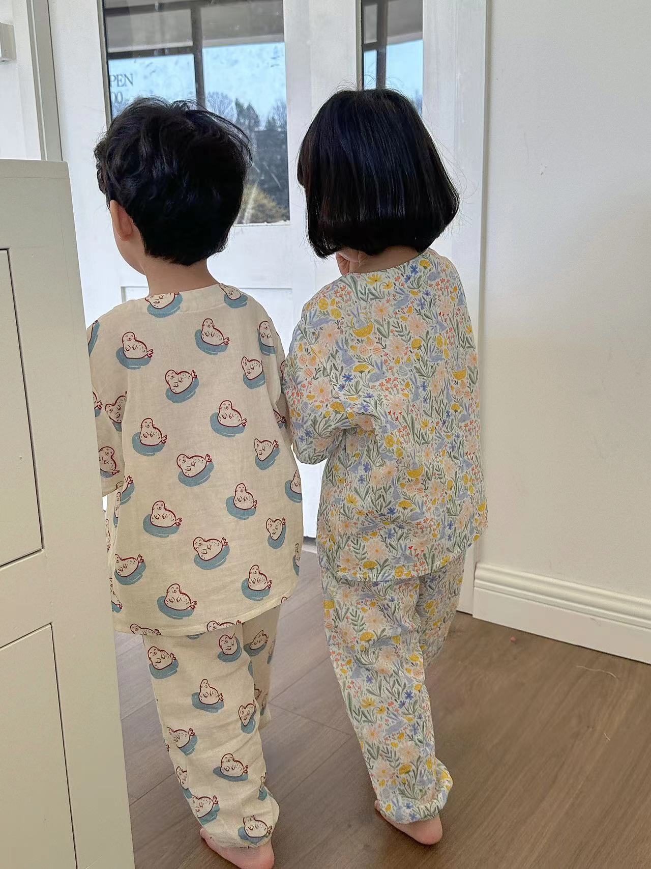 어린이 순면 잠옷 세트 2025 여름 어린이 남녀 공용 순면 홈웨어 어린이 면사 반팔 방충 바지스토어 가기