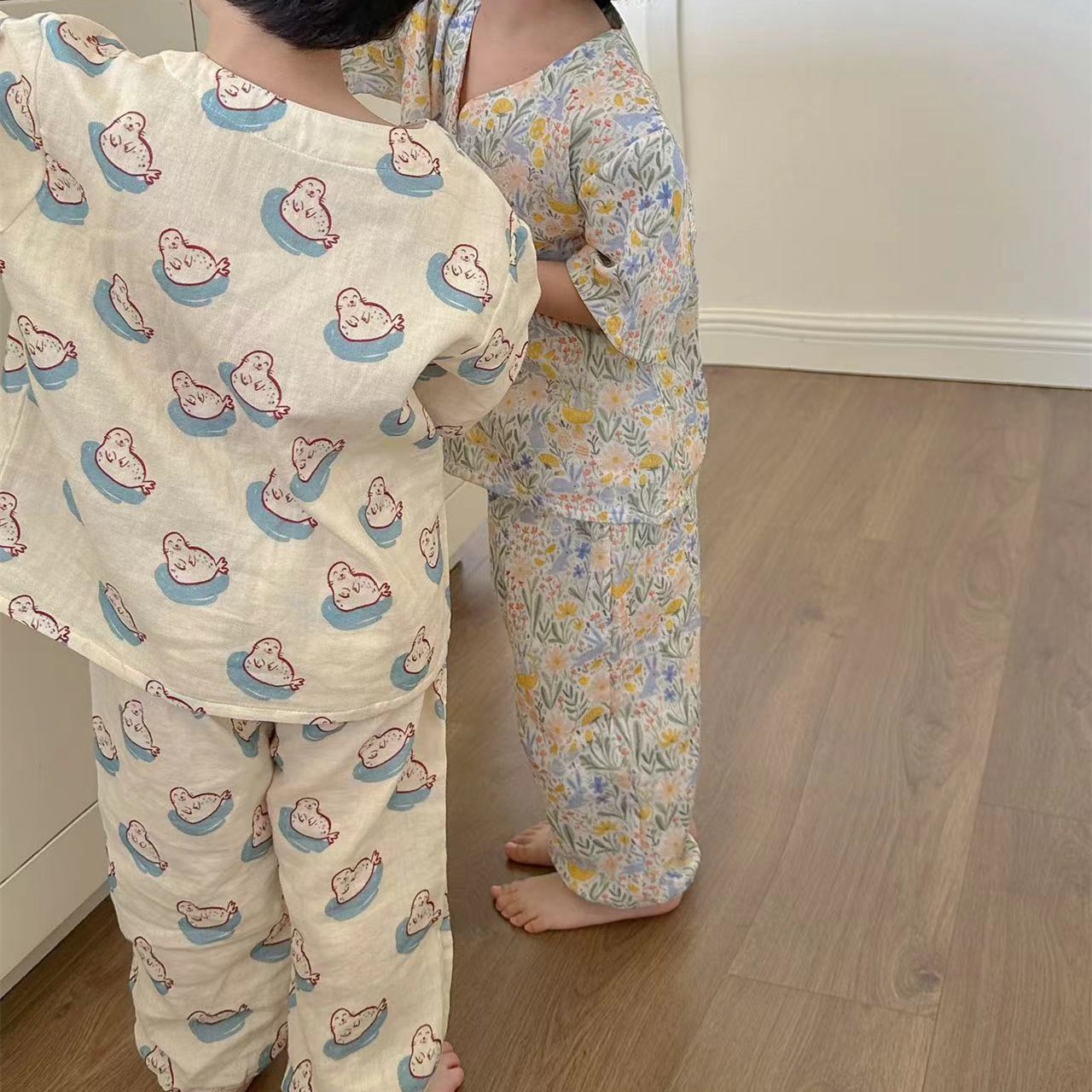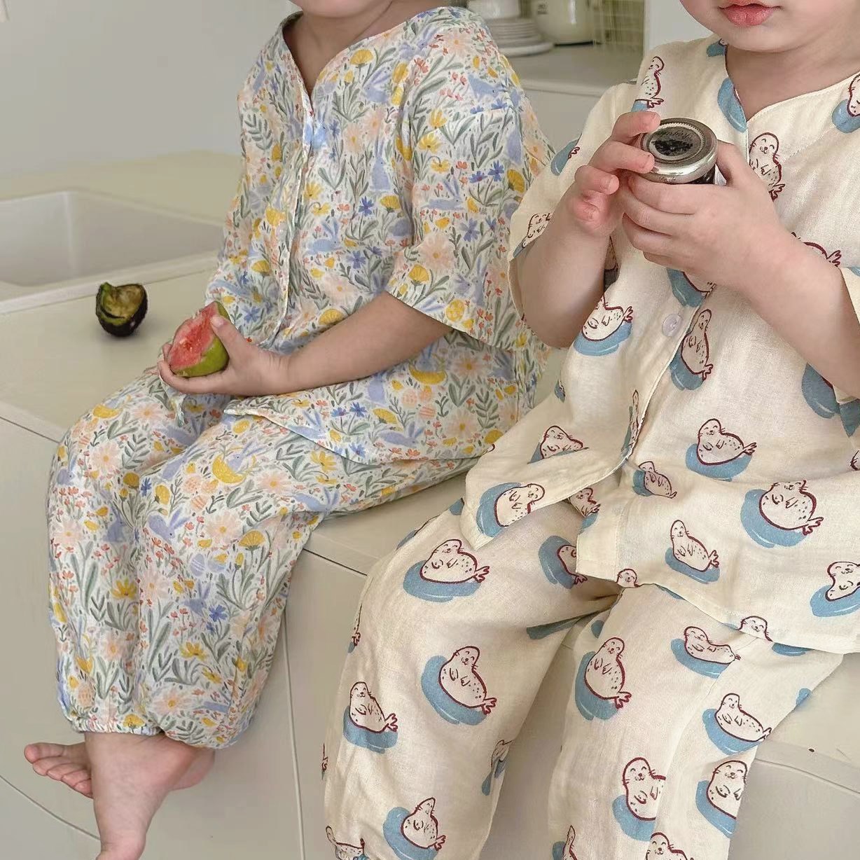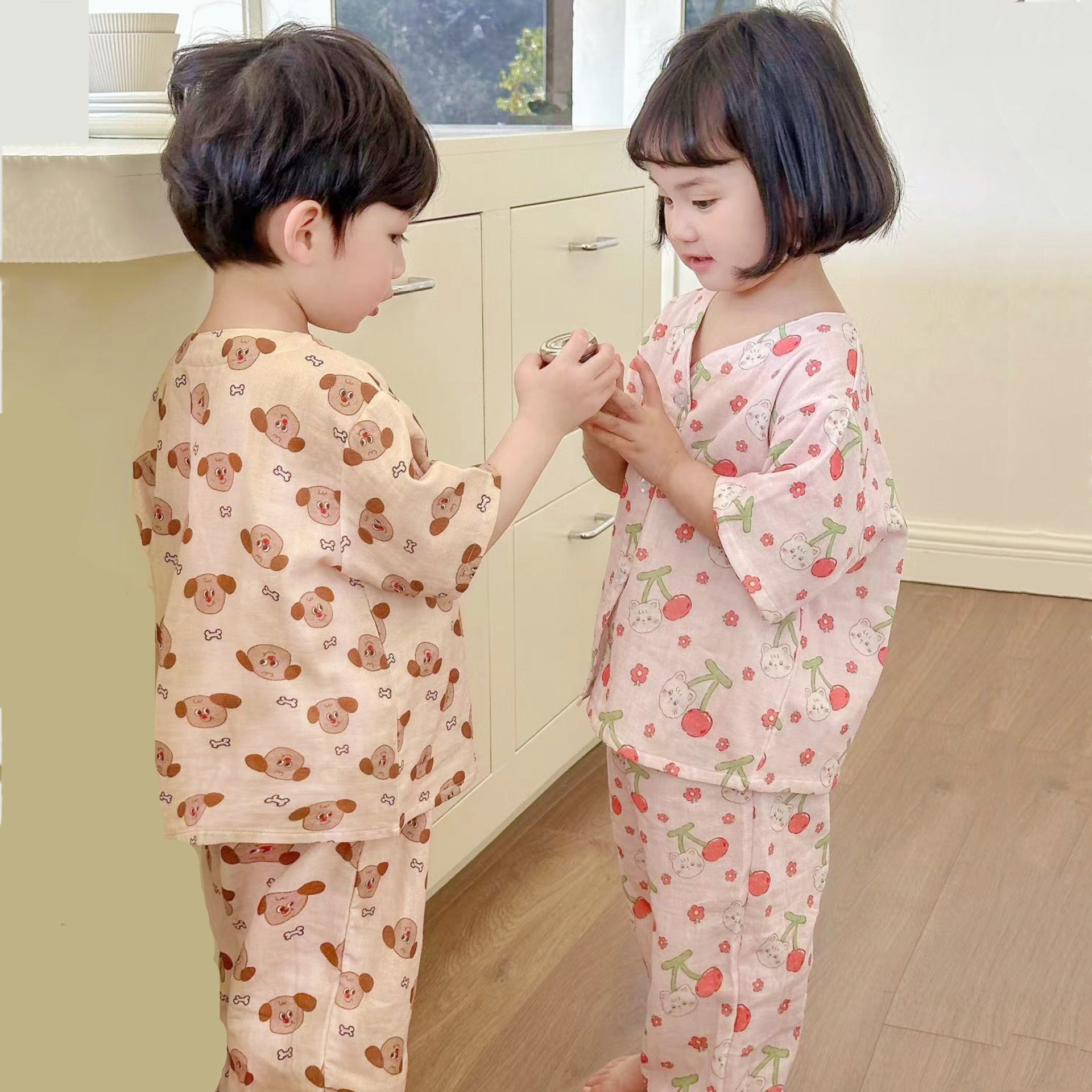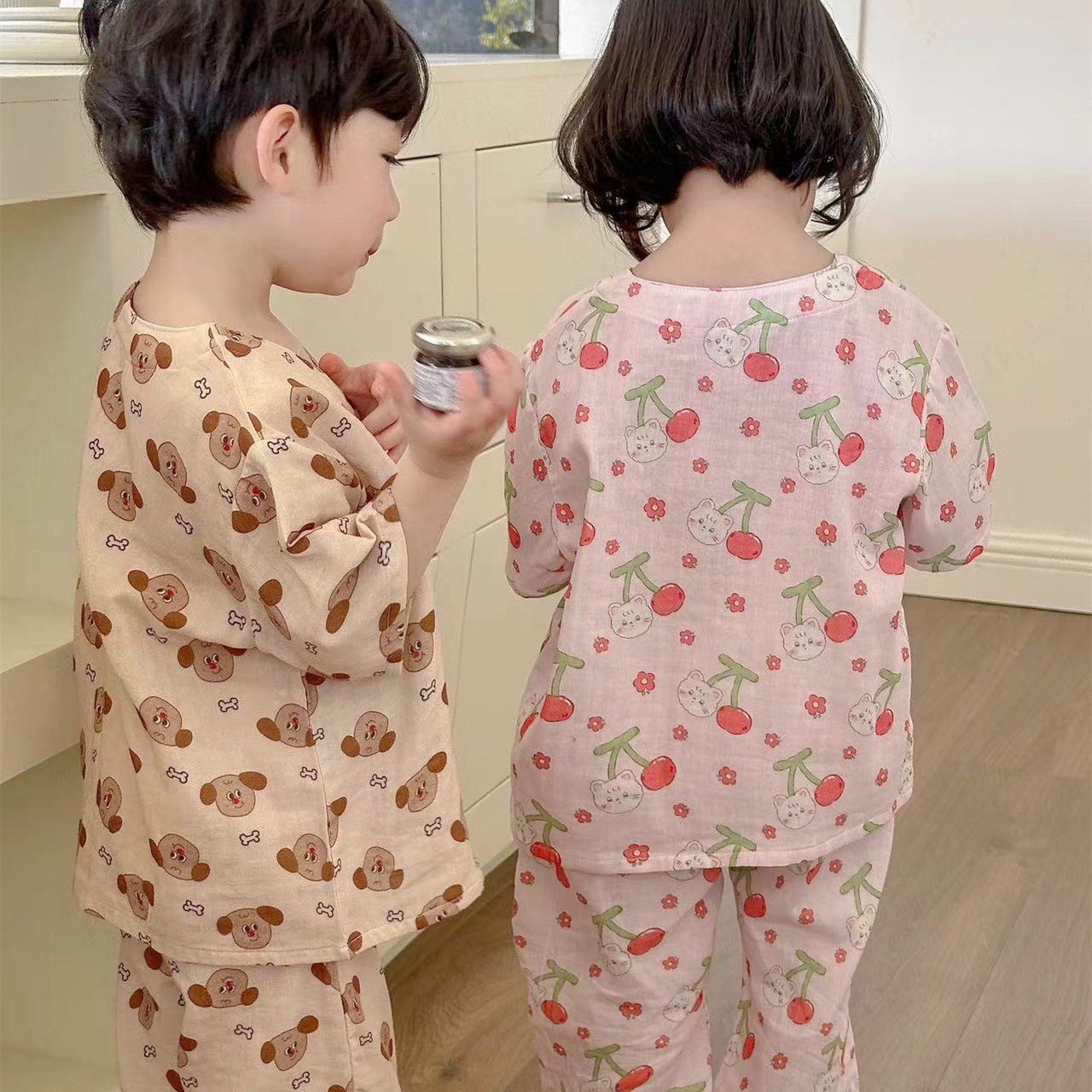 어린이 순면 잠옷 세트 2025 여름 어린이 남녀 공용 순면 홈웨어 어린이 면사 반팔 방충 바지스토어 가기