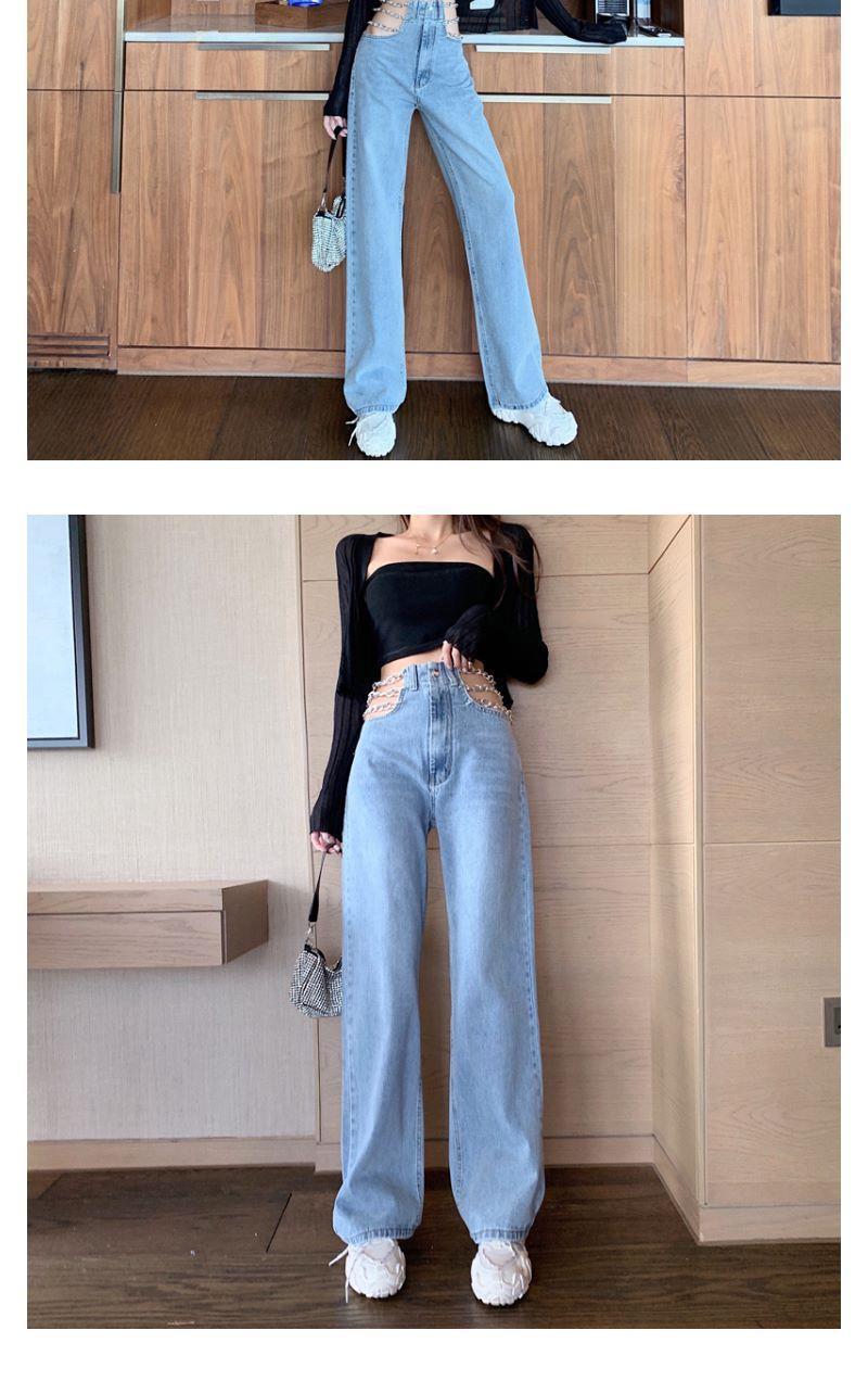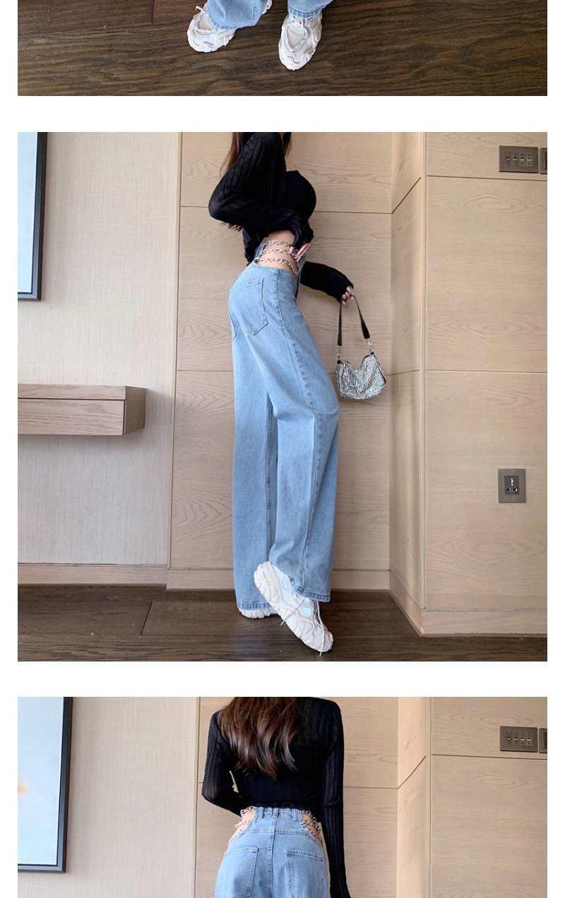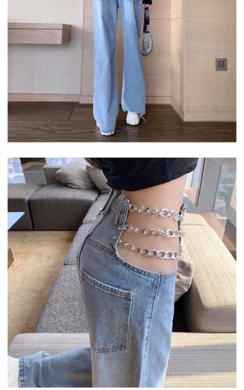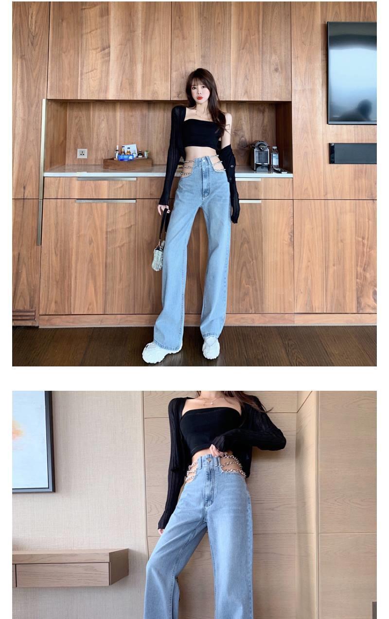 디자인 센스 체인 높은 허리 빈 섹시한 느슨한 스트레이트 청바지 여성의 봄 한국 스타일 뜨거운 소녀 넓은 다리 트렌디 바지