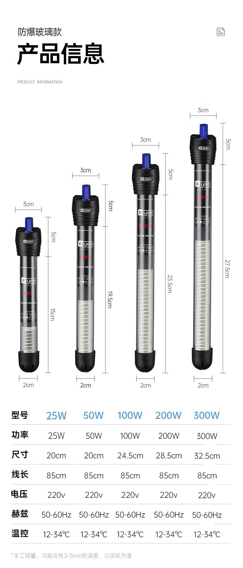 • 50W 초경질 석영 방폭 + 보호 케이스, 온도계 포함