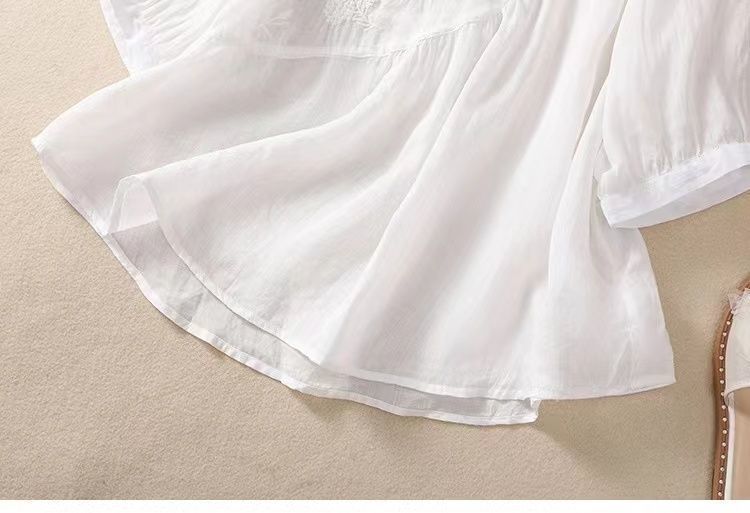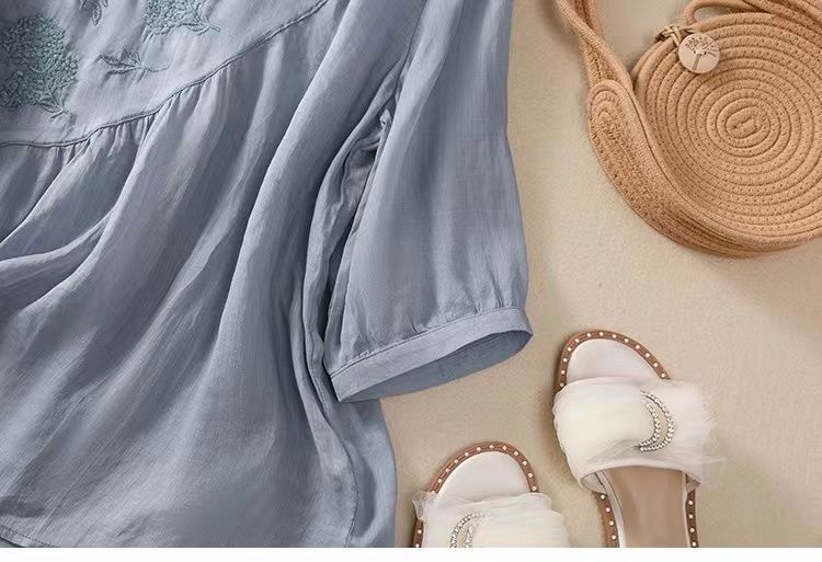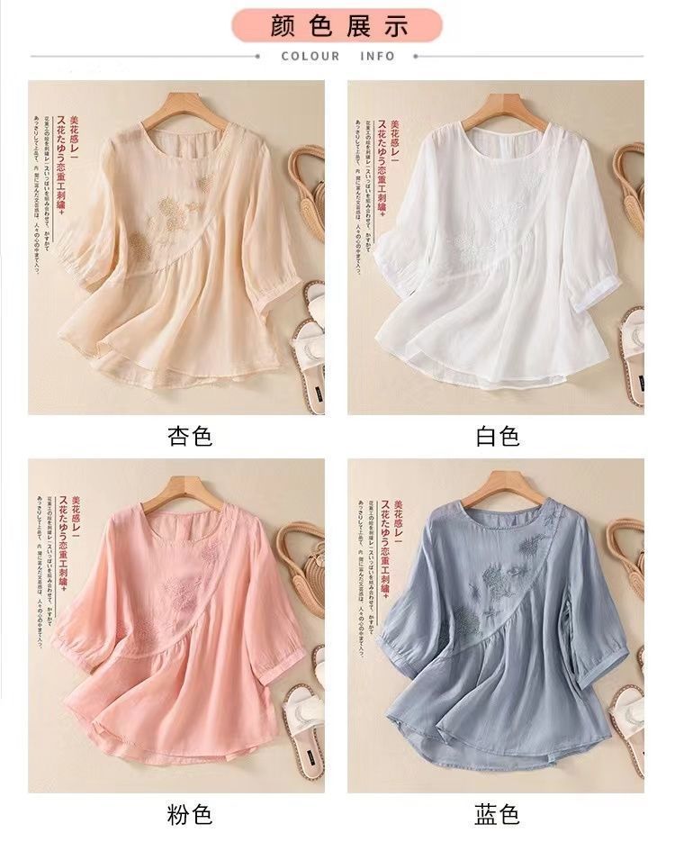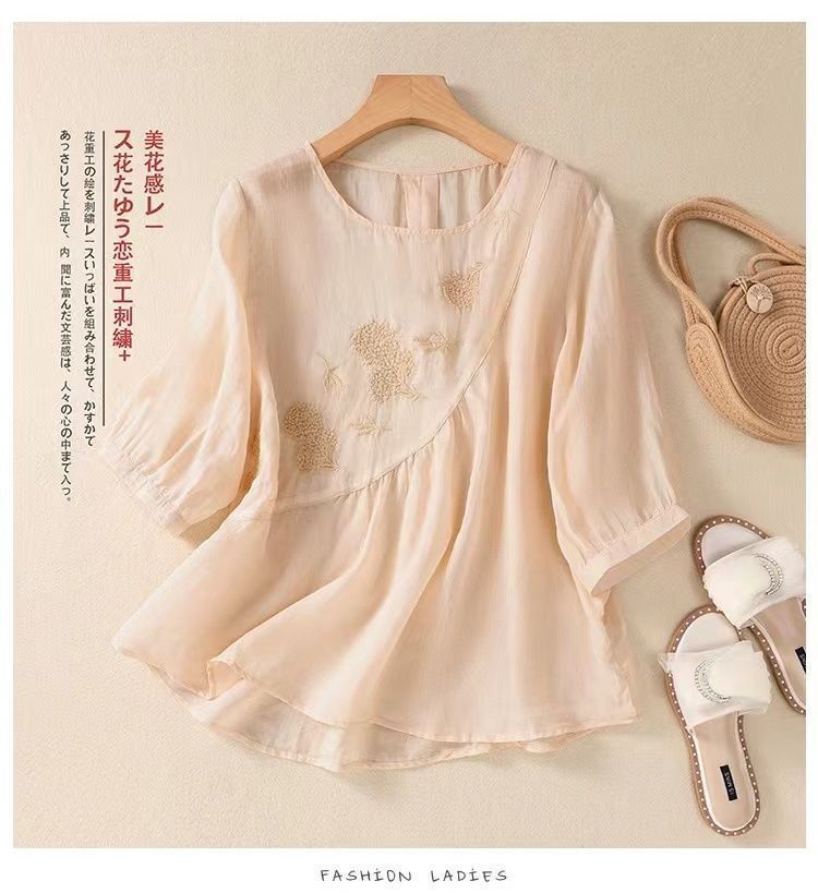 빈티지 얇은 느슨한 예술적 7 점 슬리브 2024 면 및 리넨 셔츠 라운드 넥 여름 새로운 티셔츠 슬리밍스토어 가기