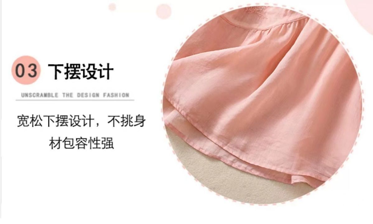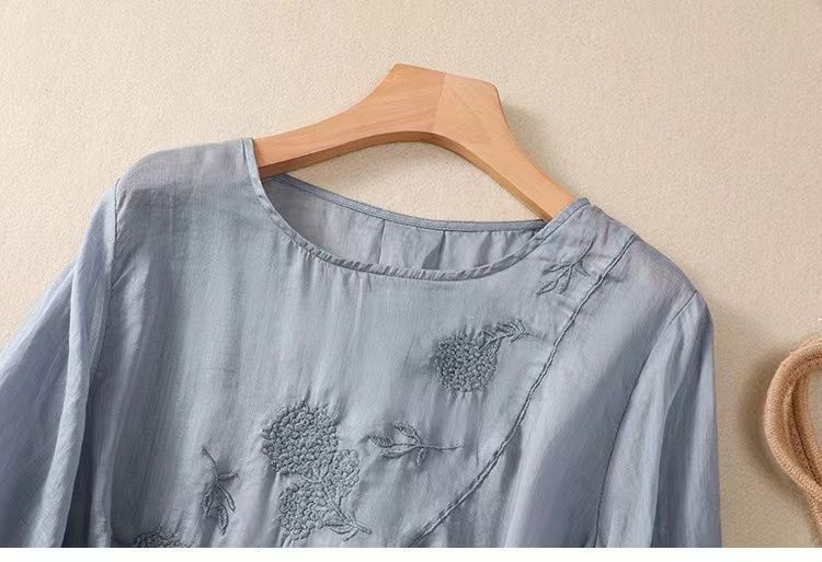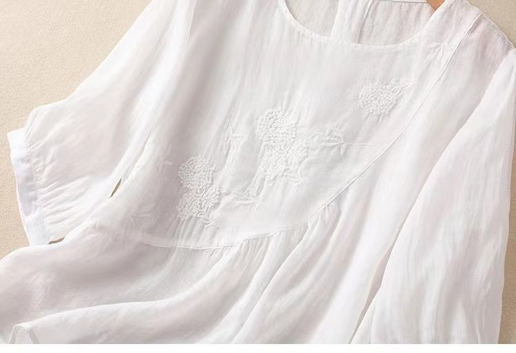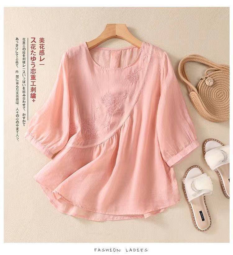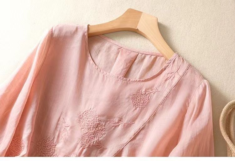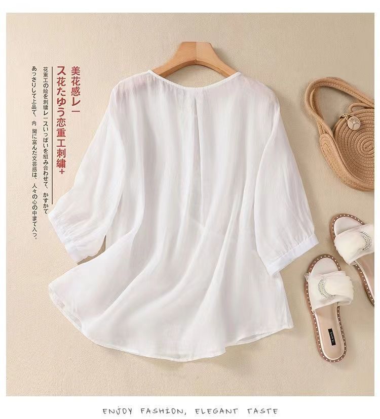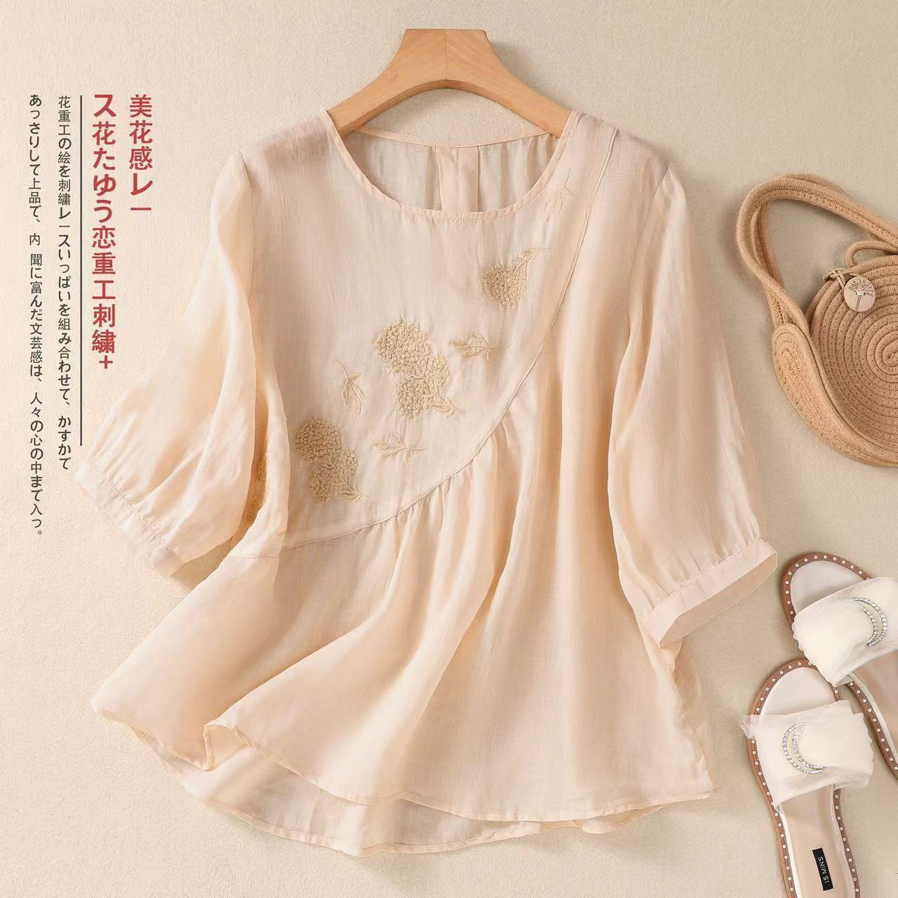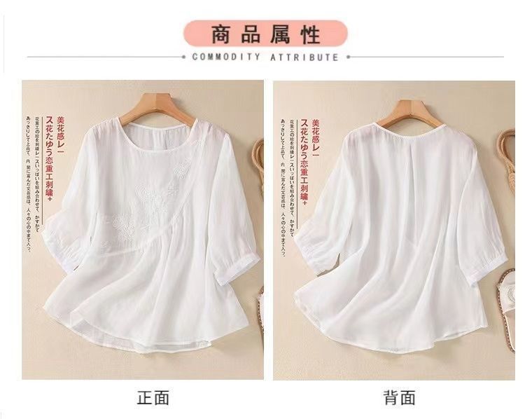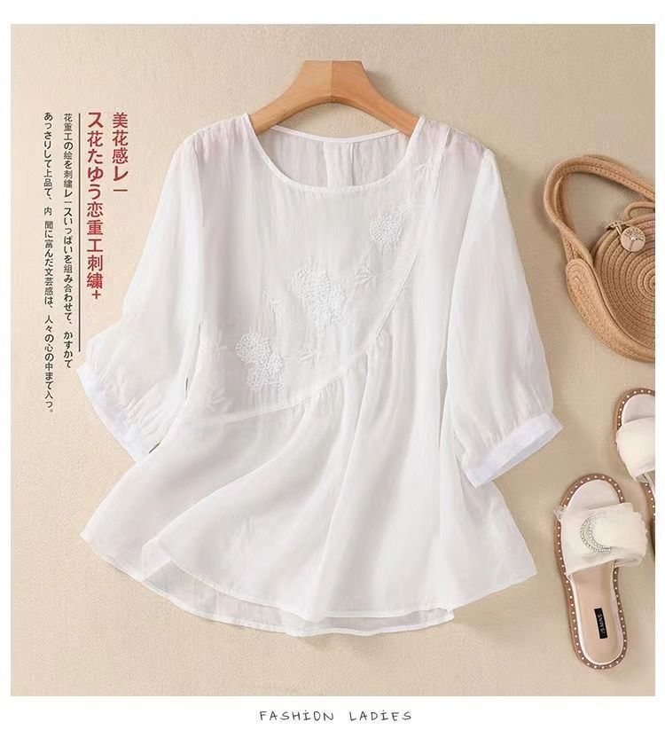 빈티지 얇은 느슨한 예술적 7 점 슬리브 2024 면 및 리넨 셔츠 라운드 넥 여름 새로운 티셔츠 슬리밍