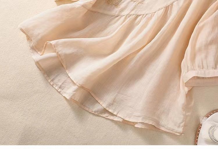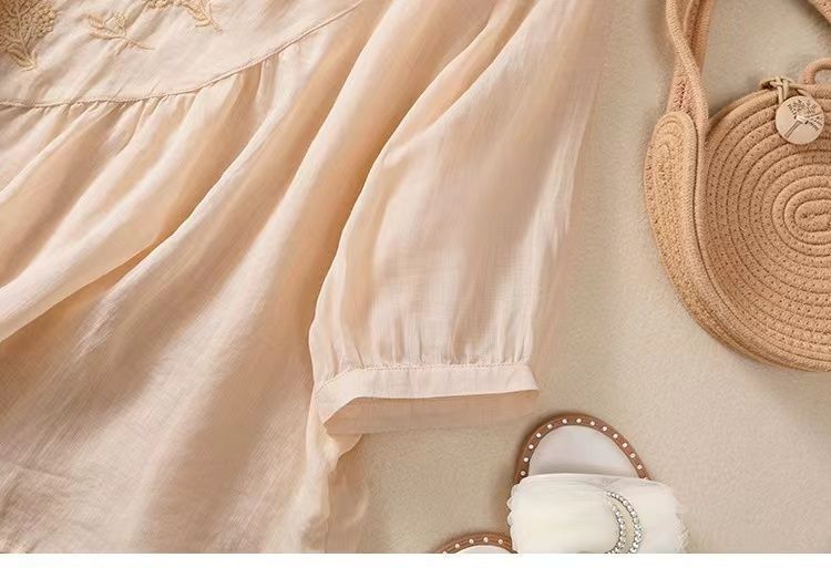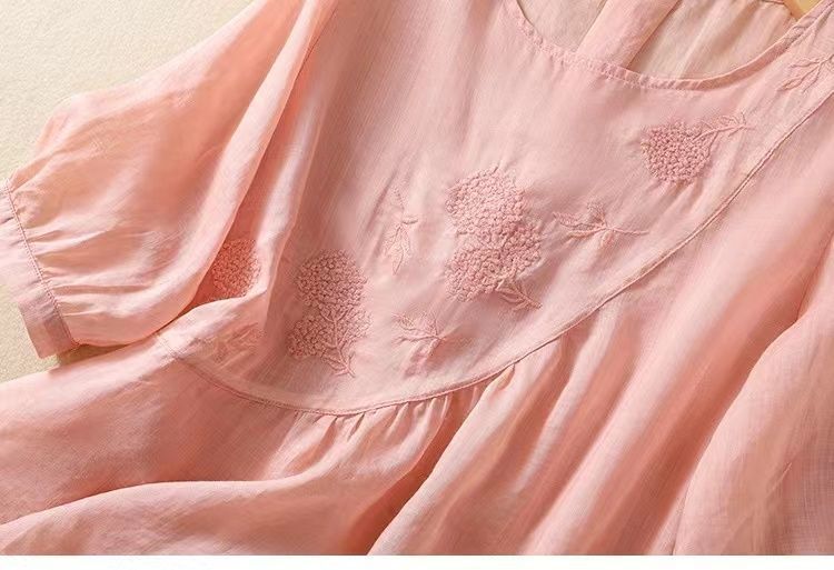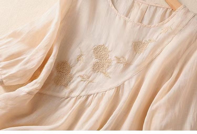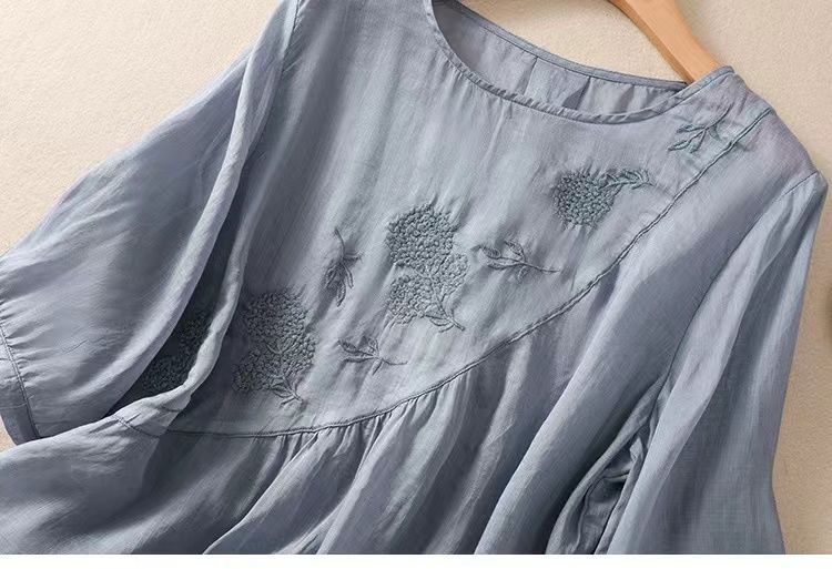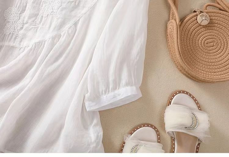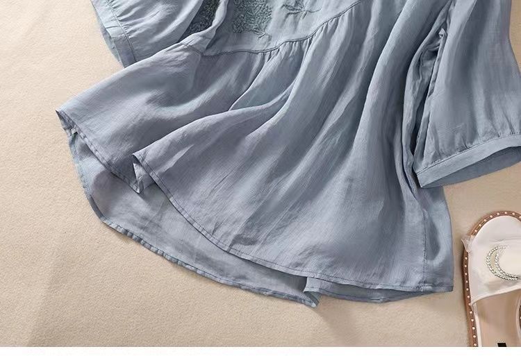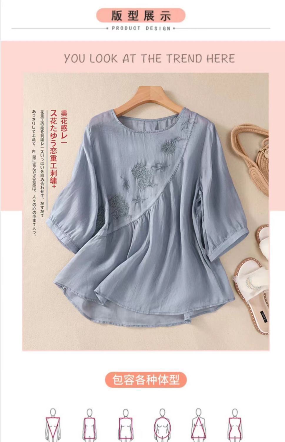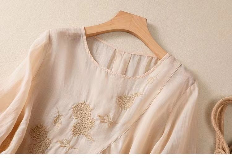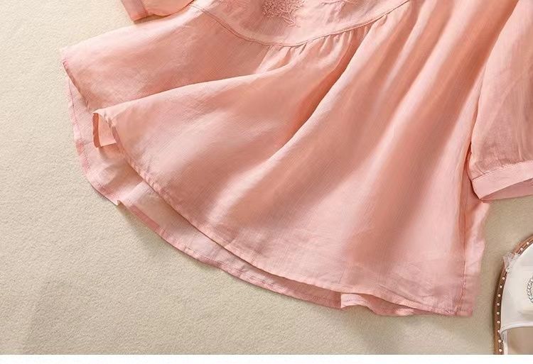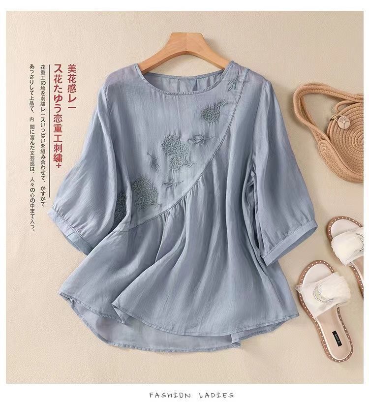 빈티지 얇은 느슨한 예술적 7 점 슬리브 2024 면 및 리넨 셔츠 라운드 넥 여름 새로운 티셔츠 슬리밍