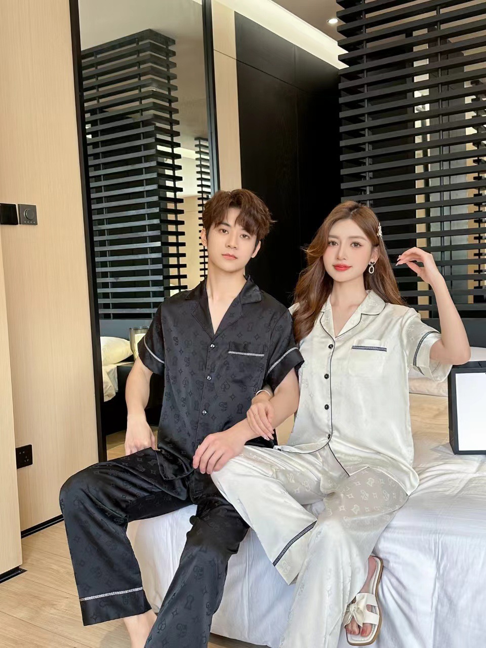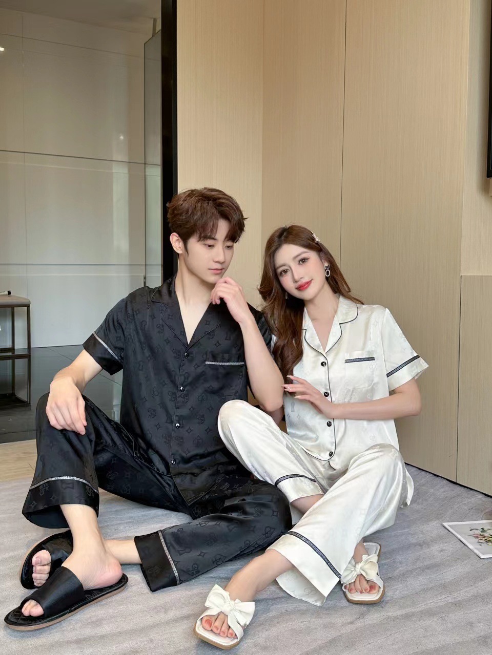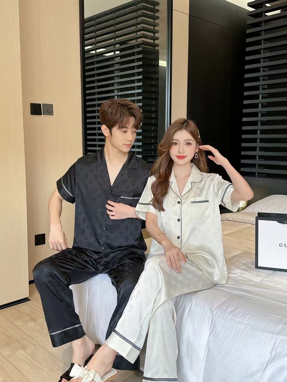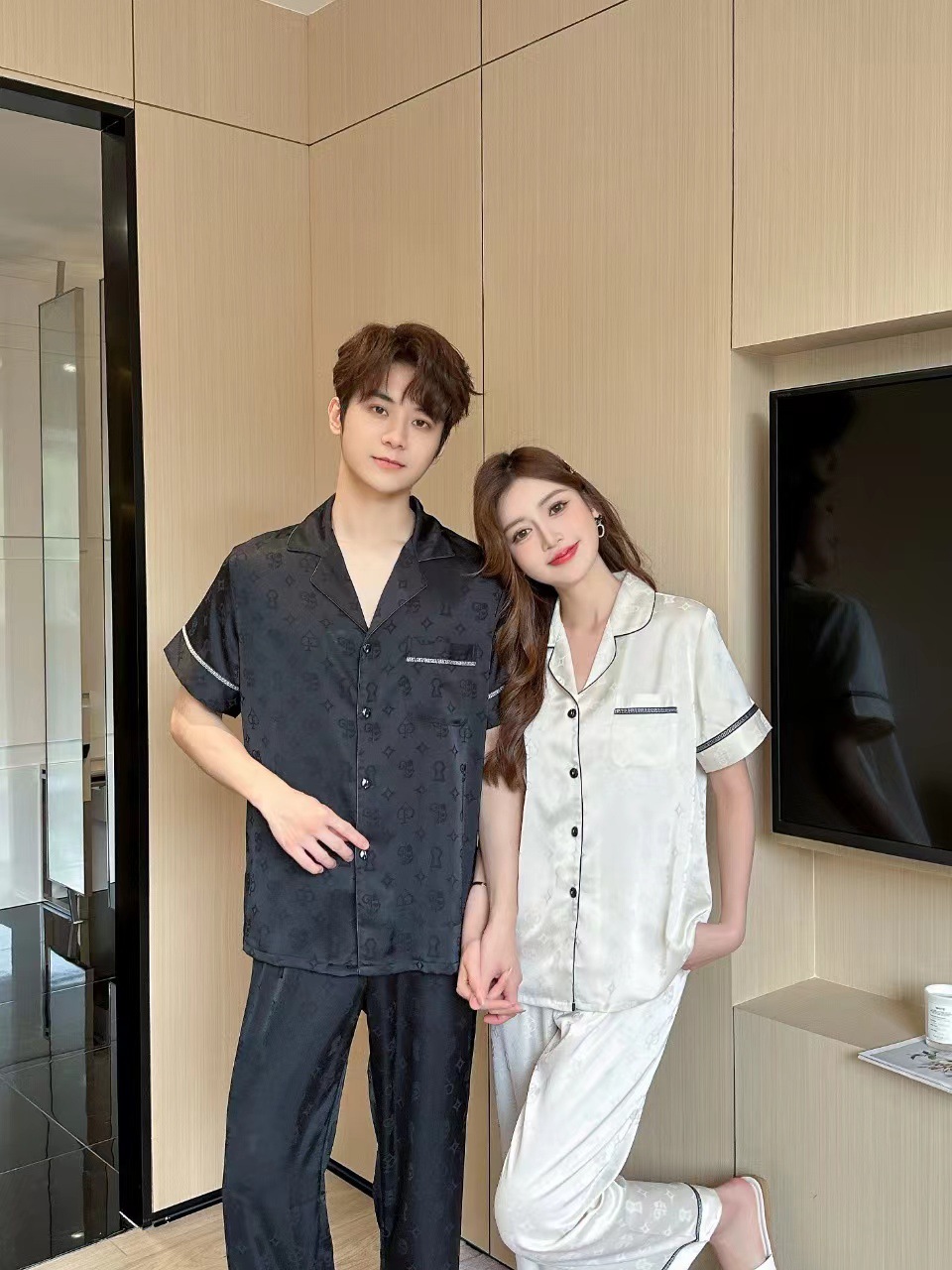 2024 년 여름 새 커플 잠옷 여자 아이스 실크 하이 엔드 남자 느슨한 반팔 바지 세트 홈 옷