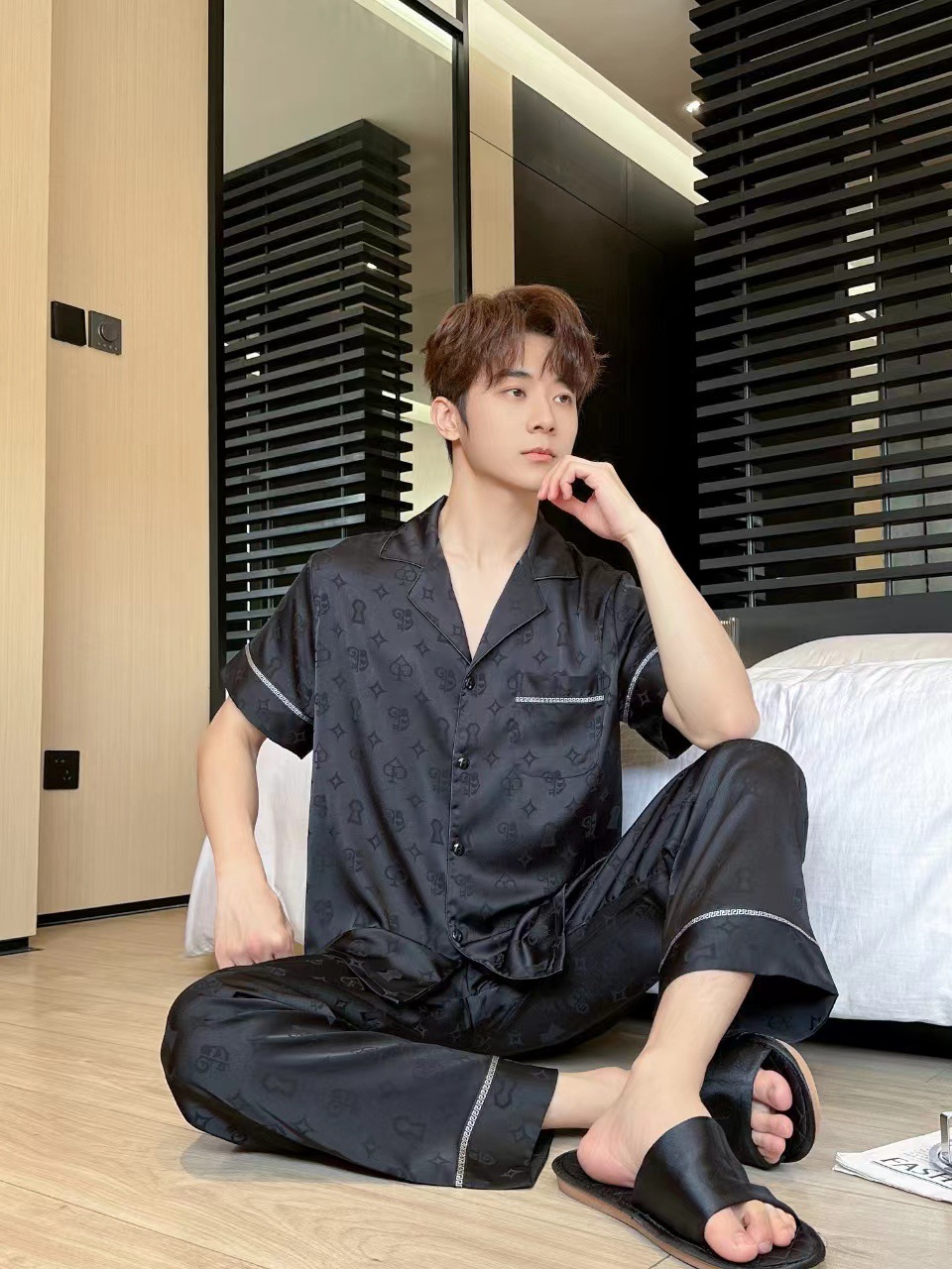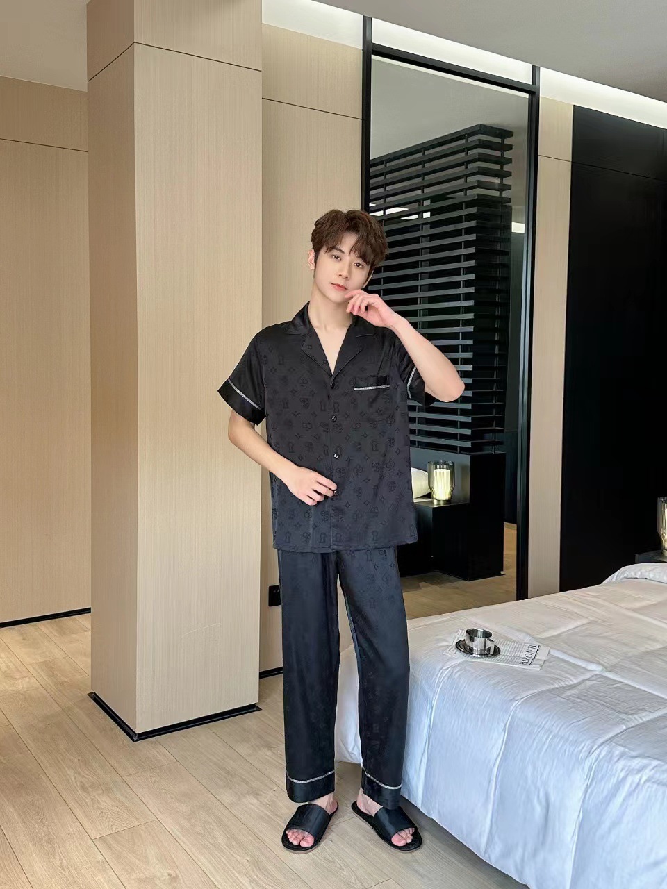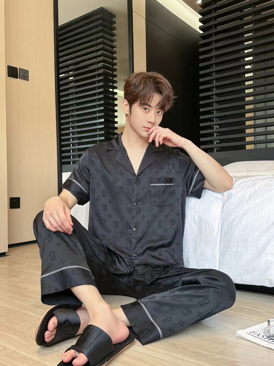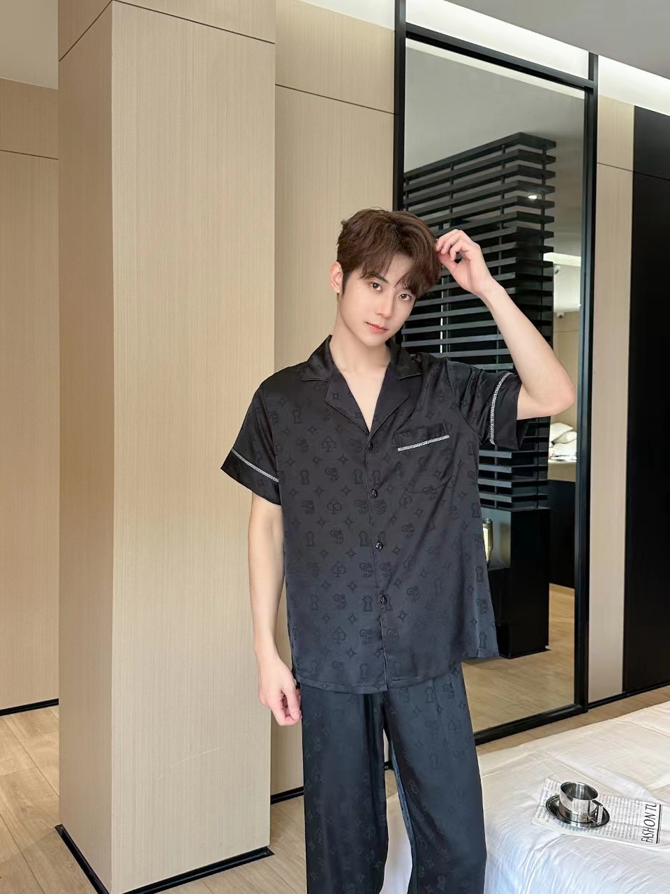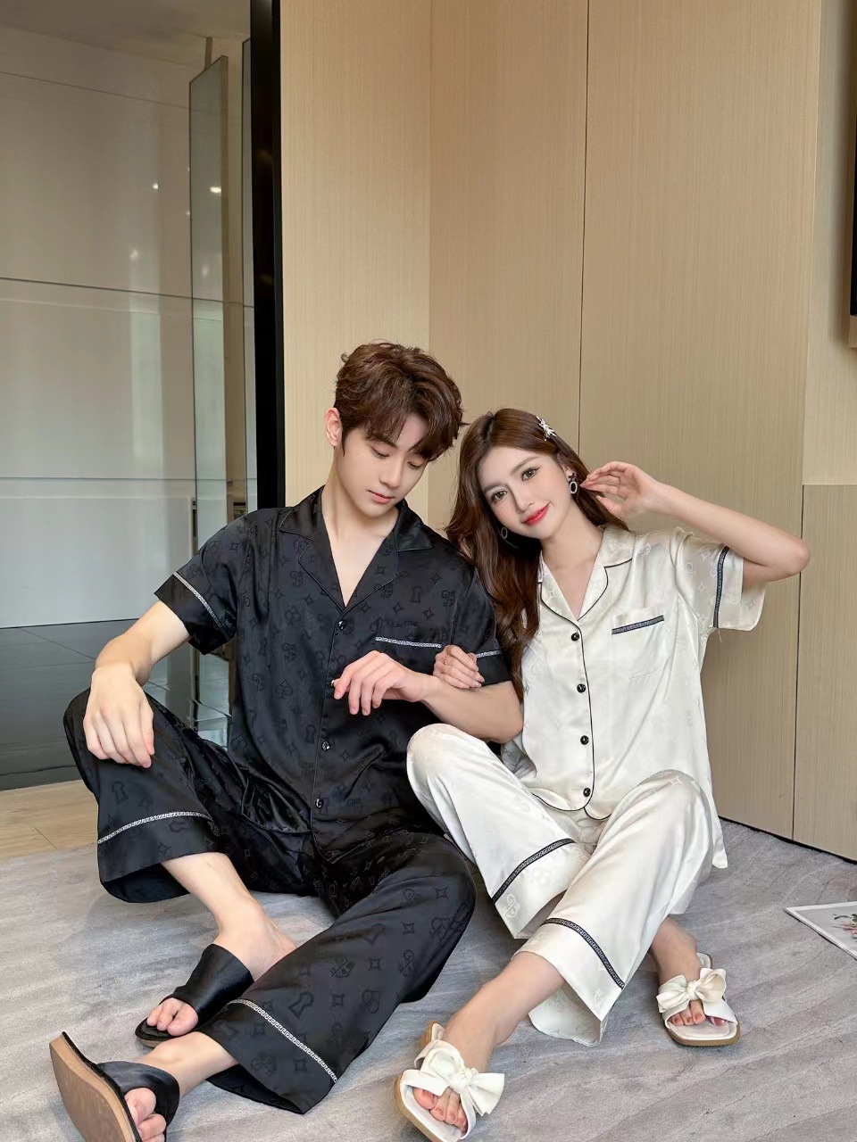 2024 년 여름 새 커플 잠옷 여자 아이스 실크 하이 엔드 남자 느슨한 반팔 바지 세트 홈 옷