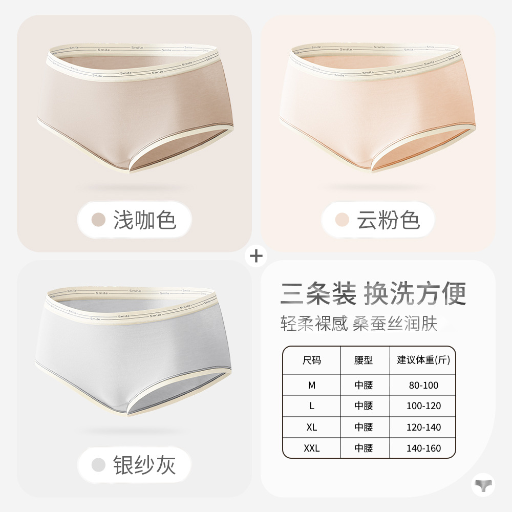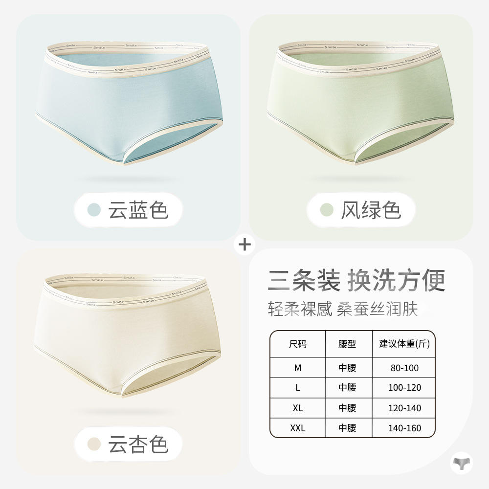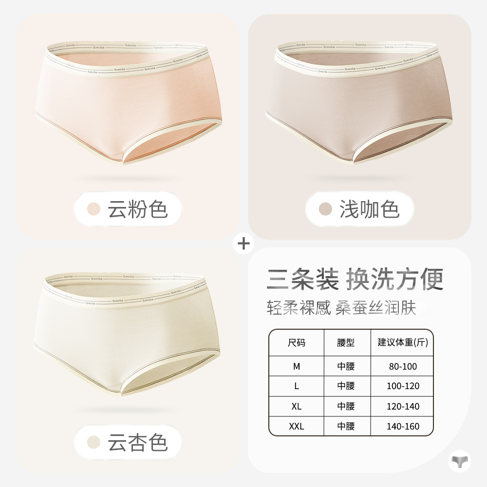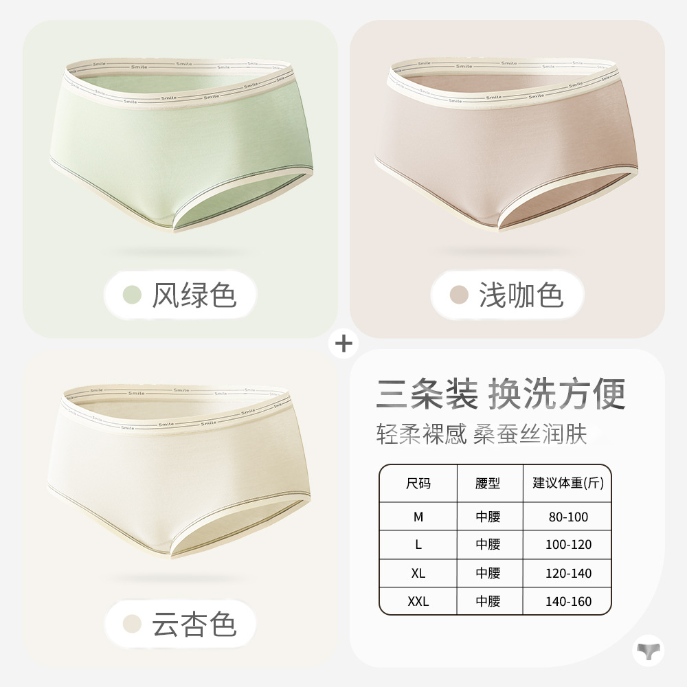 女士纯棉内裤女桑蚕丝抗菌裆大码中腰透气纯色三角短舒适无痕裤头