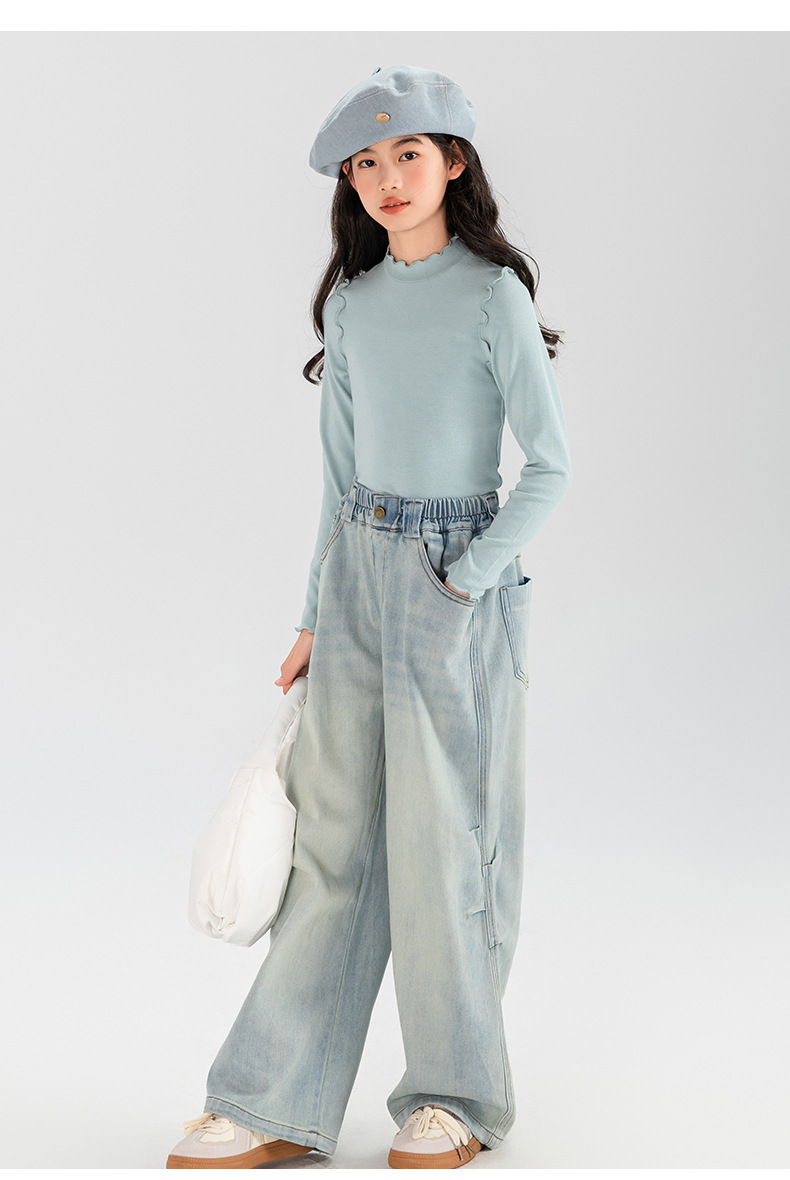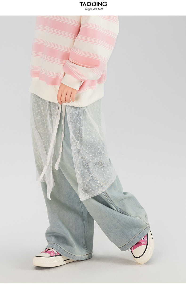 타오딩 여아 데님 팬츠 연한 색상 레트로 봄 가을 신상 중대형 여아 캐주얼 만능 주름 스트레이트 팬츠
