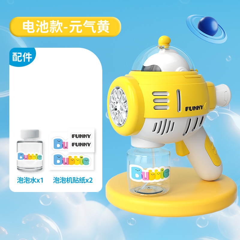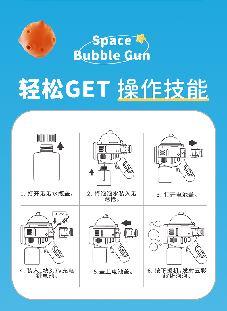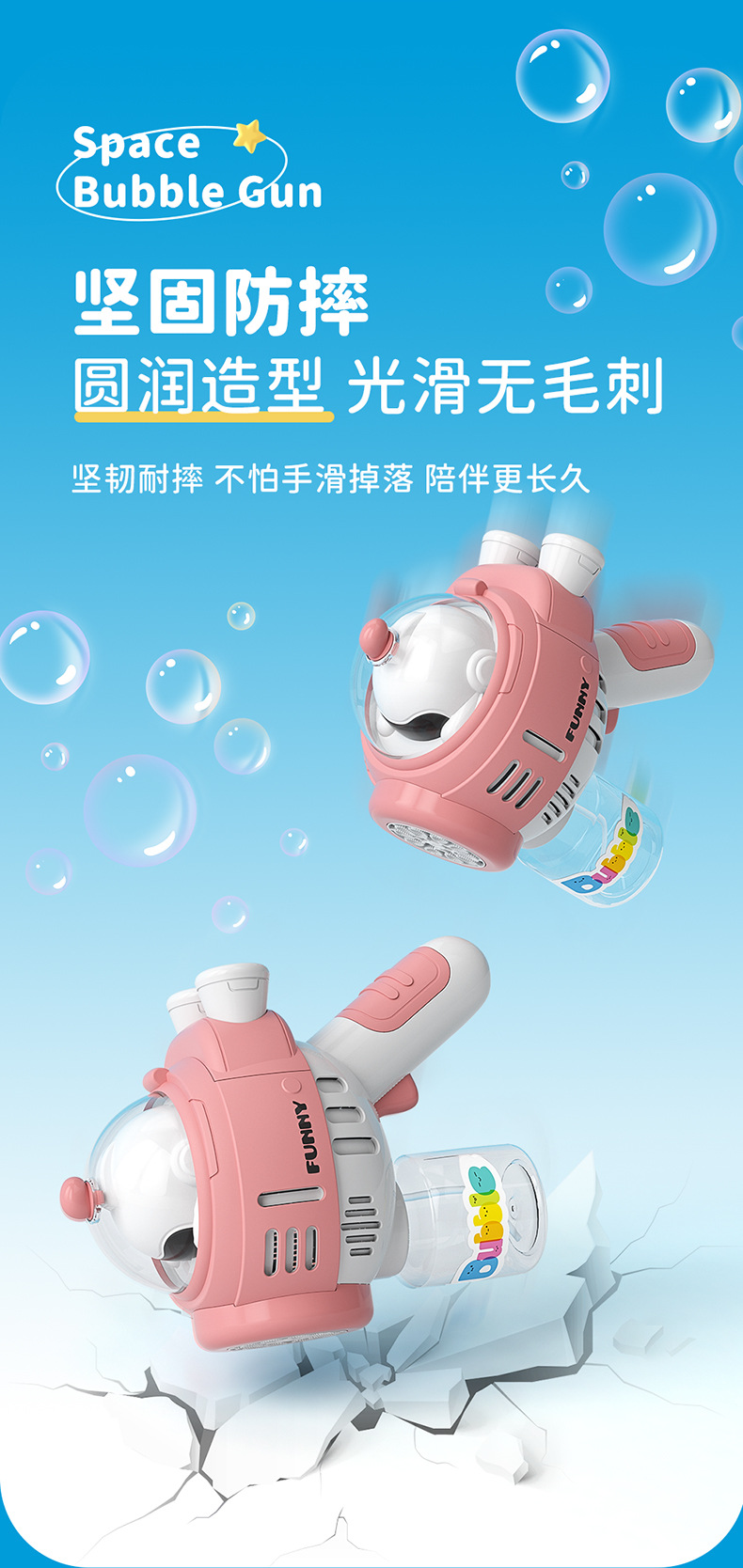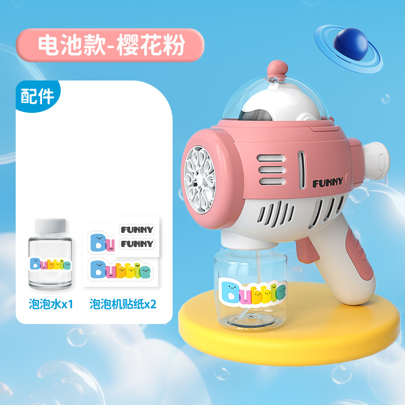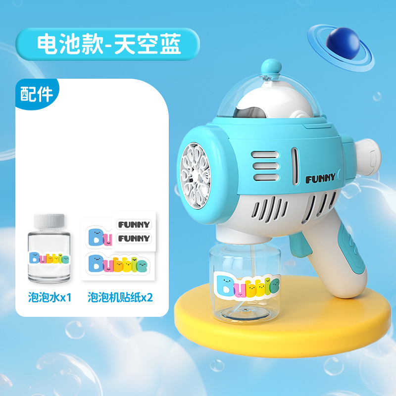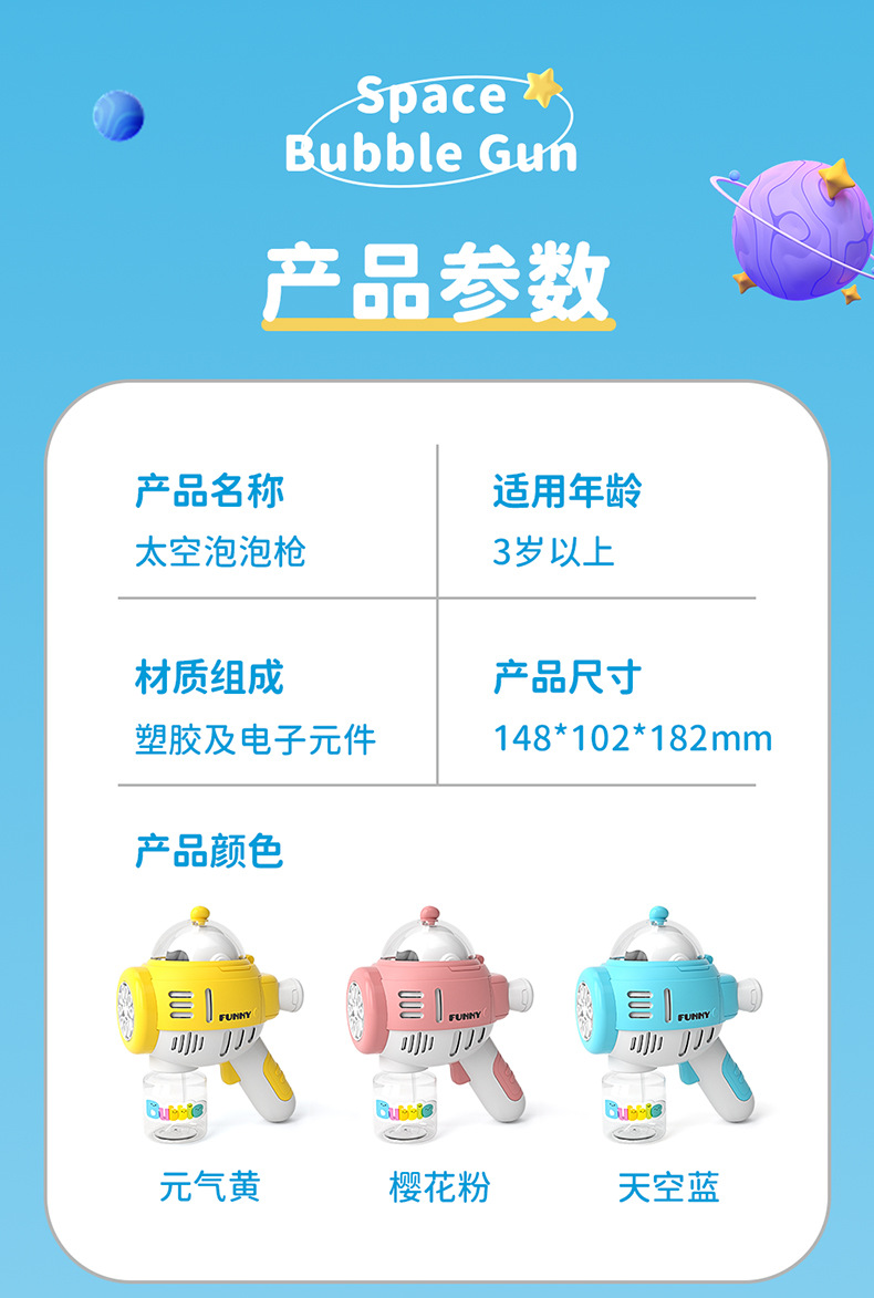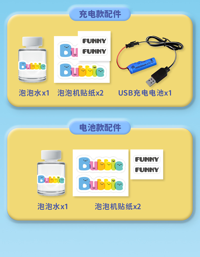 【配置】:电池款:泡泡水*1,泡泡机贴纸*2(无包电);充电款:锂电池充电套装,泡泡水*1,泡泡机贴纸*2