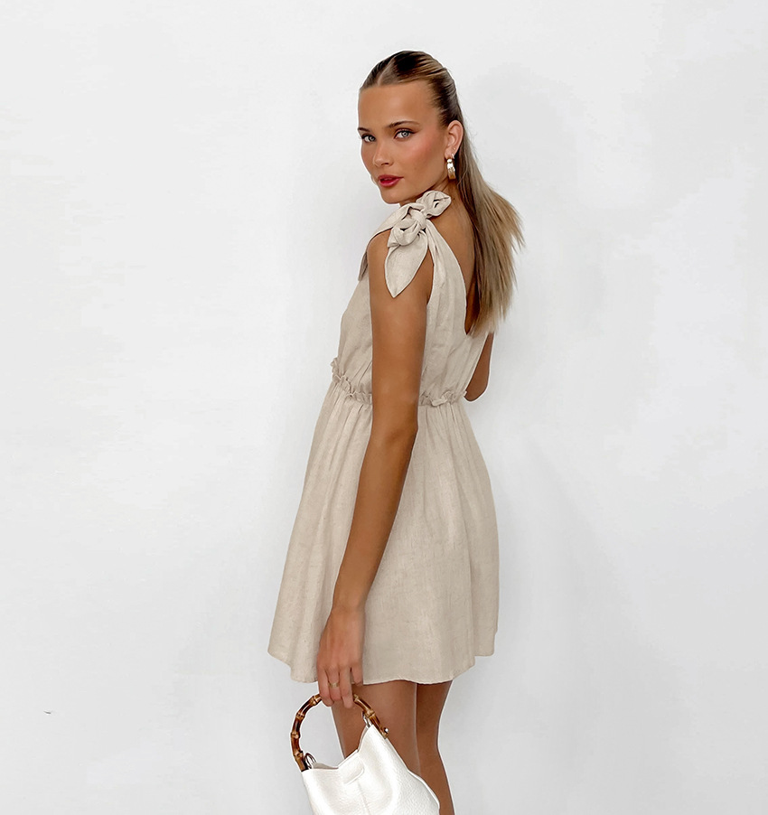 프랑스 카키 면화 및 리넨 V-넥 어깨 스트랩 높은 허리 풀오버 원피스 2024 유럽과 미국의 봄 패션 새로운 여성 의류스토어 가기