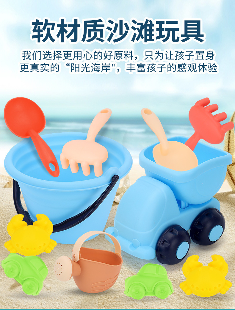 • [6 조각 세트] 부드러운 고무 블루 버킷 비치 세트