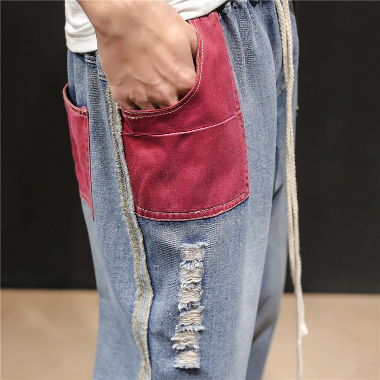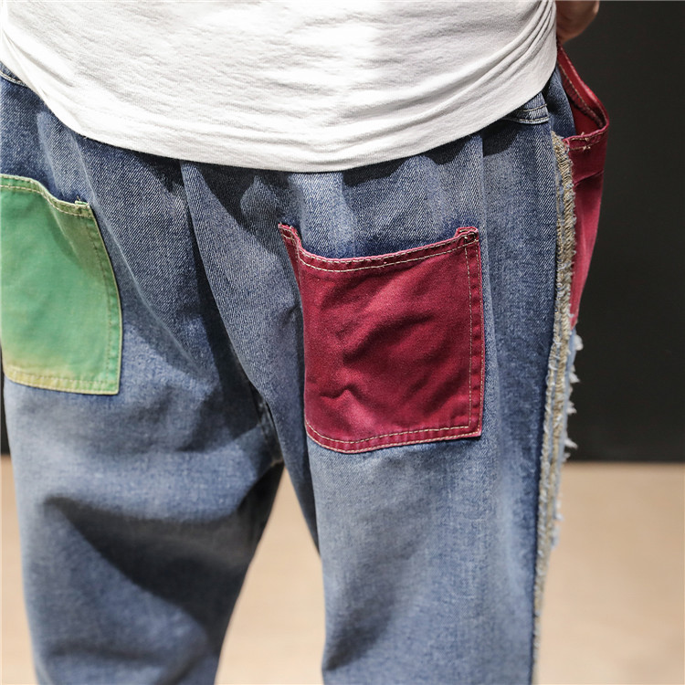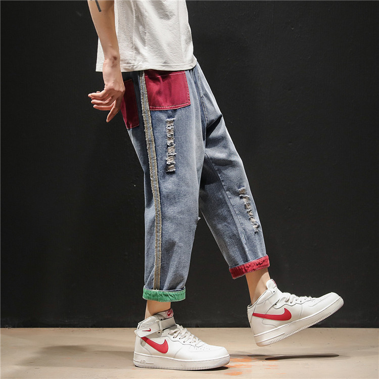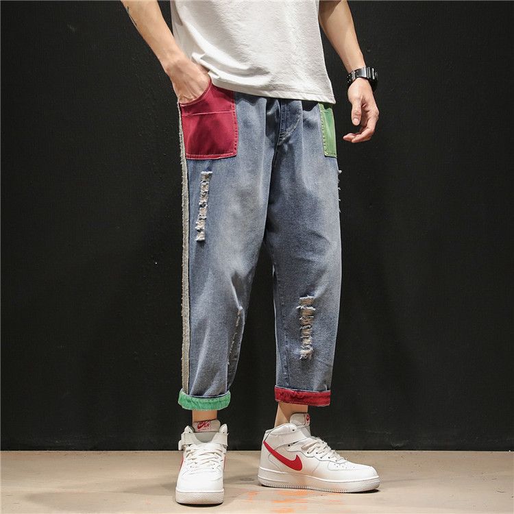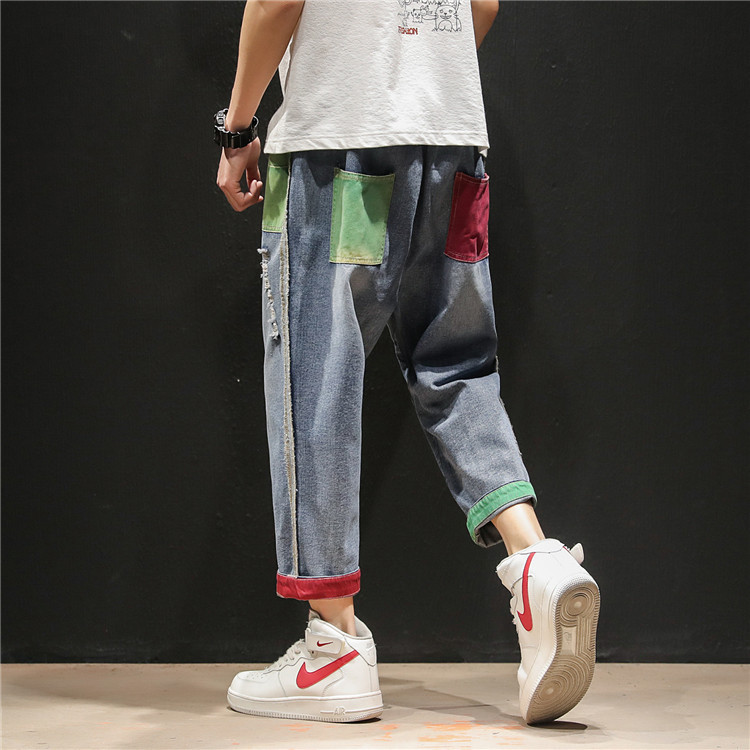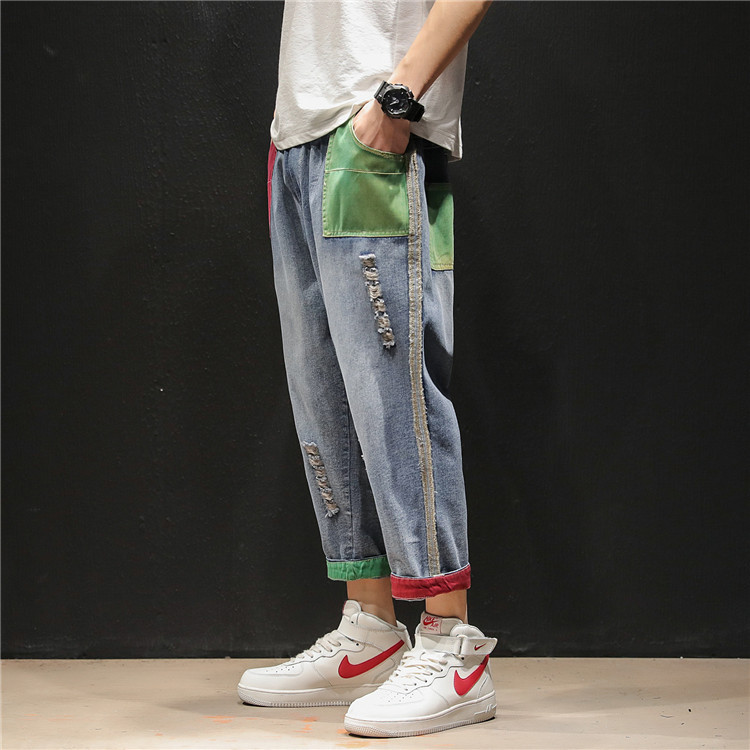 젊은 트렌드 브랜드 봄 여름 신상 남성복 패치워크 데님 9부 팬츠 남성용 큰 사이즈 컬러 블록 데미지 하렘 팬츠 슬림핏 팬츠스토어 가기