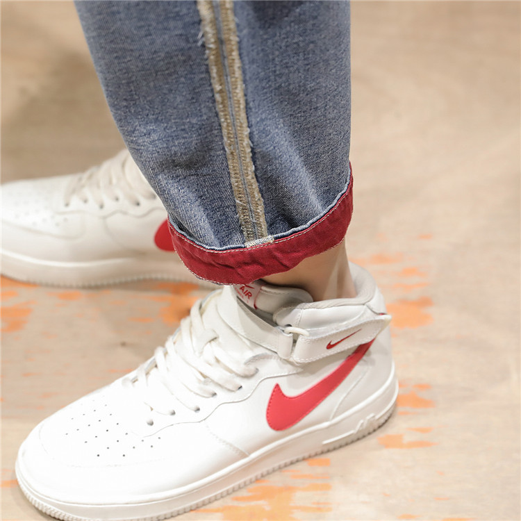 젊은 트렌드 브랜드 봄 여름 신상 남성복 패치워크 데님 9부 팬츠 남성용 큰 사이즈 컬러 블록 데미지 하렘 팬츠 슬림핏 팬츠