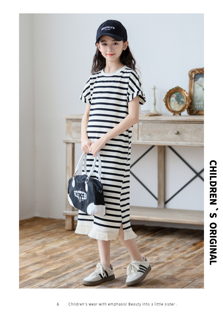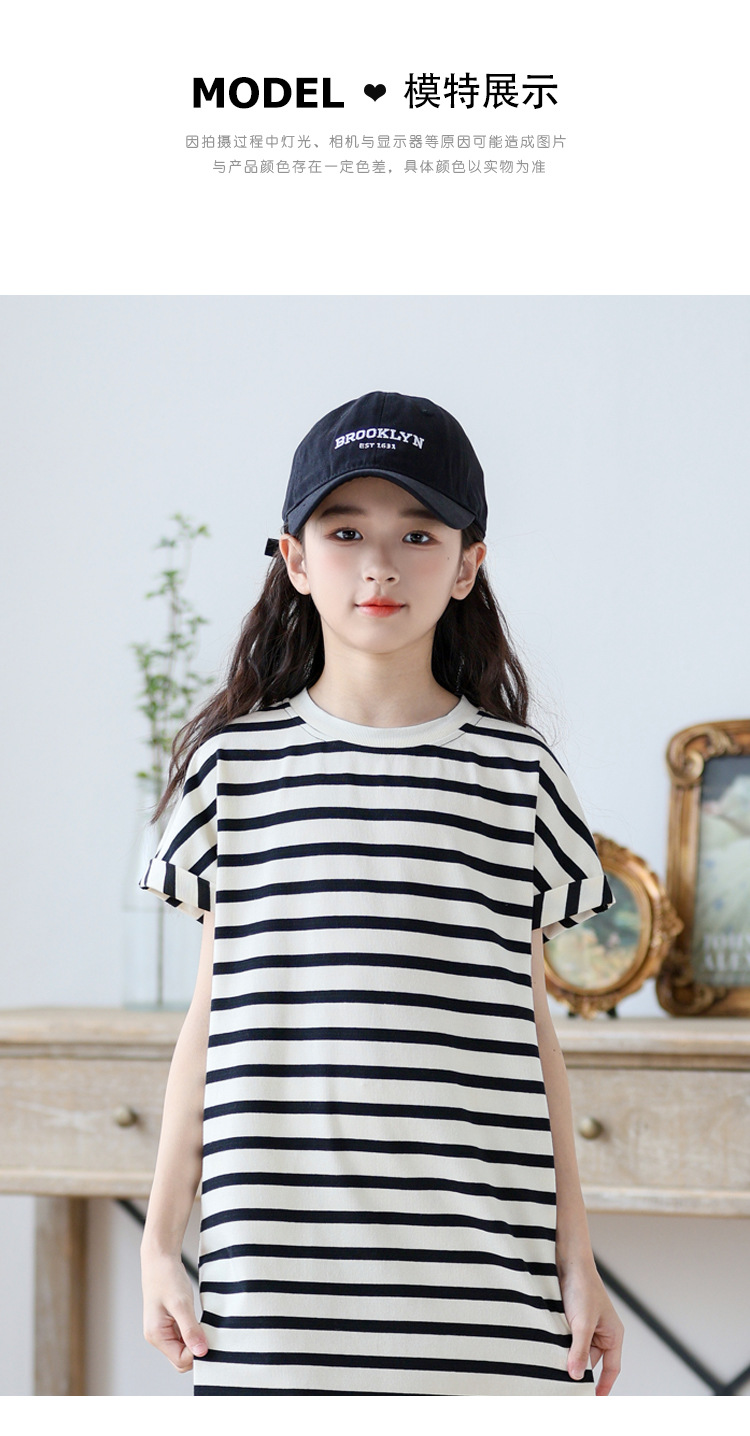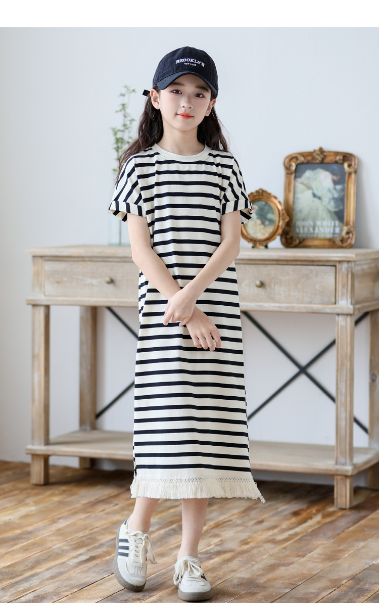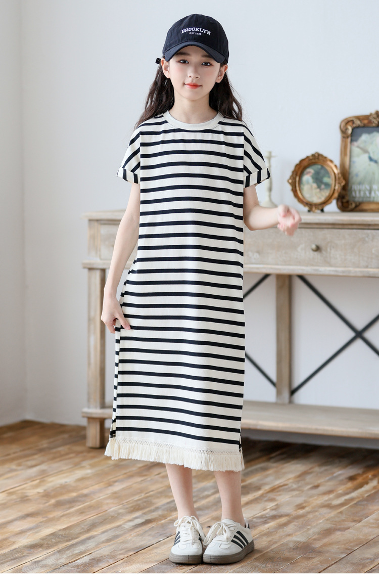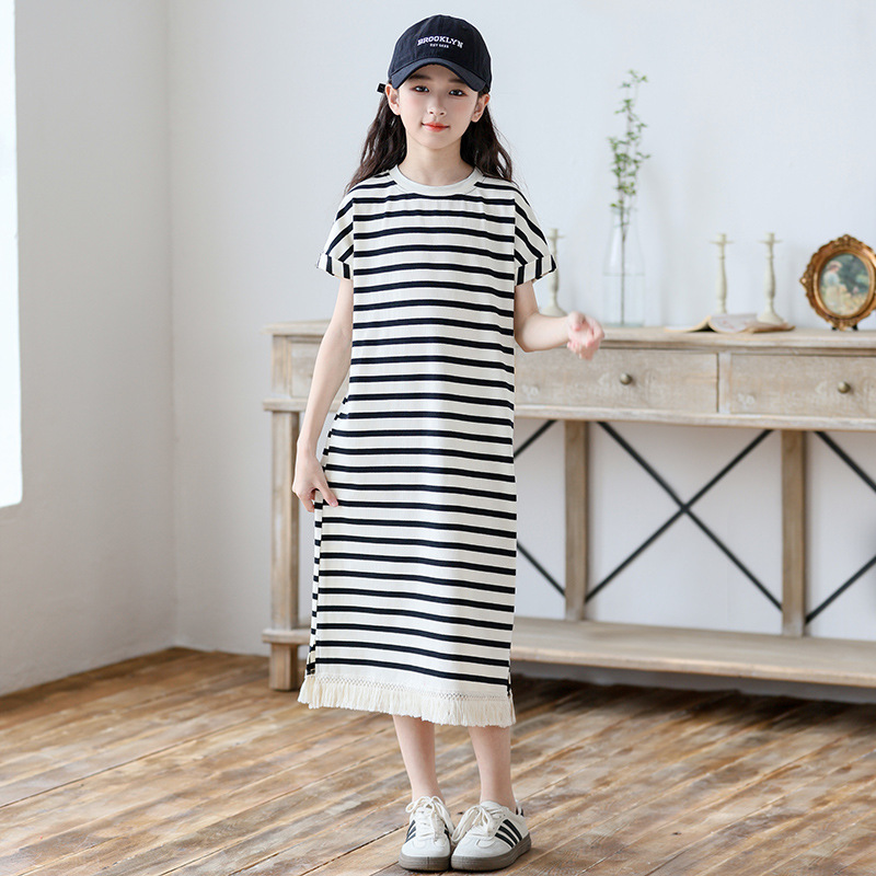 새끼 소녀 원피스 여름 느슨한 줄무늬 티셔츠 치마 2024 새로운 여자 휴일 치마스토어 가기