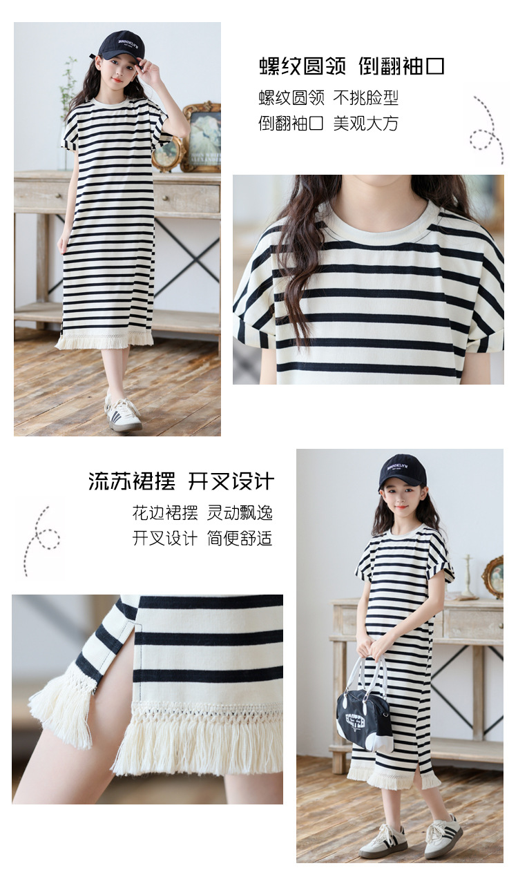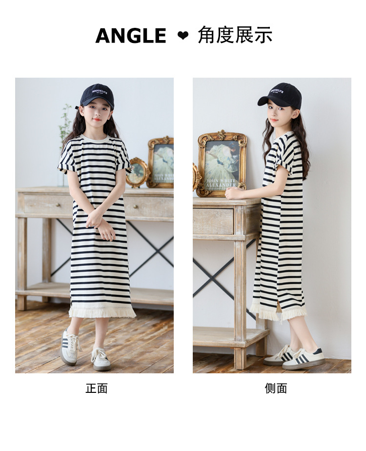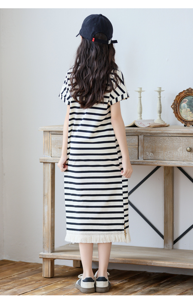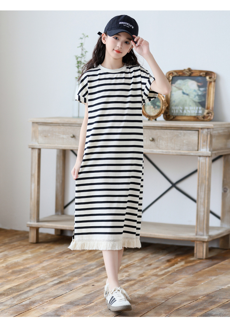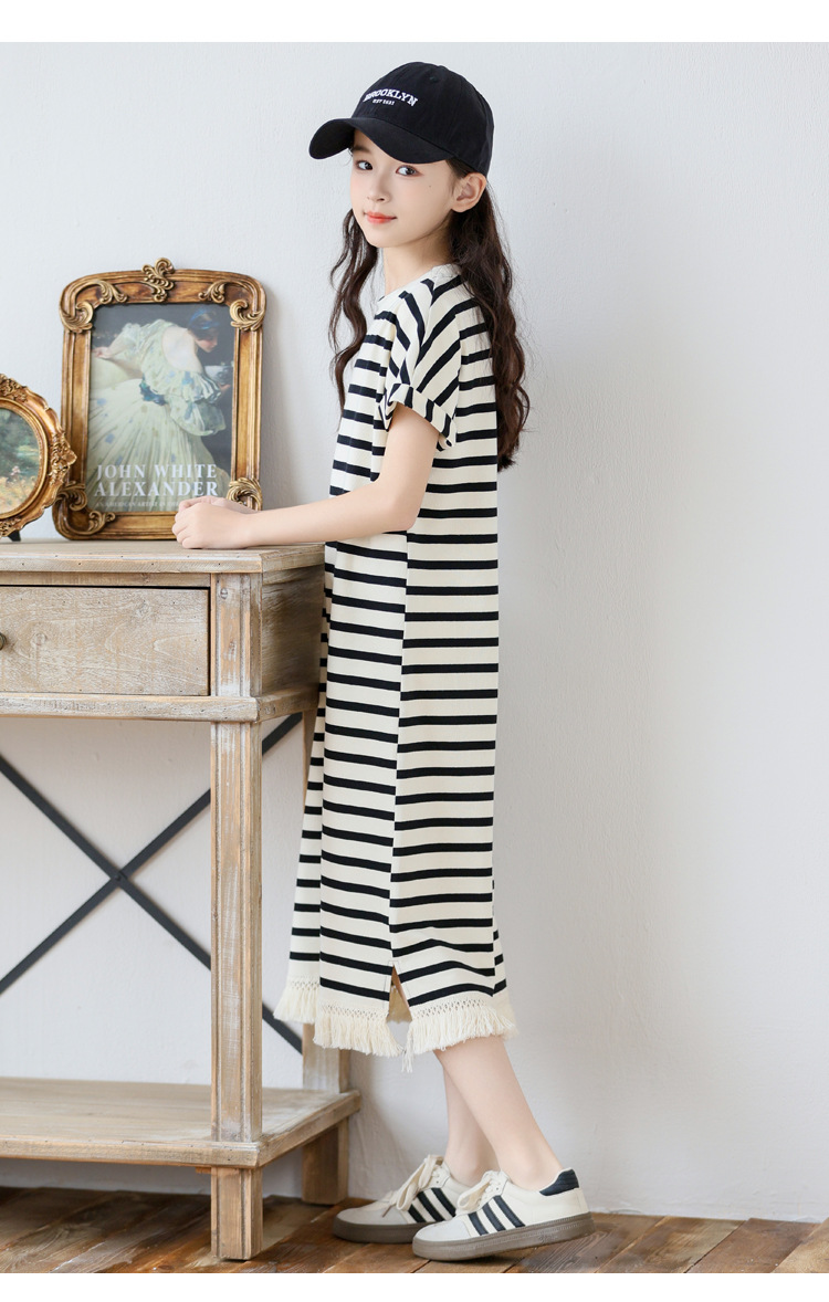 새끼 소녀 원피스 여름 느슨한 줄무늬 티셔츠 치마 2024 새로운 여자 휴일 치마스토어 가기