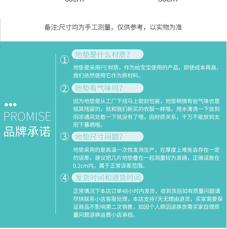 关于味道:本产品是高温发泡的,产品生产出来稍微有一点味道是属于正常现象的,是新料味,不影响使用,收到产品以后建议清洗一下,通通风晾干再使用味道会逐渐消除!
