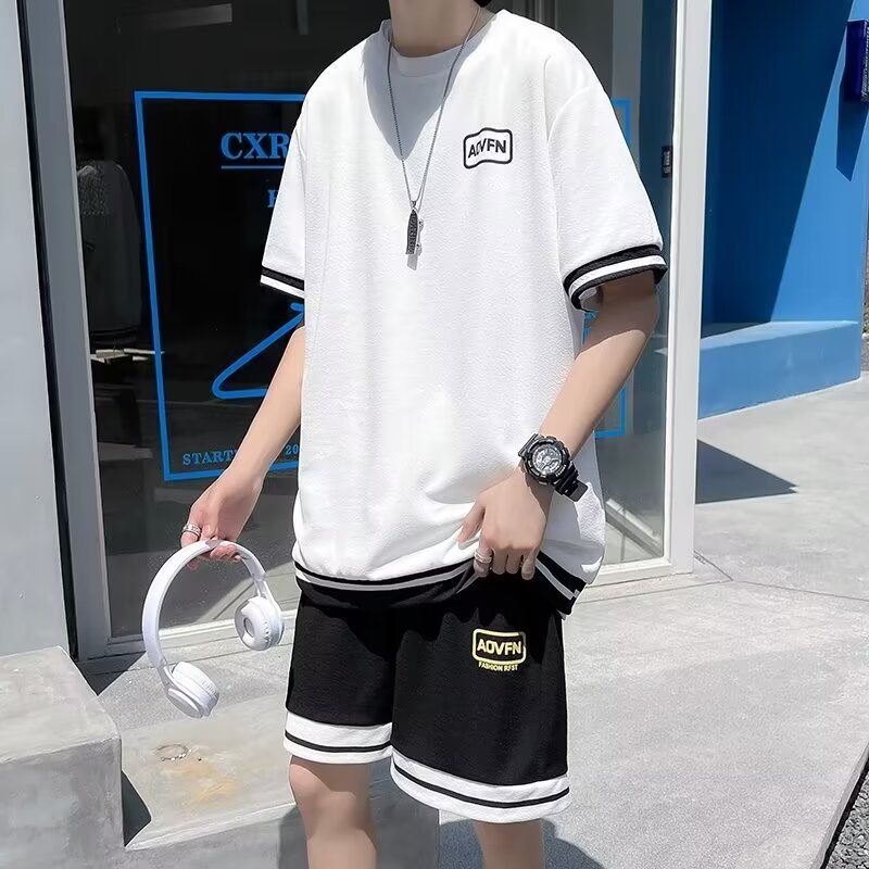 반팔 티셔츠 남자 여름 스포츠 세트 느슨한 유행 캐주얼 반바지 10 대를위한 여름 세트스토어 가기
