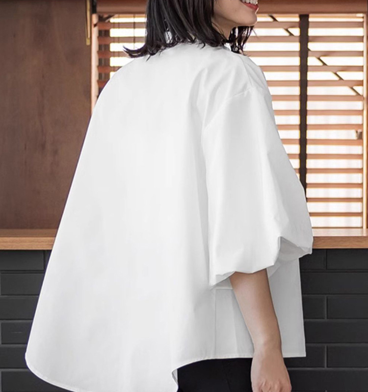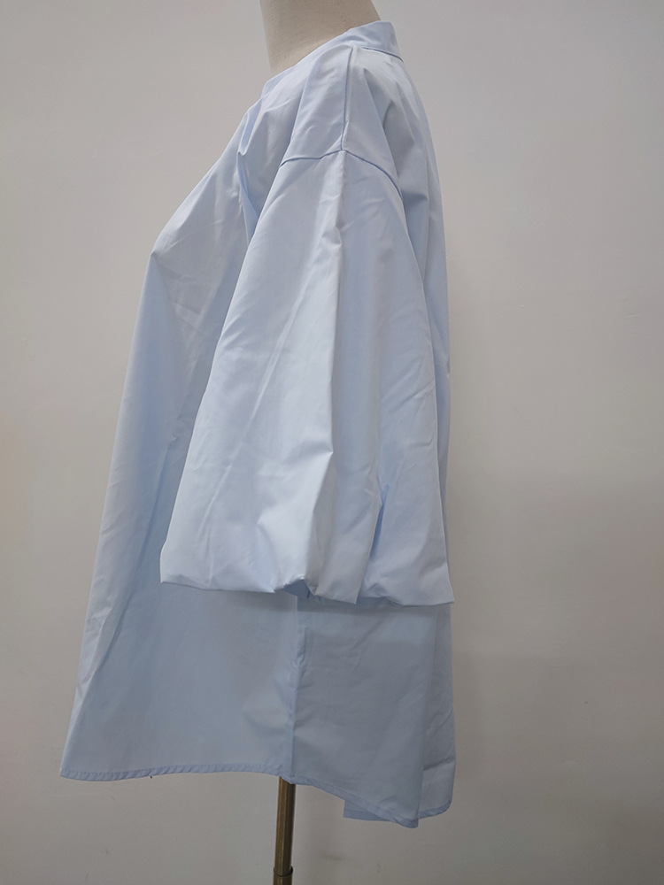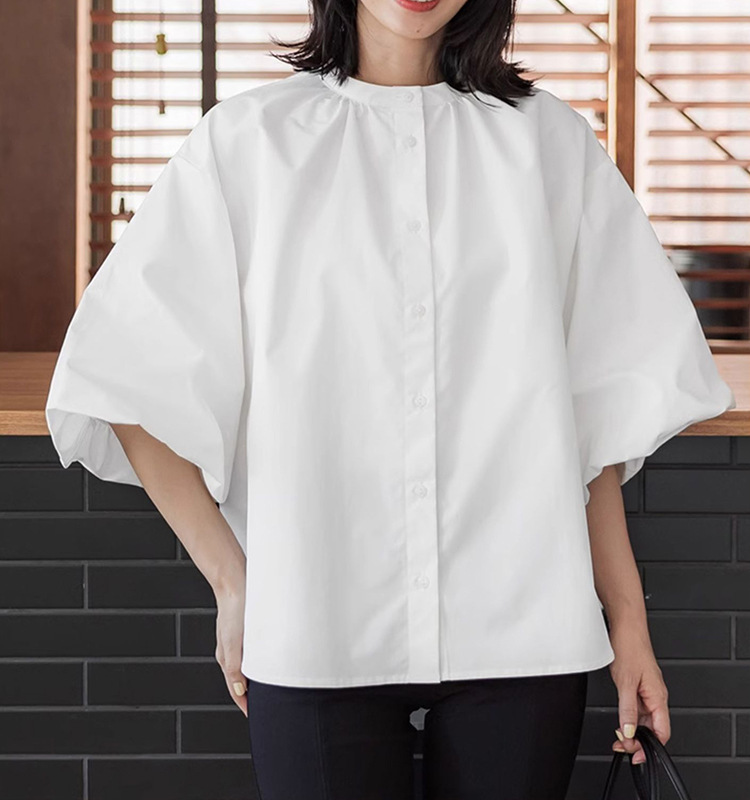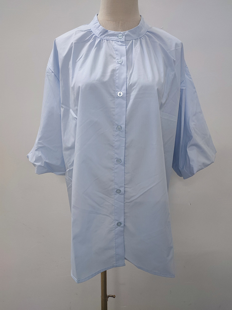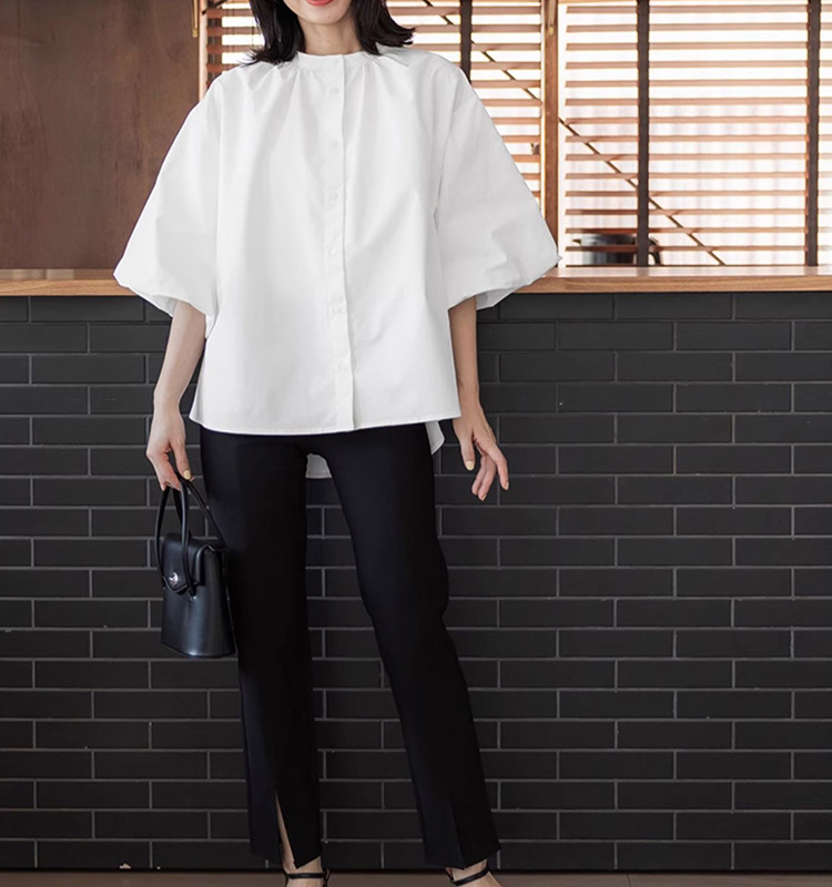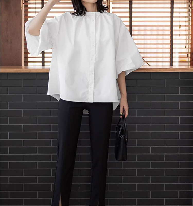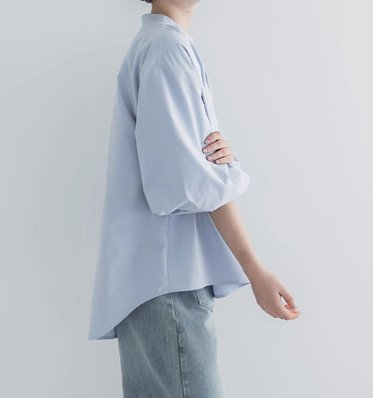 일본과 한국 스타일 여름 간단한 느슨한 슬림 룩 하프 하이 칼라 세븐 포인트 소매 단색 풀오버 시폰 셔츠 탑