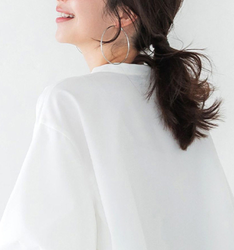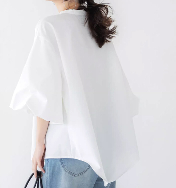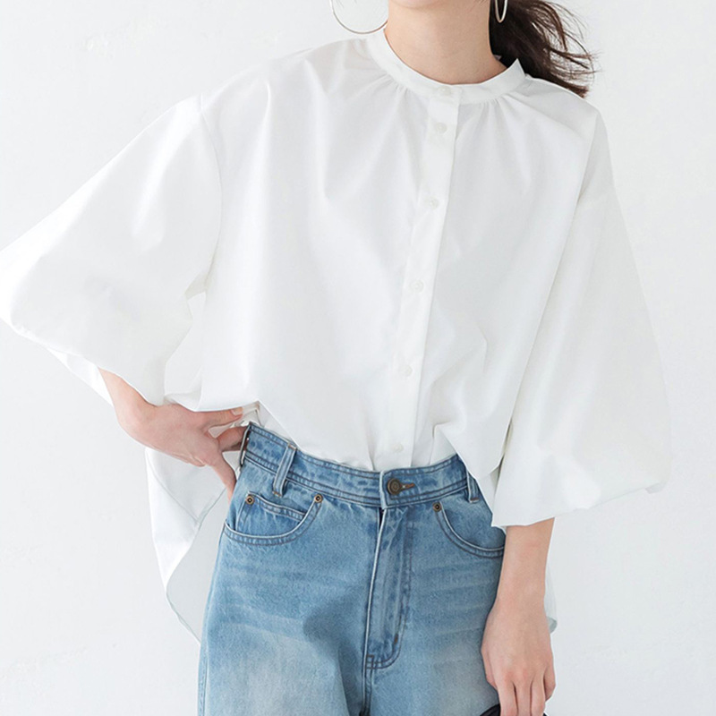 일본과 한국 스타일 여름 간단한 느슨한 슬림 룩 하프 하이 칼라 세븐 포인트 소매 단색 풀오버 시폰 셔츠 탑스토어 가기