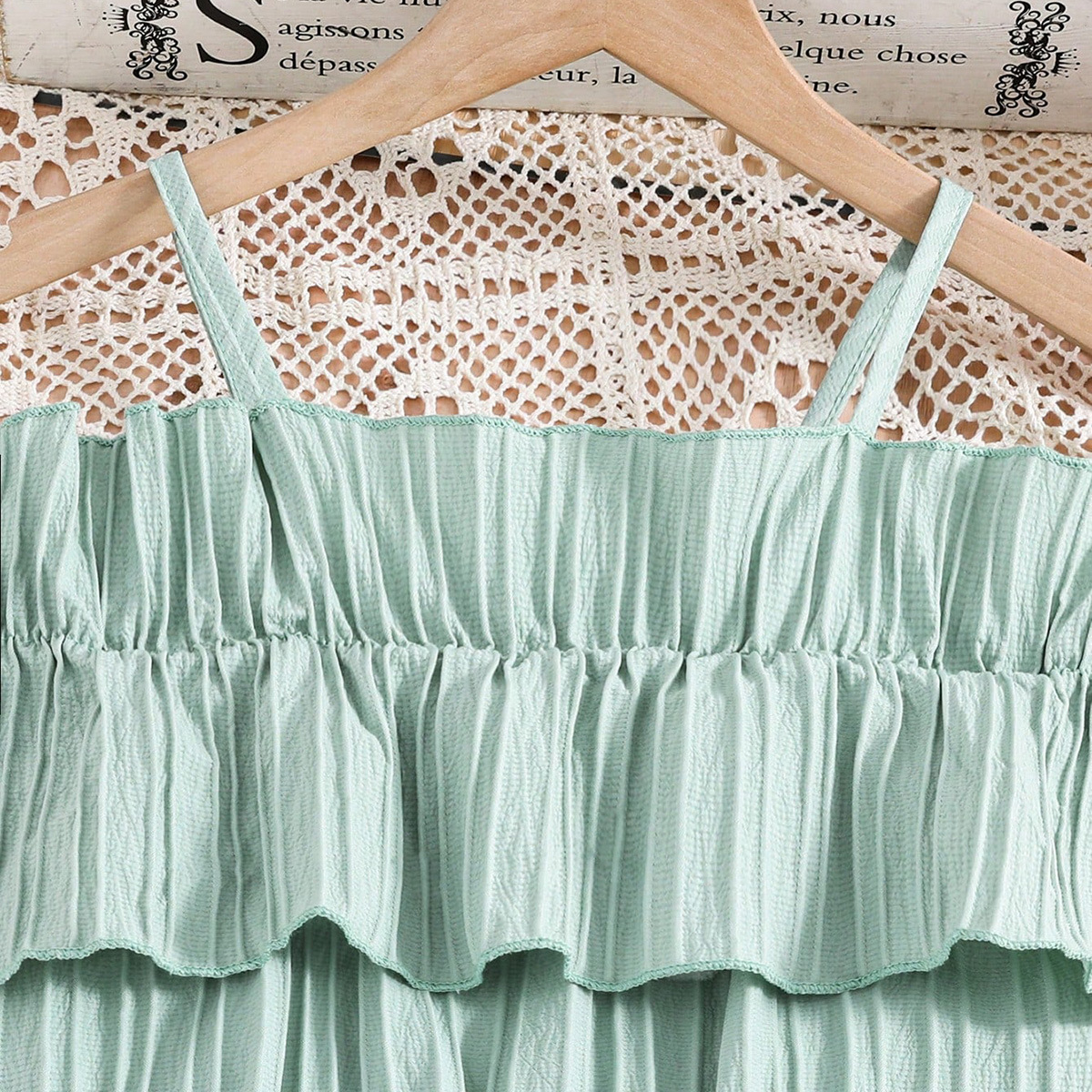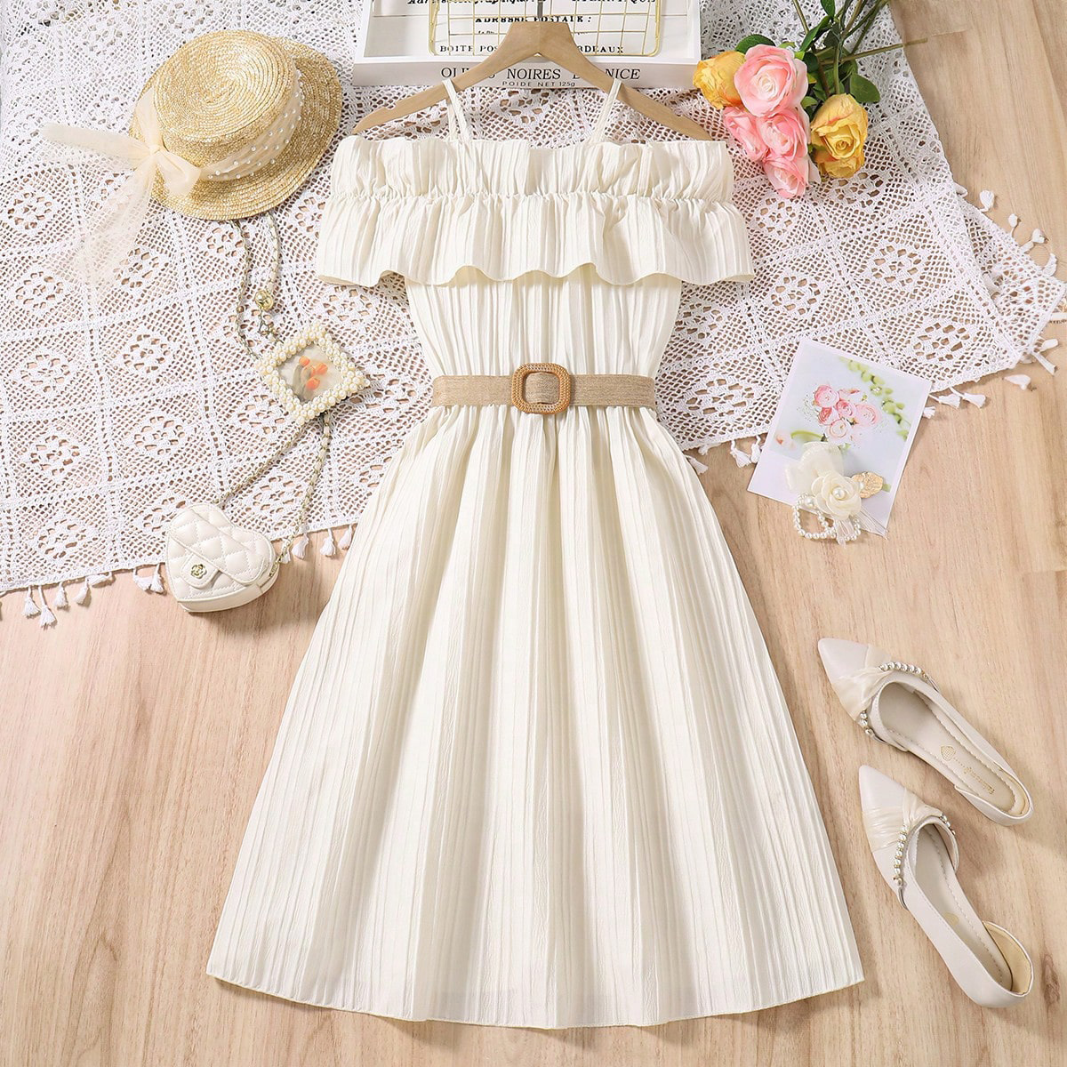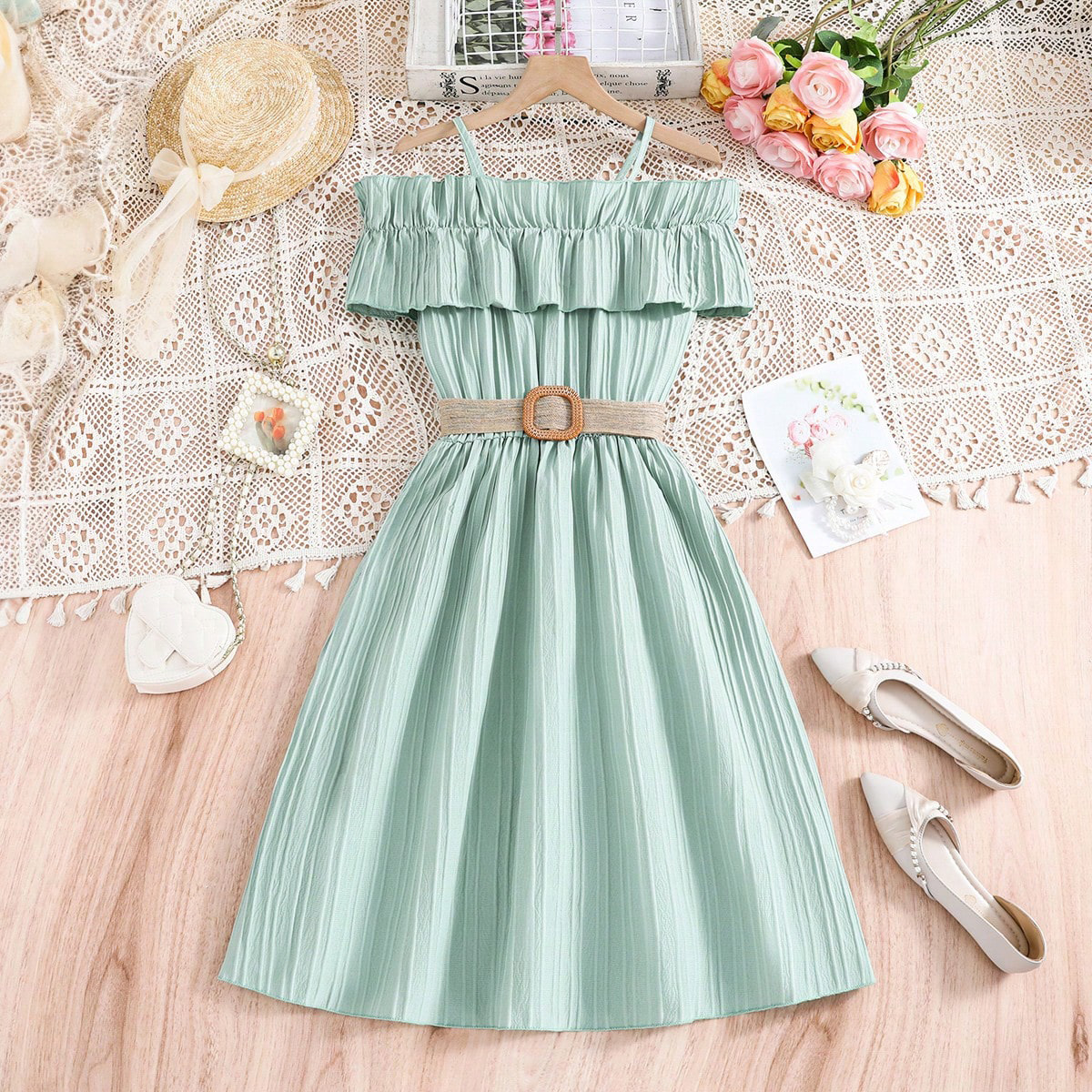 女童裙子夏季外贸款欧美一字肩吊带拼接花边洋气青少年连衣裙批发